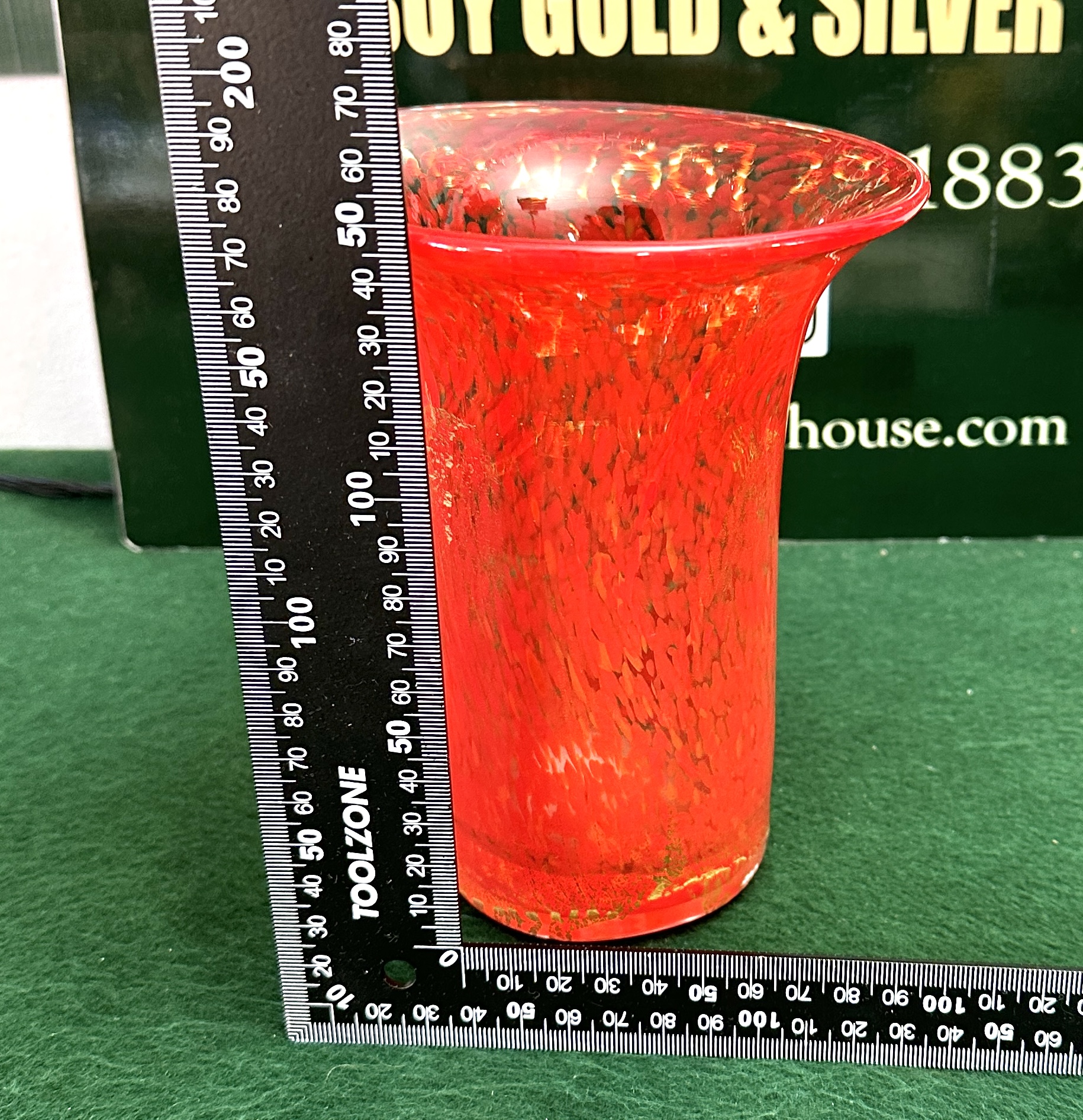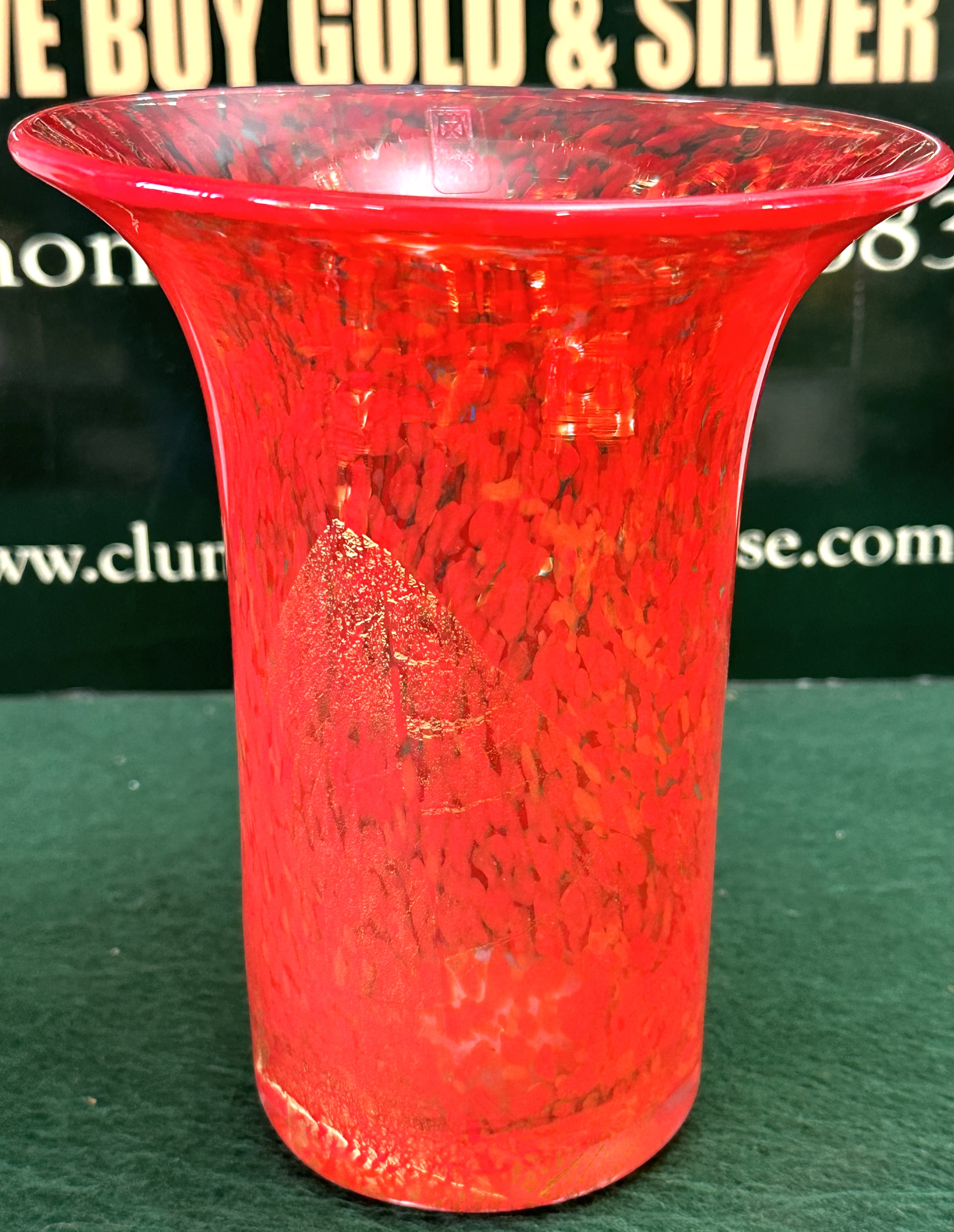 A single hand-blown art glass vase attributed to Mdina Glass, Malta. The vessel features a cylindrical body tapering slightly toward the base and a flared rim. The glass is a deep cranberry red, internally decorated using the adventurine technique, incorporating heavy gold foil inclusions and orange frit, resulting in a mottled, speckled appearance throughout the body. The vase is signed near the interior rim with an etched mark reading “Mdina Glass MALTA” centered beneath the company logo featuring a Maltese cross within a shield outline.