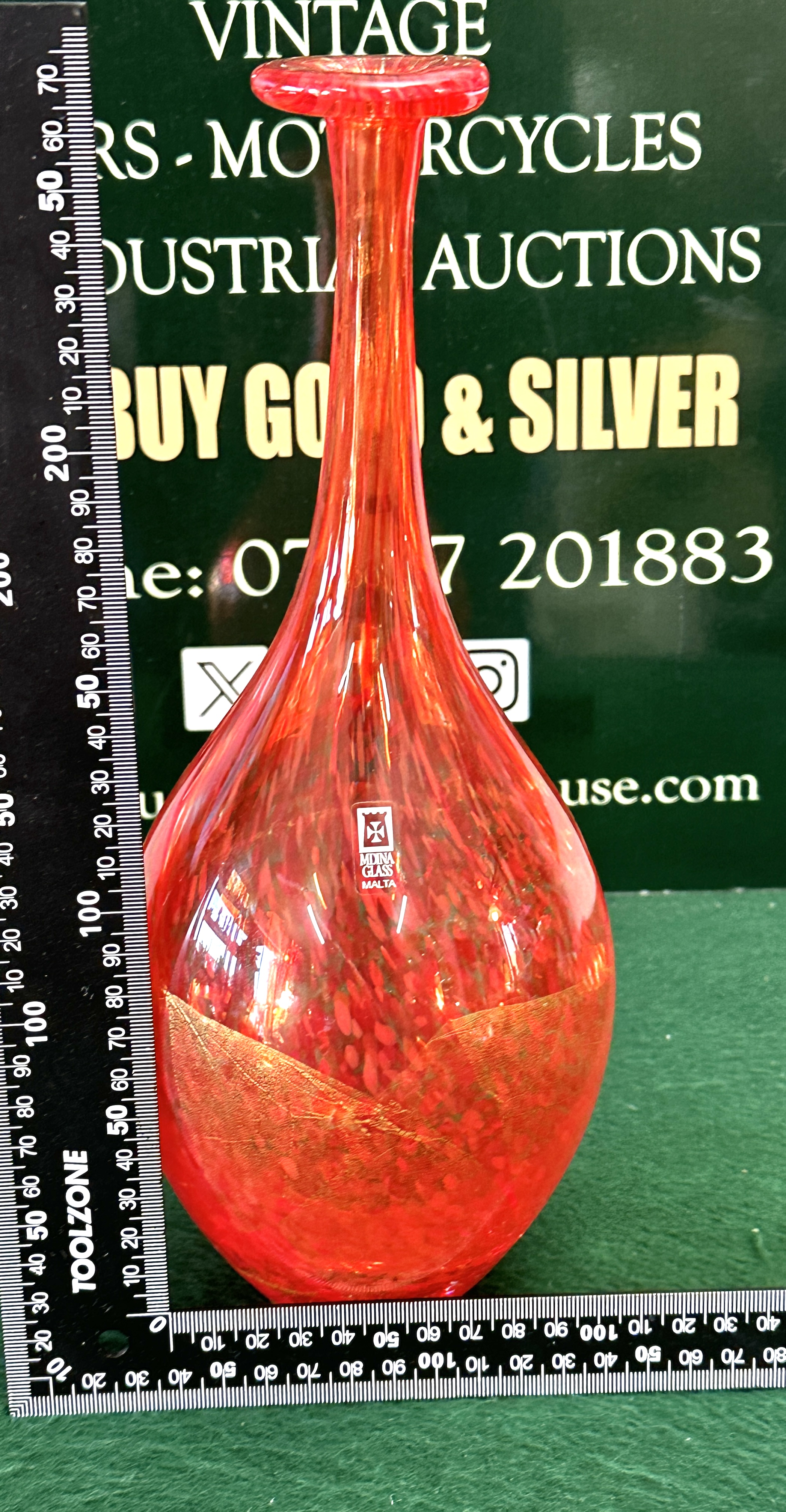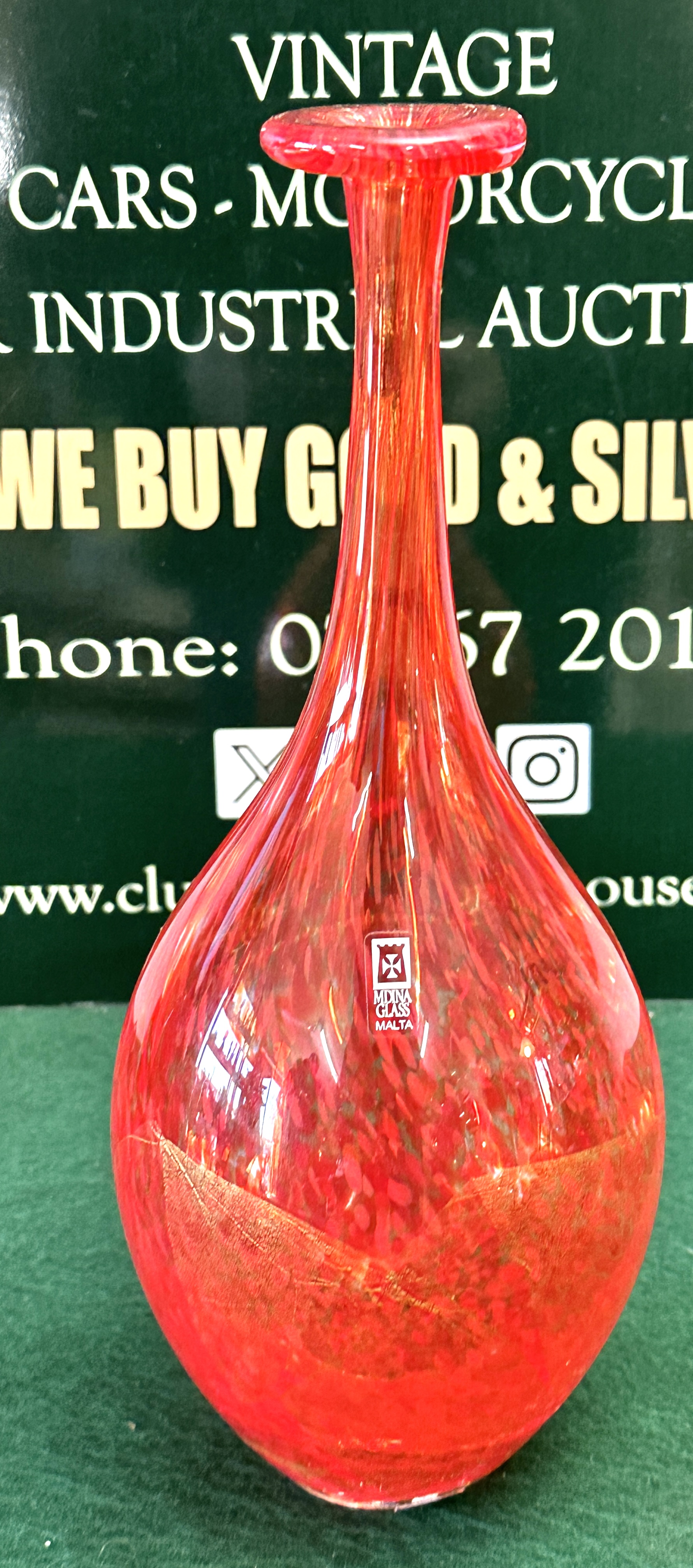 A single modern art glass vase attributed to Mdina Glass, Malta. The piece features a blown glass construction with a rounded, squat body that transitions dramatically into a long, slender neck, terminating in a gently flared rim. The glass is translucent red/orange in color, incorporating internal polychrome speckling, characteristic of techniques such as avventurine. The lower body is further decorated with a substantial external application of gold leaf or metallic foil. The object bears a clear square sticker label on the shoulder marked with a Maltese cross design and the text “Mdina Glass MALTA,” confirming the maker and origin.