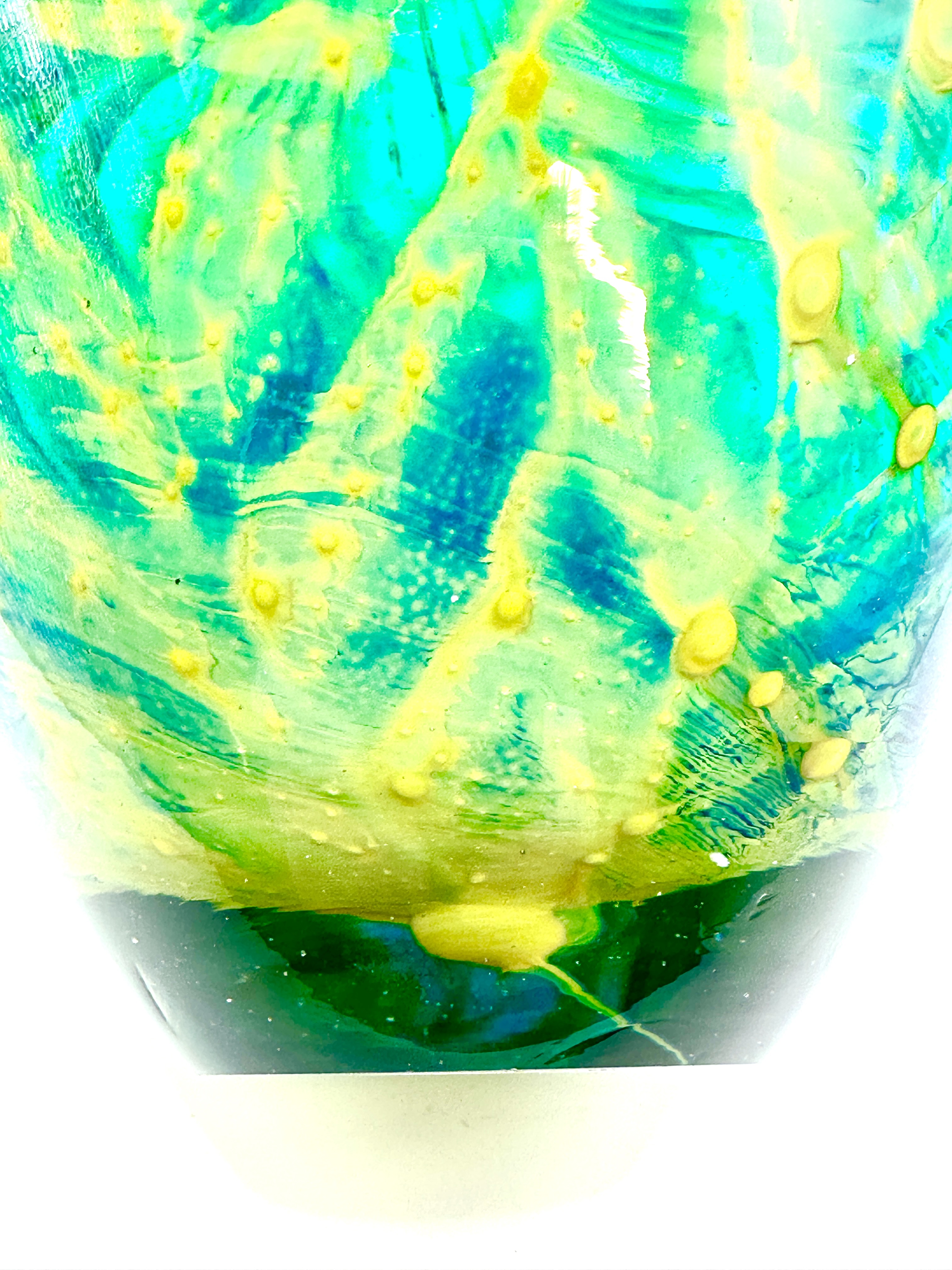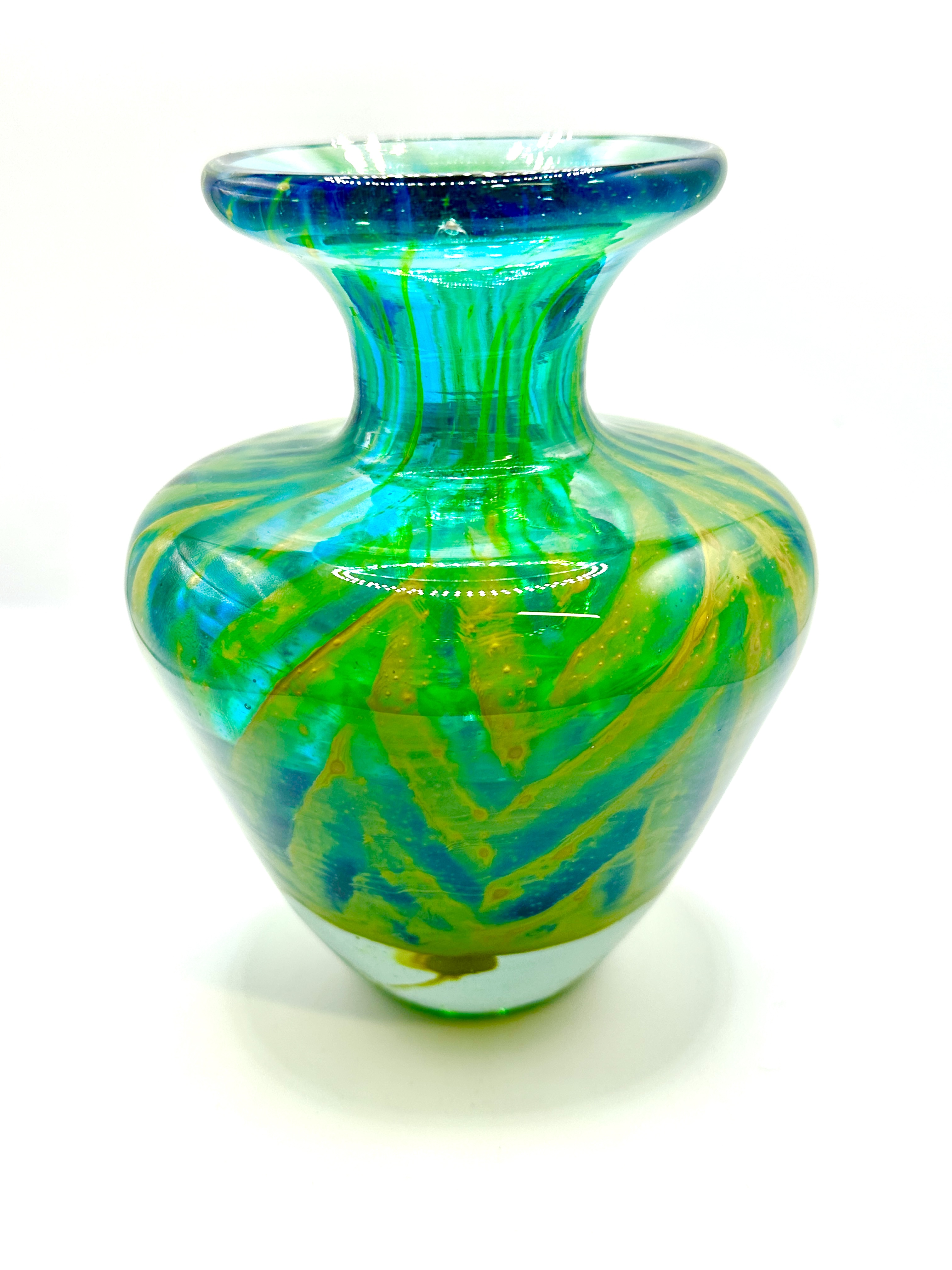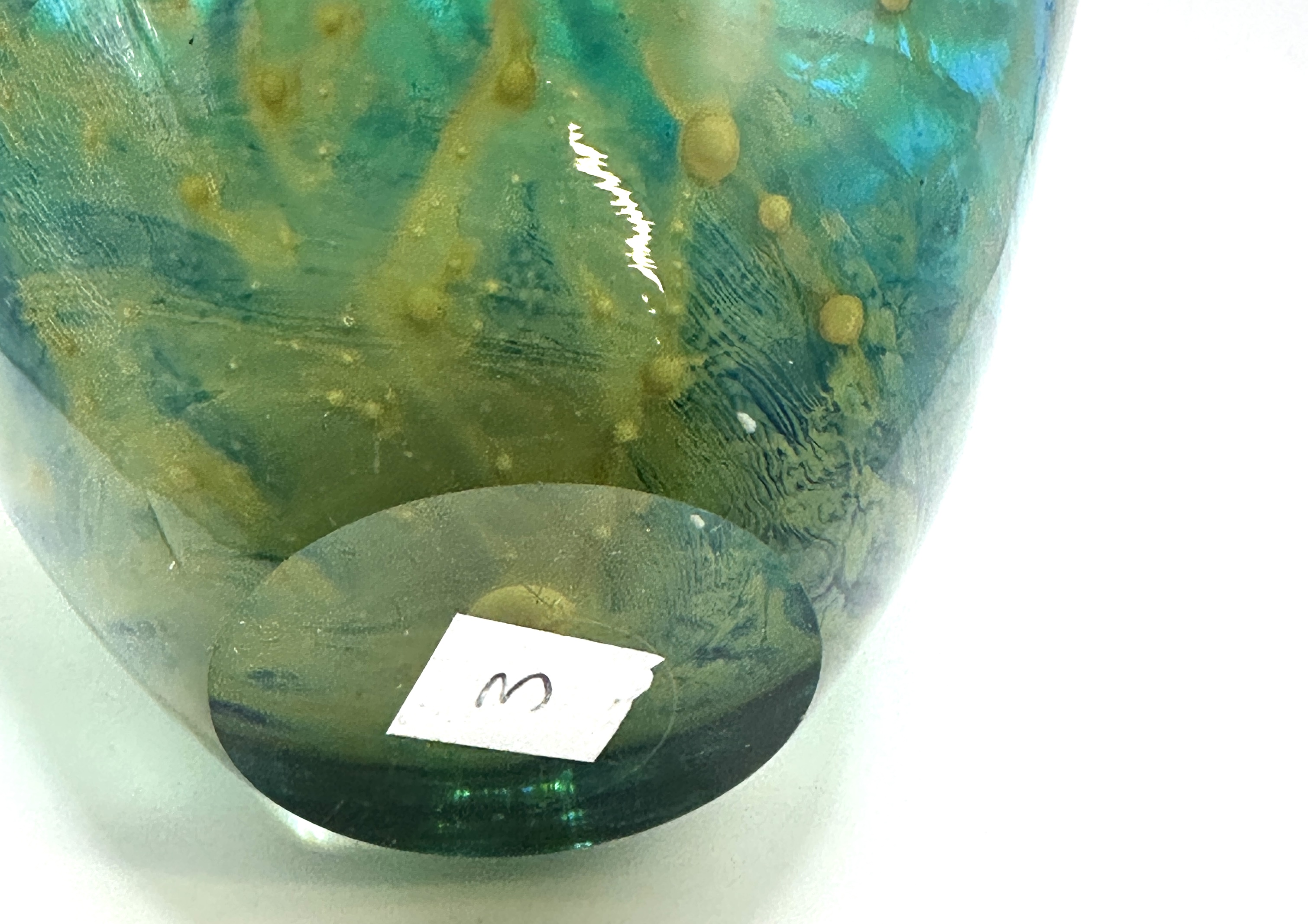 A single studio art glass vase attributed to Mdina Art Glass, Malta. The hand-blown glass features a bulbous body tapering to a defined neck and flared rim. The internal decoration is executed in vibrant, layered colors, primarily blue, turquoise, and bright green, accented by swirling streaks and controlled bubbled inclusions of opaque yellow or gold glass. The style is abstract and contemporary, consistent with the firm’s early production. The base is finished with a smooth pontil mark and retains a deep green/blue coloration. A small rectangular white adhesive label inscribed with the numeral “3” is affixed to the base.