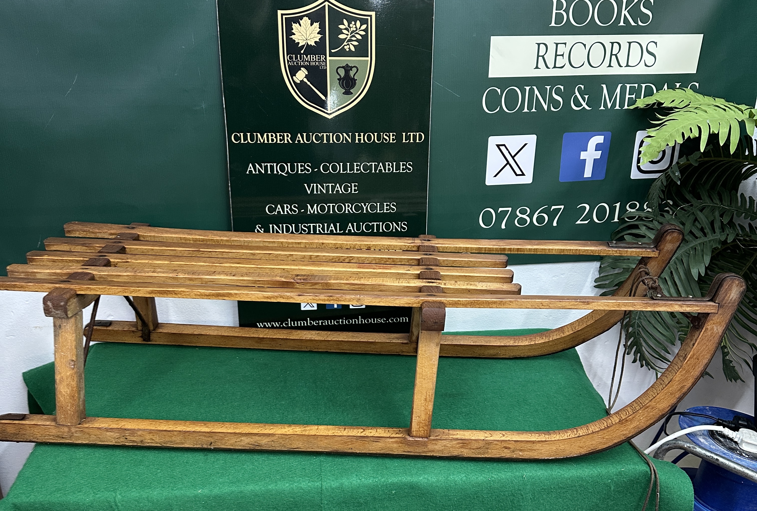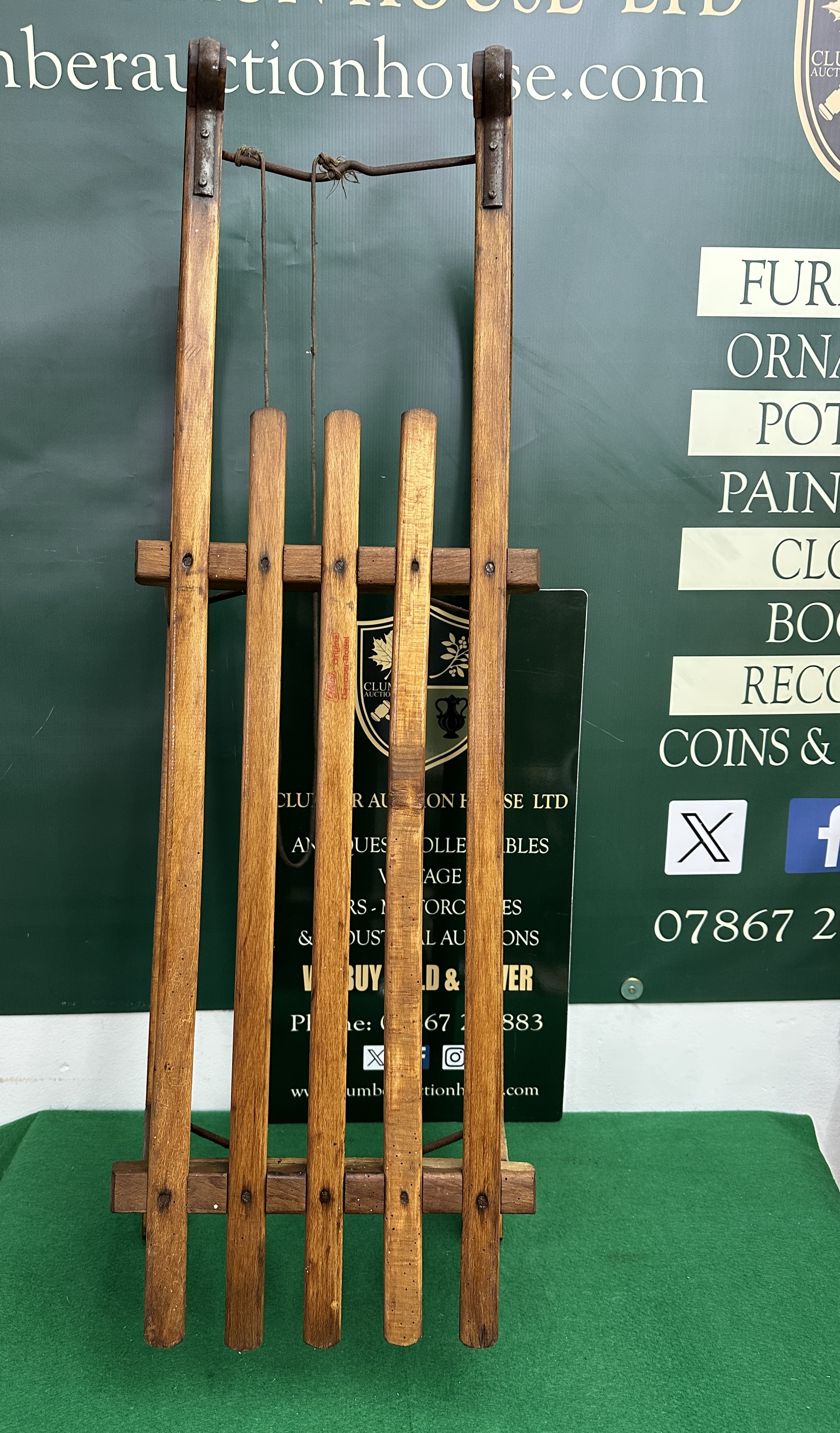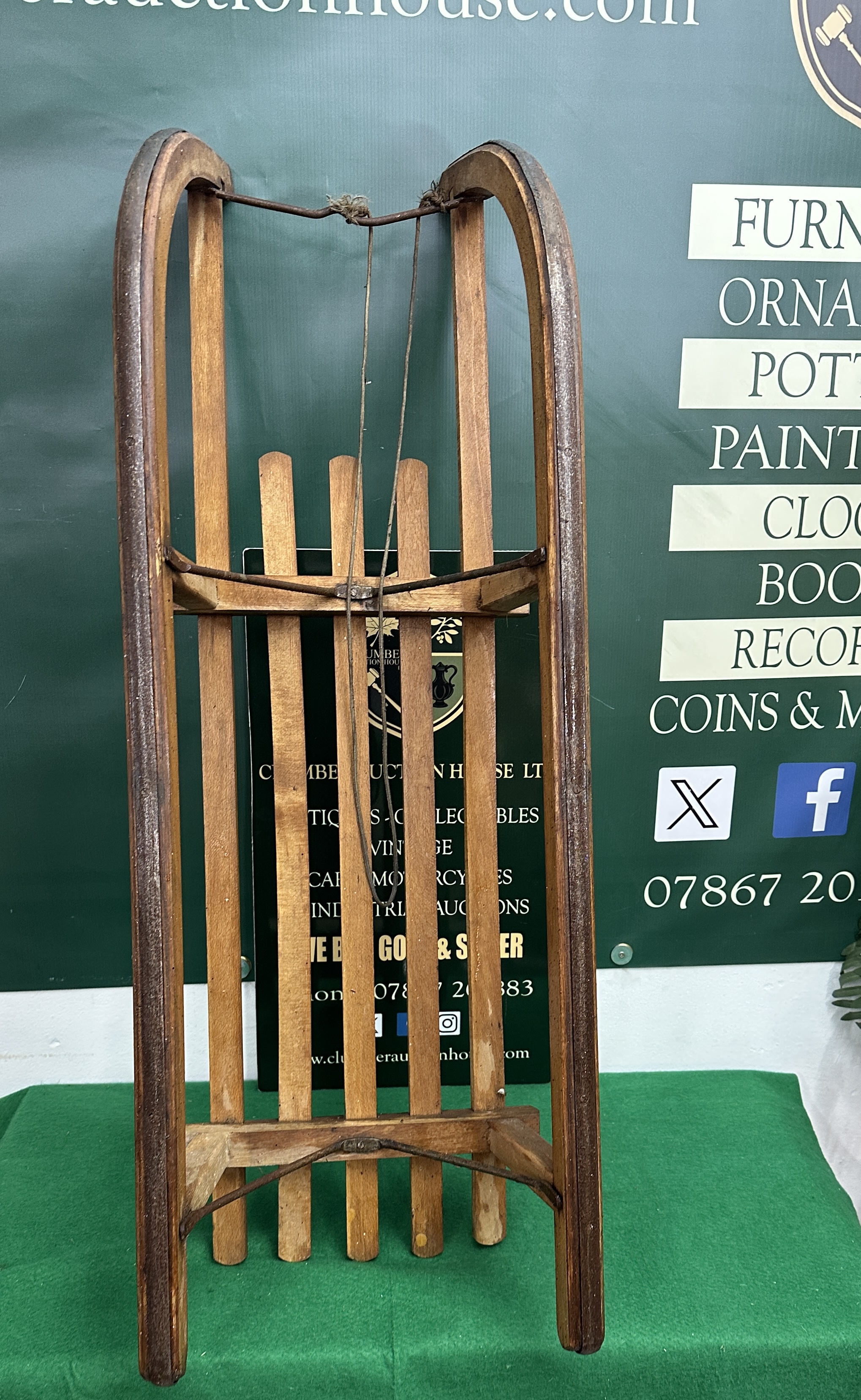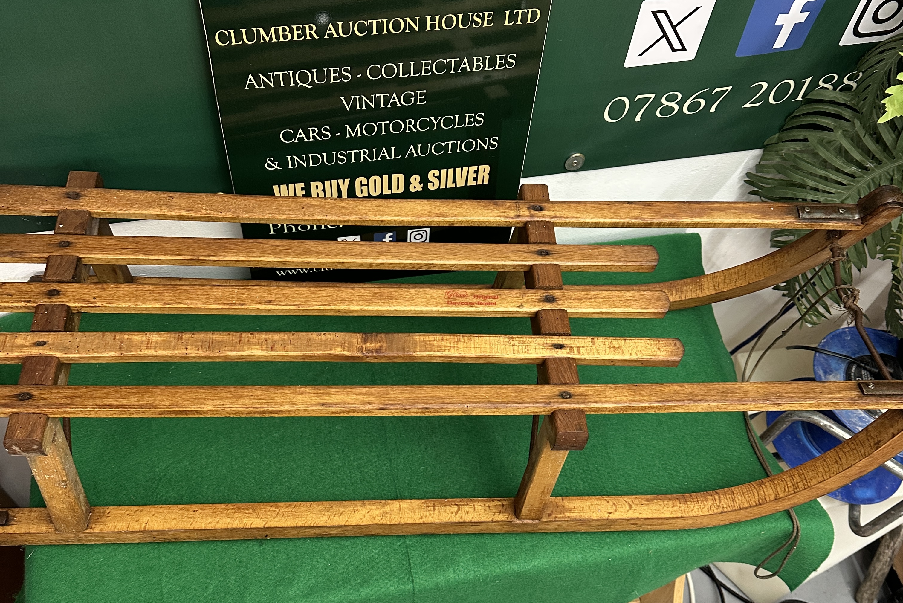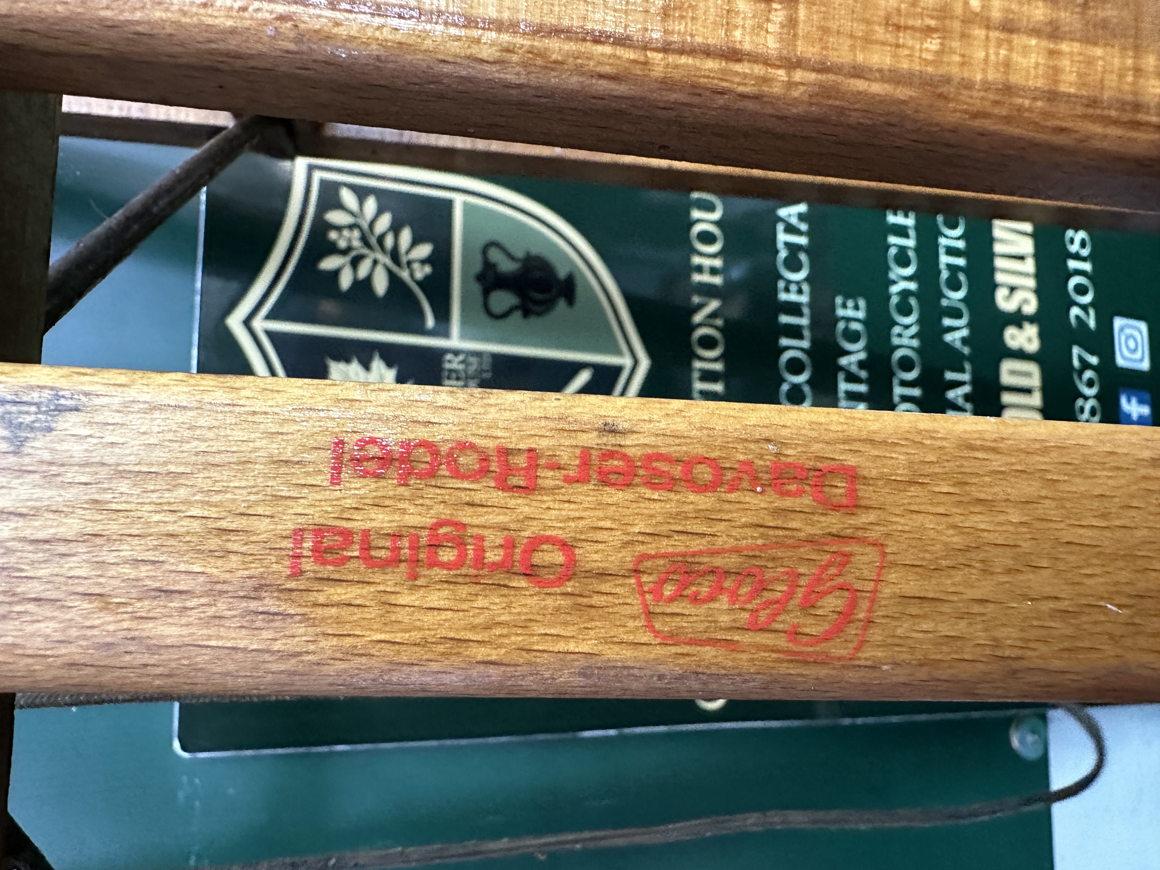 A single vintage wooden sled constructed in the traditional Davos Rodel style. The sled features curved wooden runners and a deck composed of multiple varnished hardwood slats secured by metal hardware. The front retains an attached steering cord or wire. A critical identifying mark is present on a central deck slat, consisting of a red stamped logo and text reading Globi Original Davos Rodel.