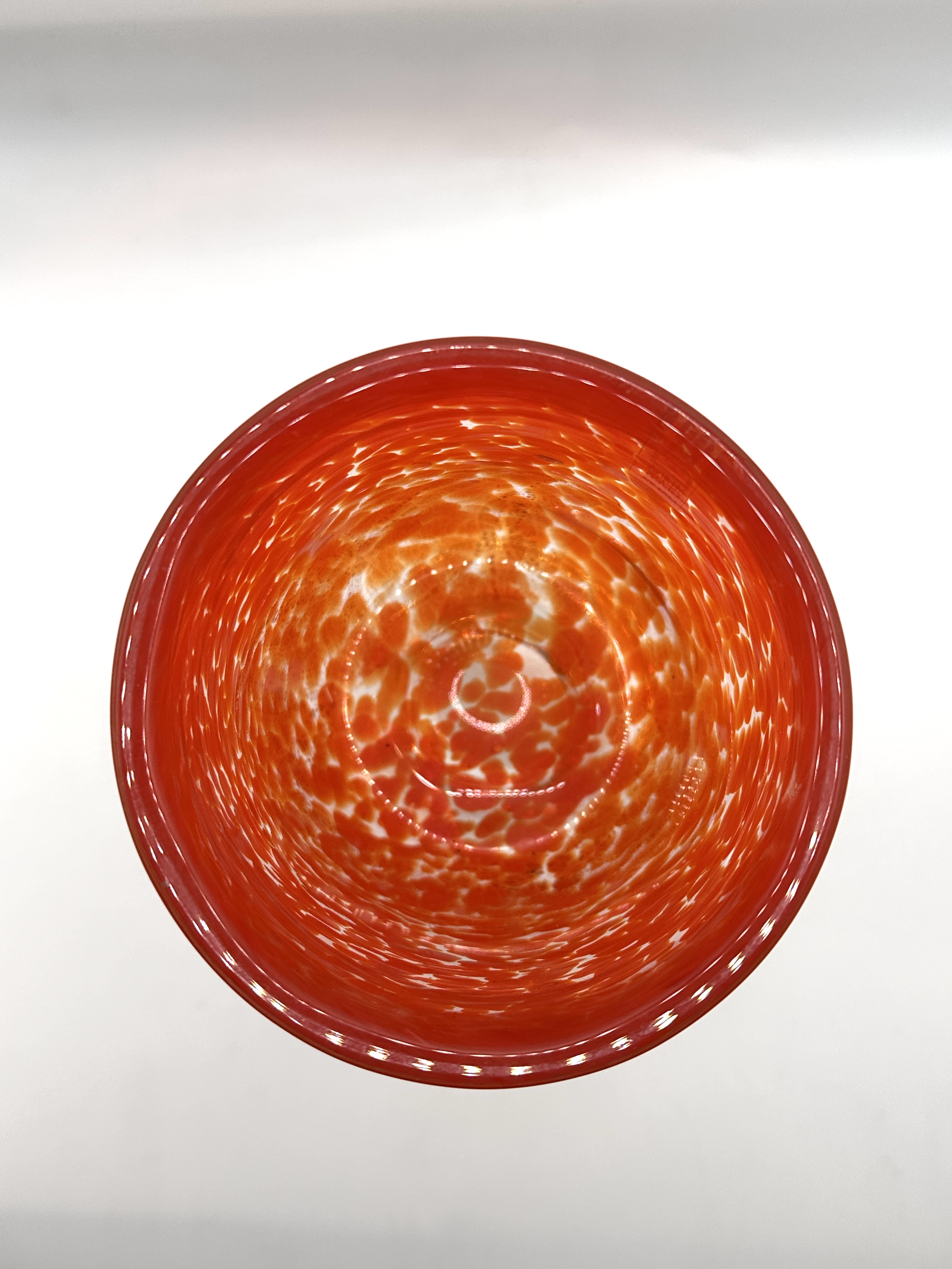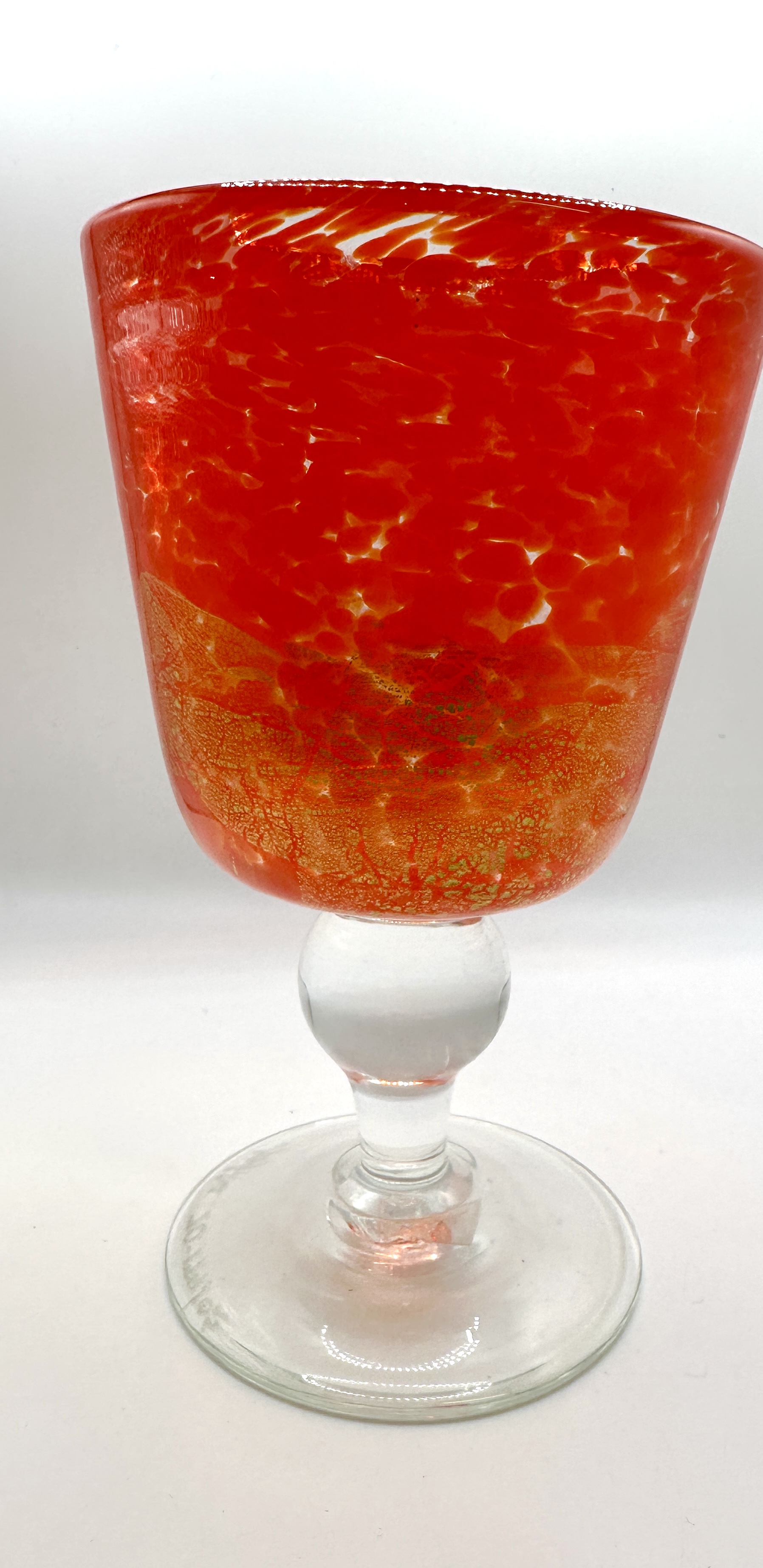 A single hand-blown art glass stemmed vessel or chalice executed in the style known commercially as Antibes. This style is characterized by the use of the macchie or confetti technique, featuring intense red and orange glass with white/clear mottling throughout the substantial bowl. The decoration includes extensive internal gold foil inclusions, consistent with an aventurine or scavo effect. The bowl has a flared, slightly conical form and sits atop a clear glass stem defined by a prominent spherical knop. The vessel rests on a wide, clear circular foot. Concentric production rings are visible inside the bowl, consistent with hand-blown manufacture. No signatures or definitive manufacturer marks are visible.