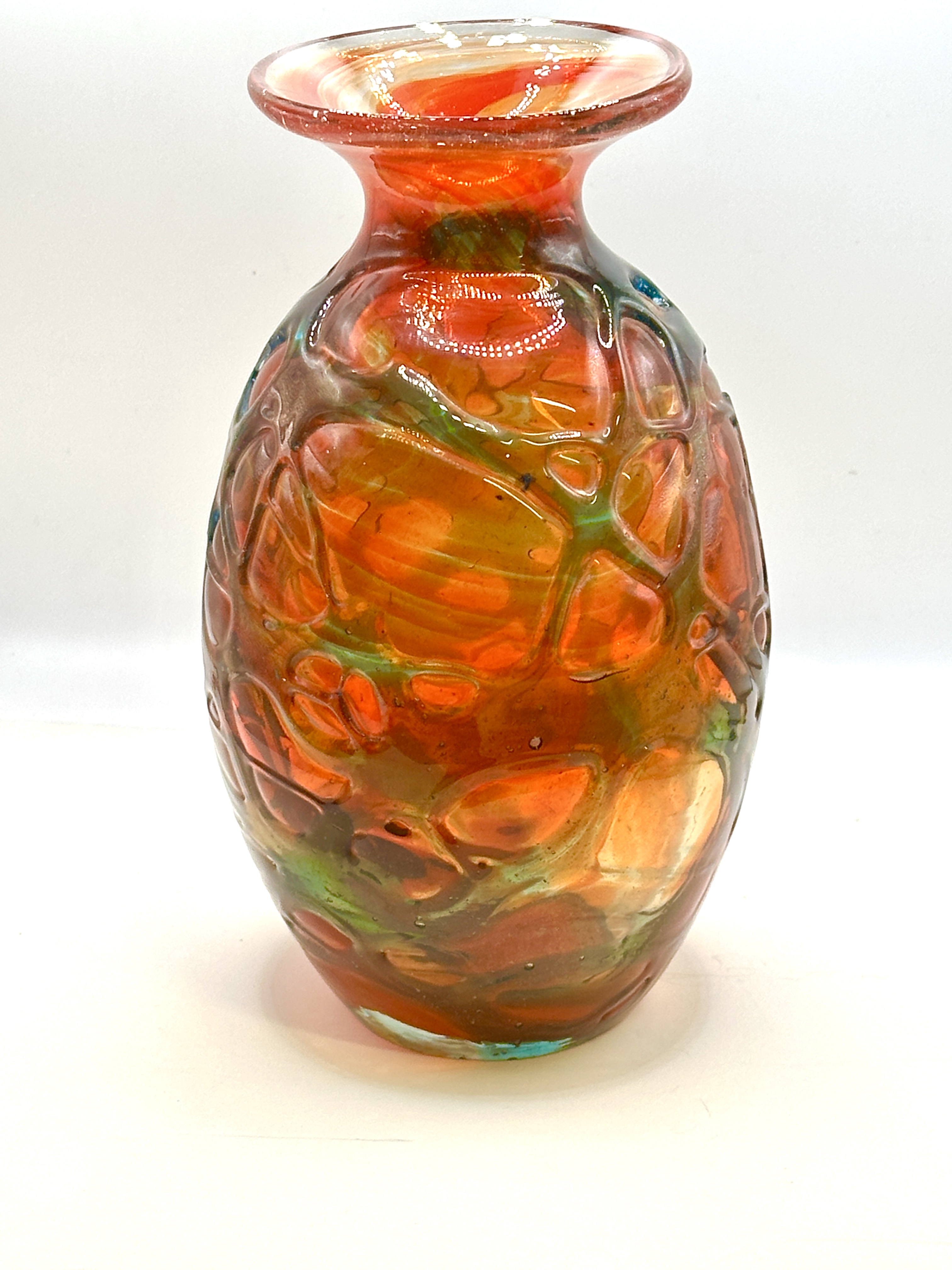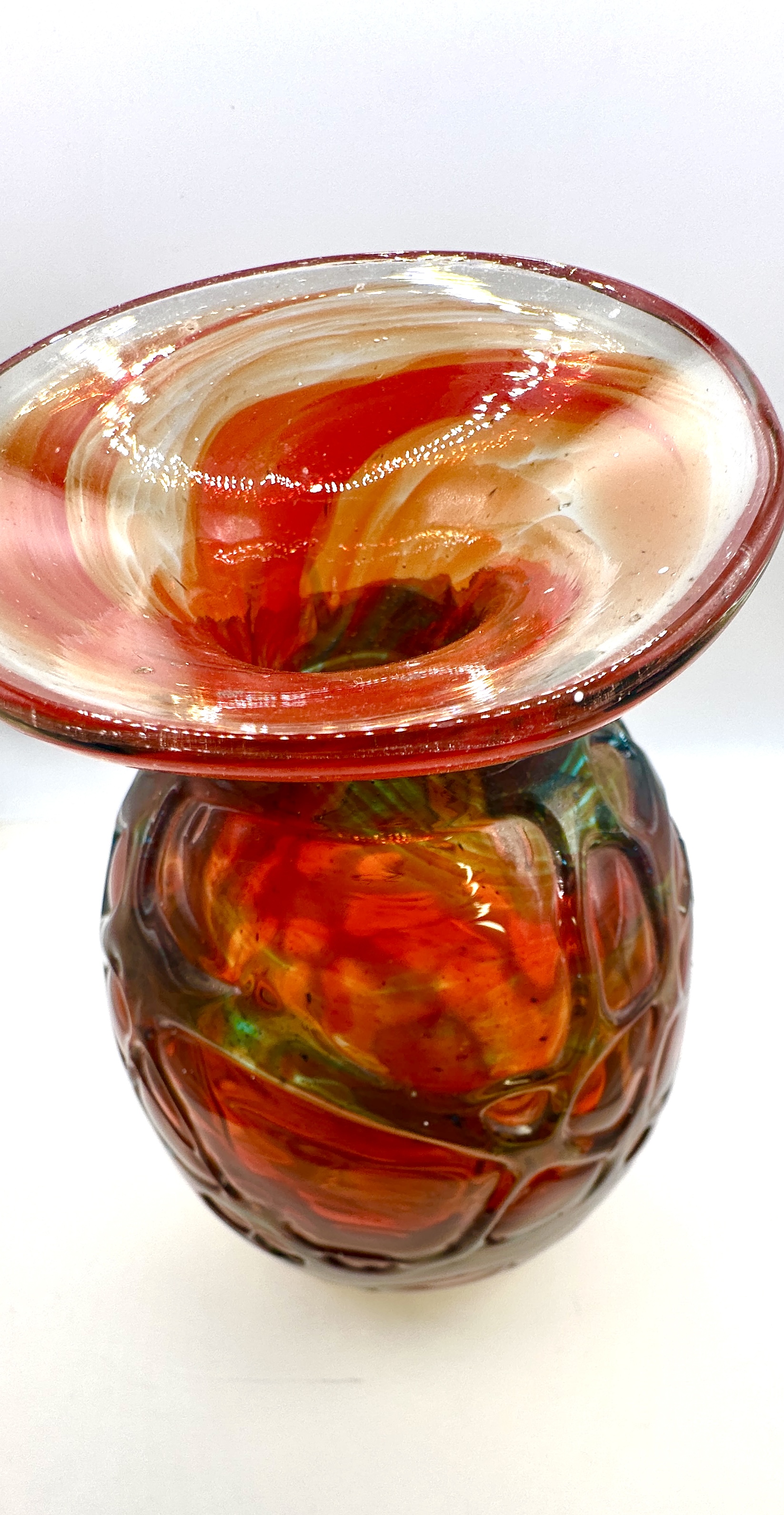 A single Mdina studio art glass vase, featuring an ovoid or bulbous body tapering to a short neck and a wide, rolled rim. The vase is crafted from blown glass and exhibits the characteristic Brutalist style associated with the Maltese studio. The internal coloring features vibrant, swirling tones of fiery orange, deep red, and amber, accented by streaks of emerald green and teal. The exterior surface is finished with an applied or manipulated irregular, raised, web-like pattern, creating a textured relief finish. No visible signature or pontil mark is apparent on the base.