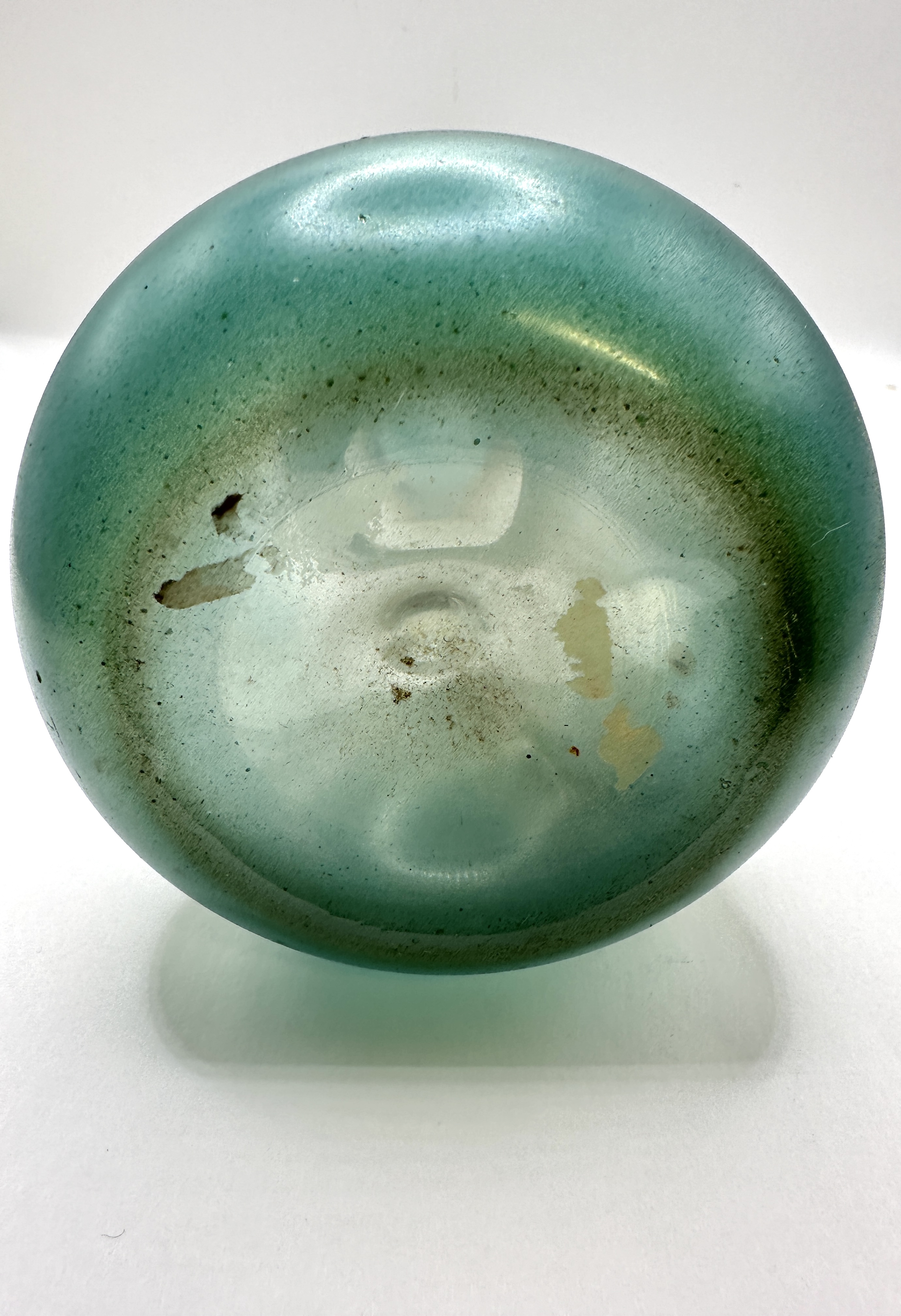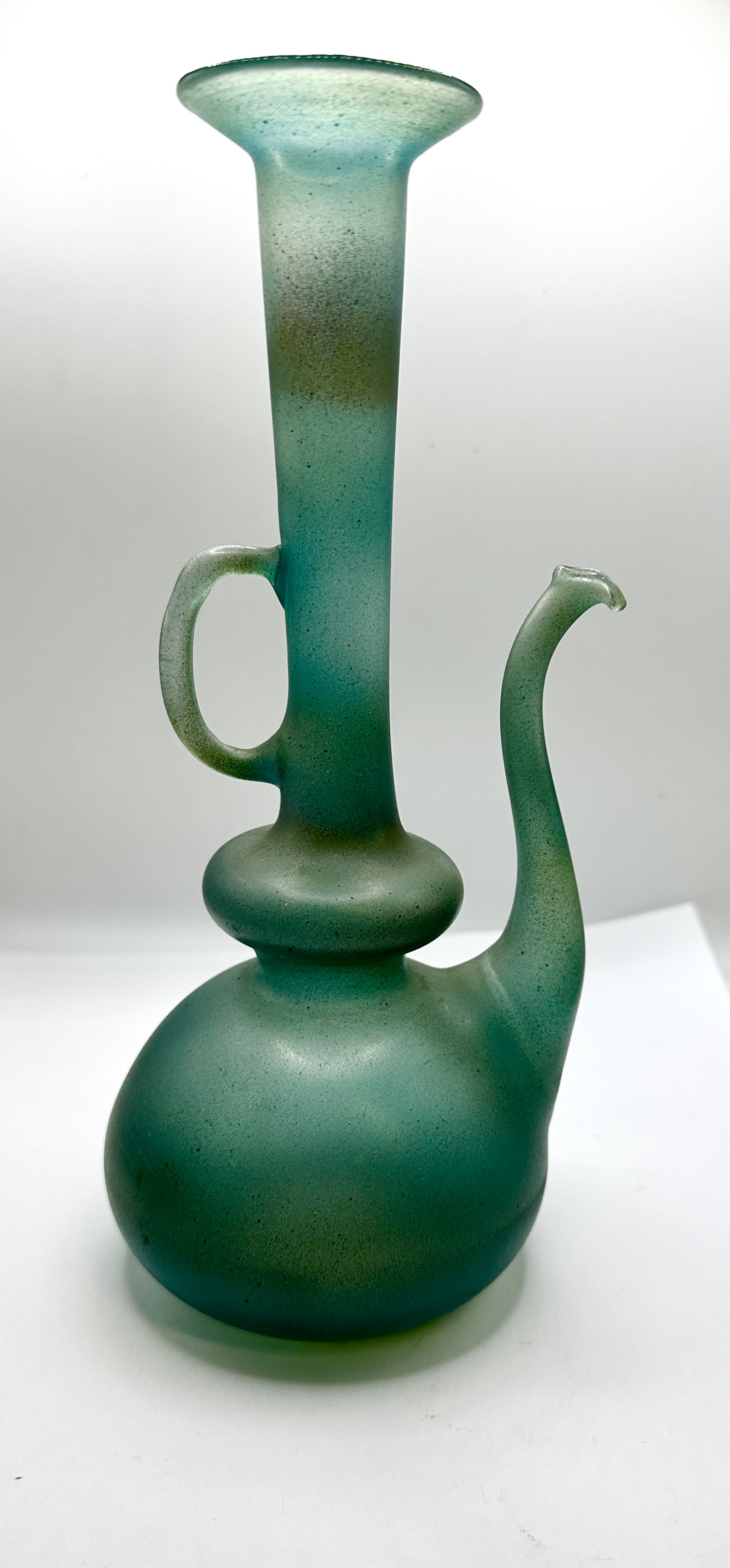 A single handblown glass vessel, likely mid-20th century European, featuring a heavily frosted and textured surface consistent with the ‘Scavo Corroso’ style often associated with Italian or Bohemian art glass. The glass exhibits a variegated color gradient transitioning from deep teal at the rounded globular body to lighter aqua near the trumpet mouth. The form consists of a globular body supporting a flared collar and a tall cylindrical neck, terminating in a wide trumpet mouth. A small applied loop handle is situated on the neck, and a long, curved upward-swept spout originates from the body. The base shows a central indentation consistent with a pontil mark, indicating handblown construction. No manufacturer markings or inscriptions are visible.