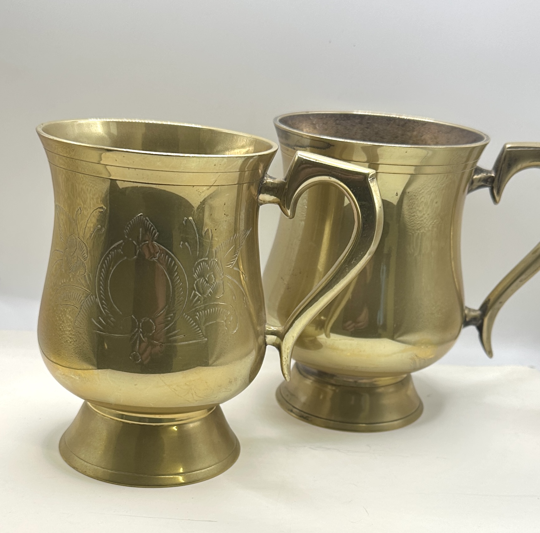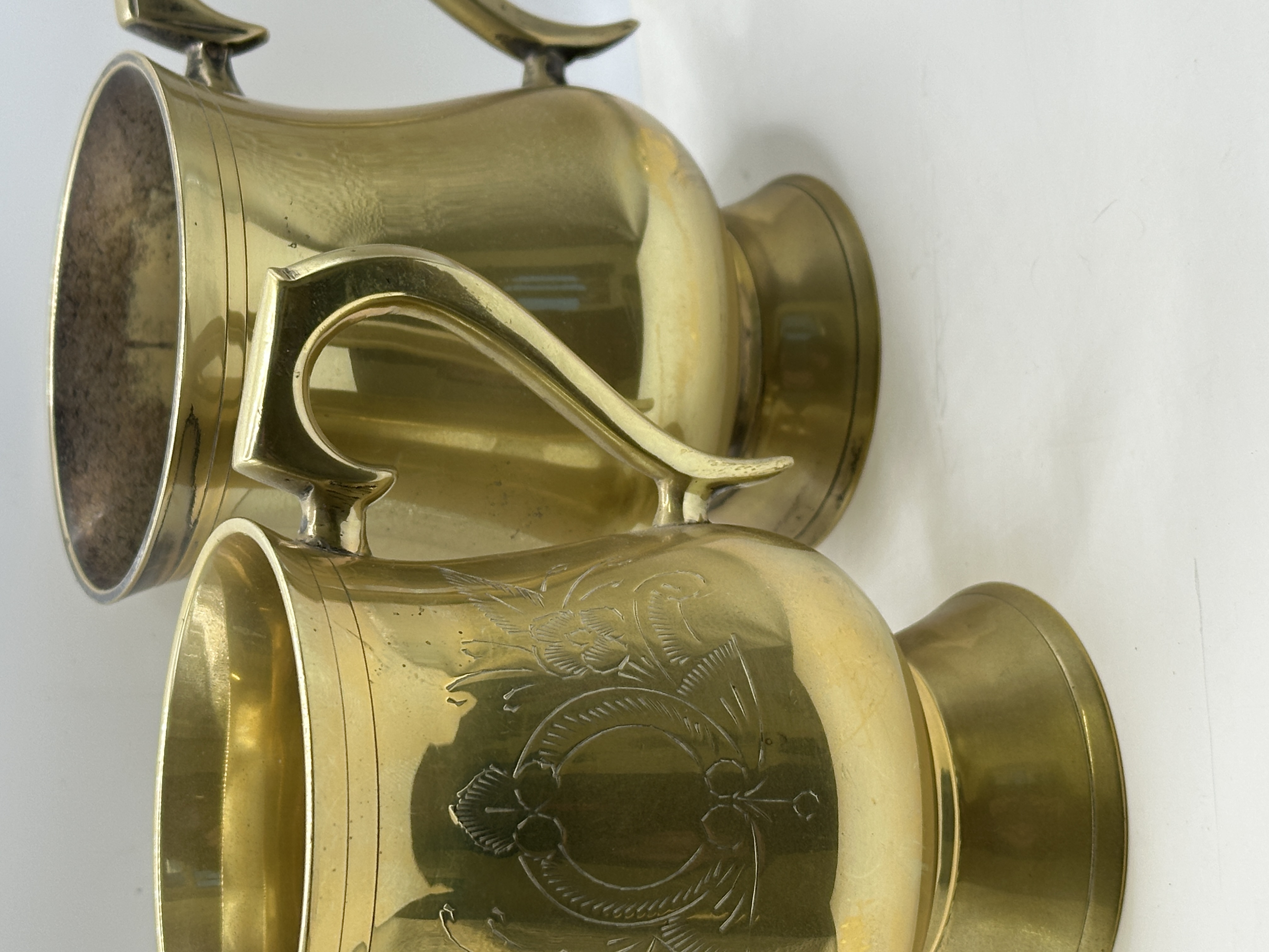 A pair of vintage handled vessels, identified by market comparables as brass tankards or mugs. Each vessel is crafted from polished yellow metal and features a flared rim, a tapering body, and a small pedestal base. The vessels are fitted with substantial stylized C-scroll handles. The exterior decoration consists of extensive etched or engraved decoration featuring stylized floral and vegetal motifs surrounding a central cartouche. No visible hallmarks, maker’s marks, or inscriptions are discernible. Market comparables suggest this style of engraved brassware is commonly associated with production in India or the Middle East.