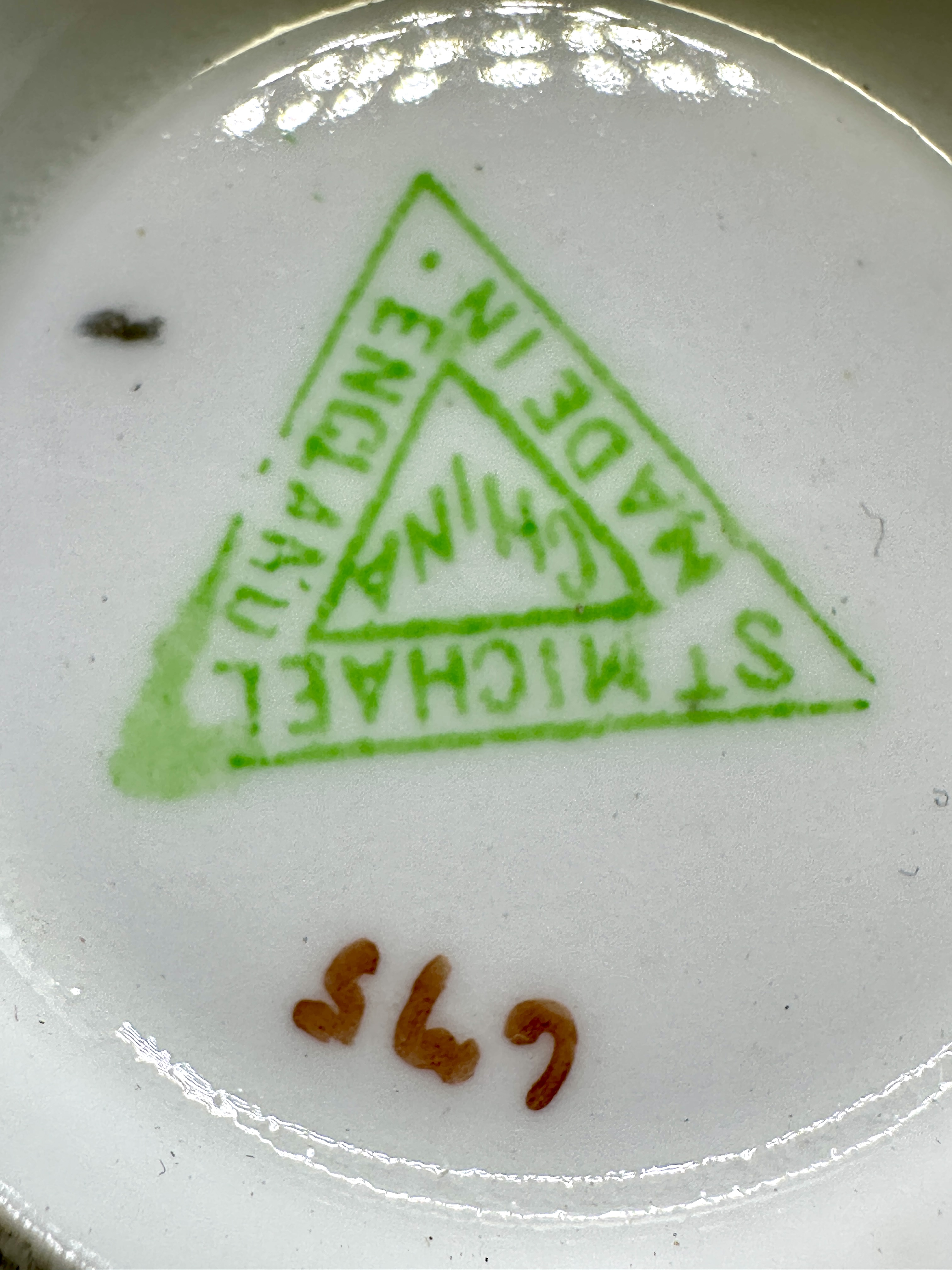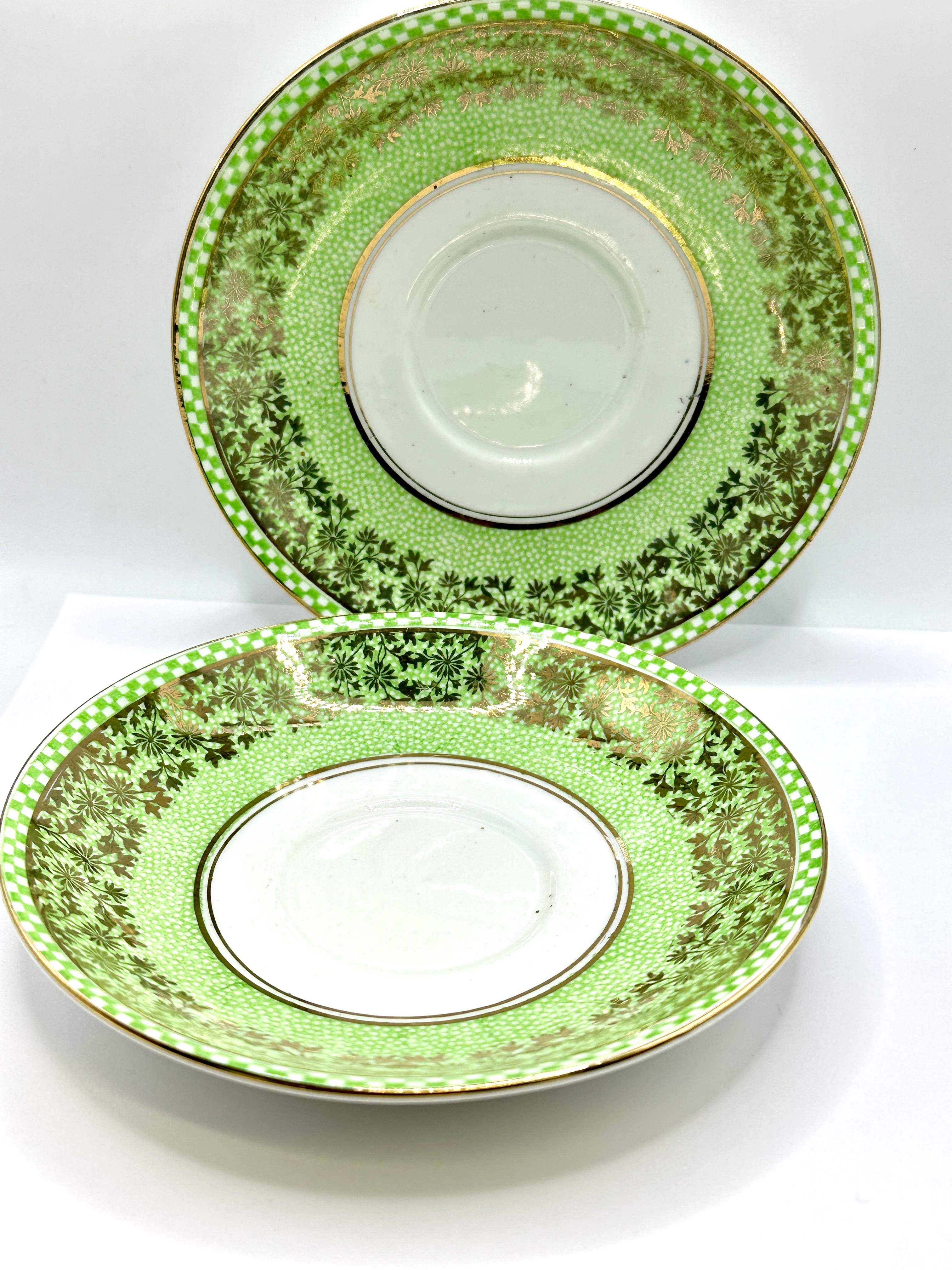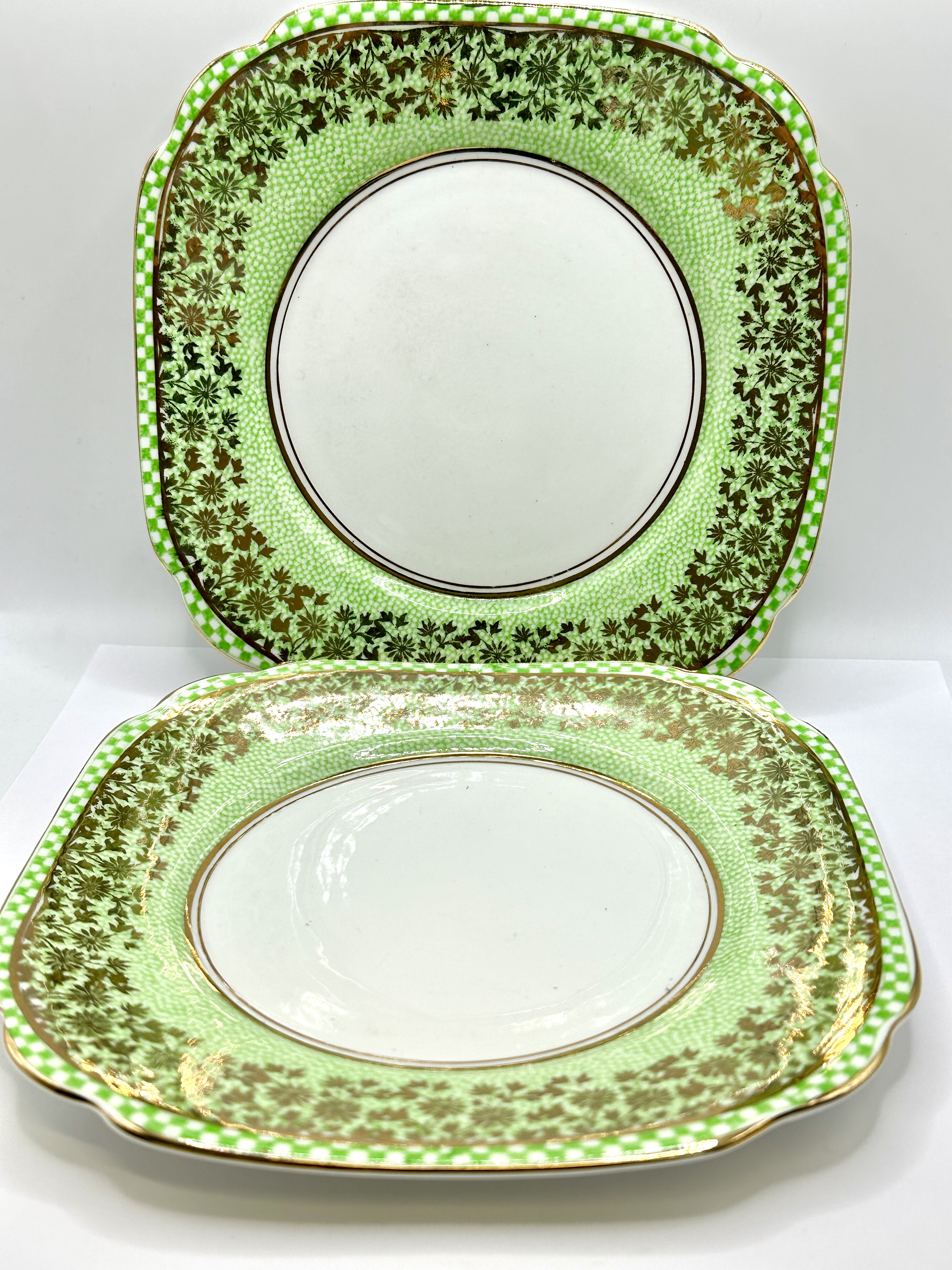 A collection of six pieces of mid-century English bone china tea service, identified by market consensus as the Mottahedeh Apple Lace pattern. The collection comprises two teacups, two saucers, and two slightly scalloped square tea plates. The items feature a vibrant apple green color scheme overlaid with dense gold gilt transferware, displaying a fine floral or sprig pattern set against a stippled background. The rims and borders are accented by a decorative band of alternating green and gilt checkerboard squares. The reverse of one item bears a green triangular backstamp reading ST MICHAEL, CHINA, and MADE IN ENGLAND, indicating production for Marks & Spencer, along with a hand-painted number 569 in reddish-brown.