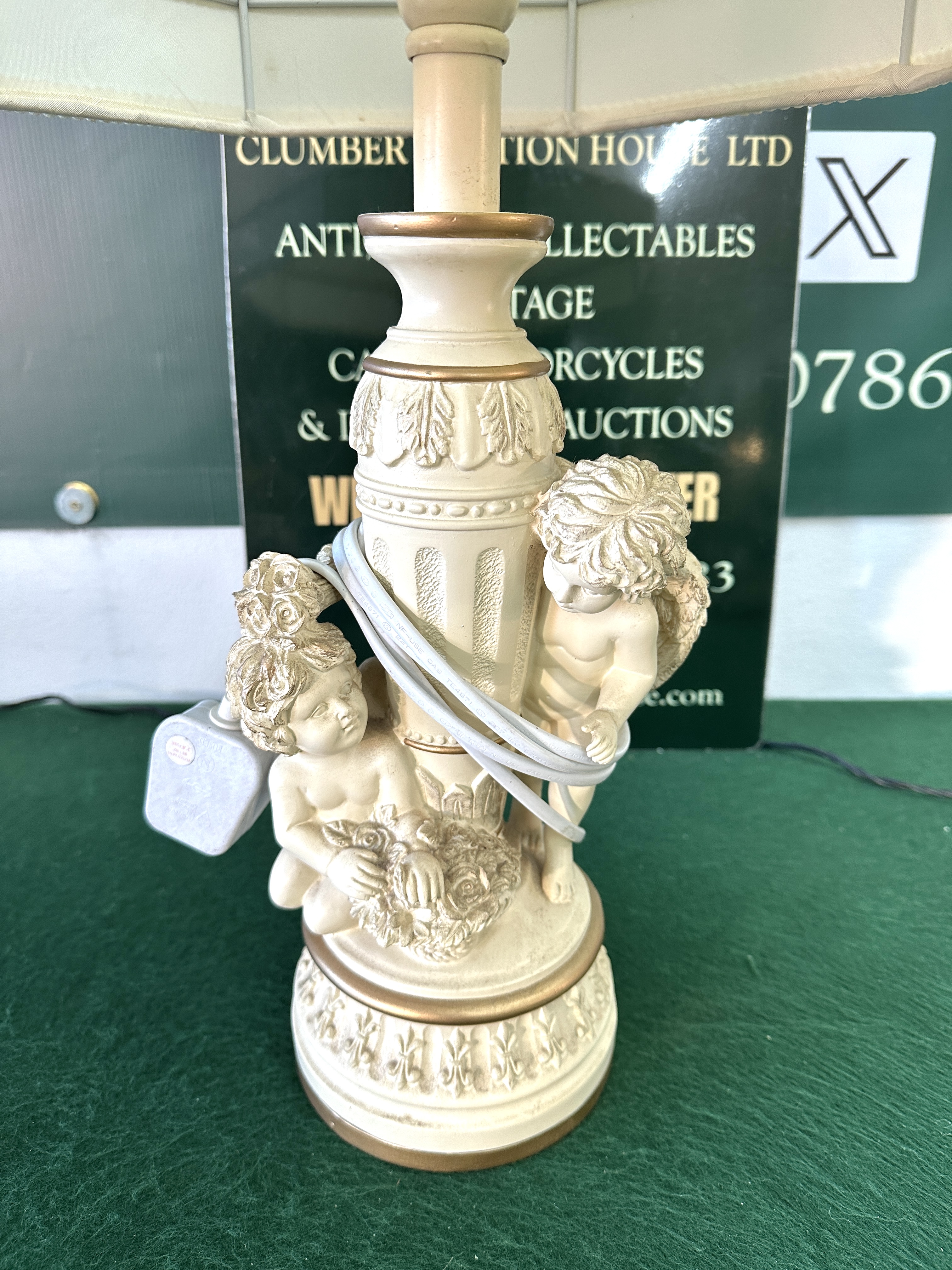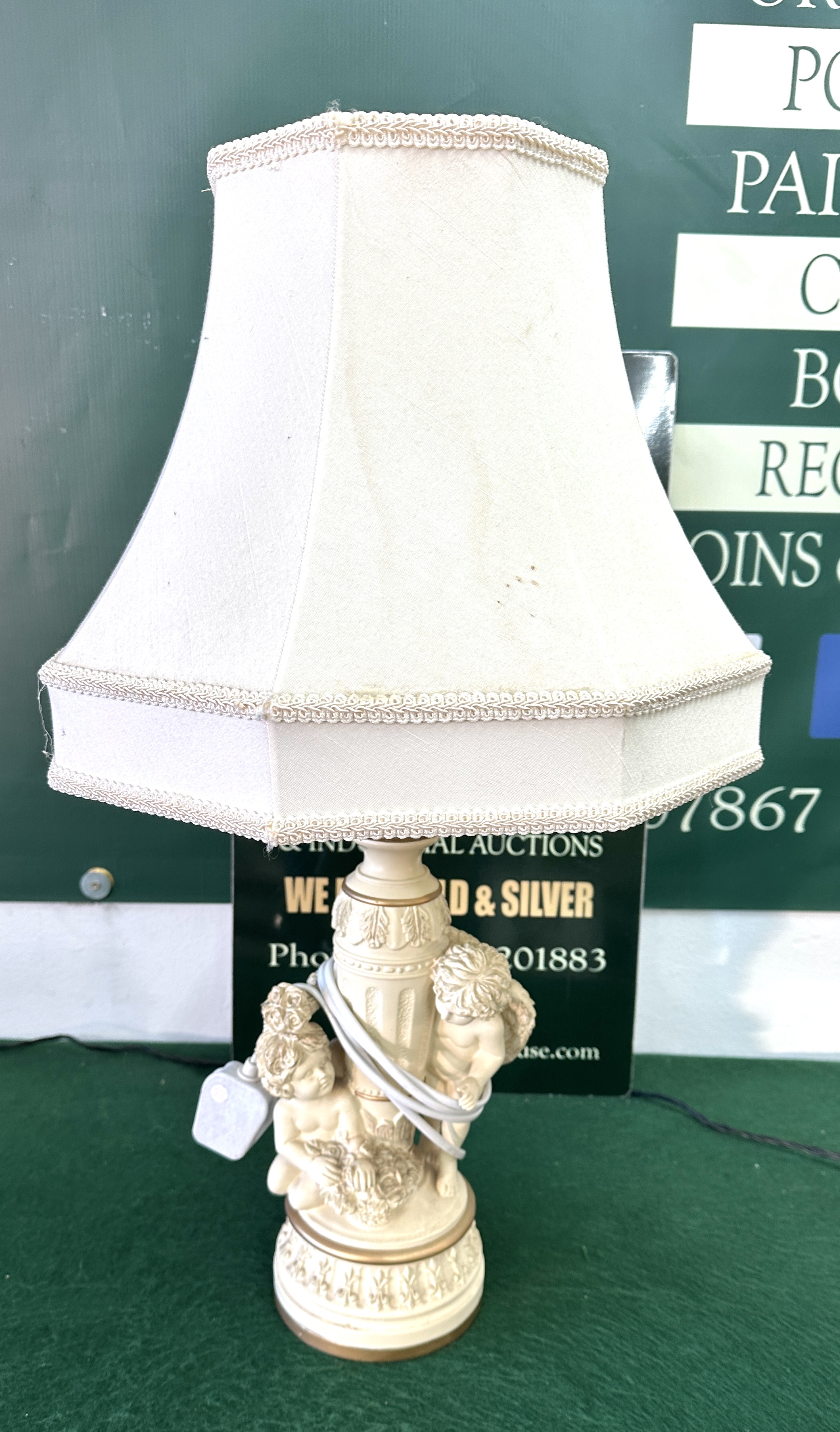 A single table lamp featuring a molded base in a Rococo revival style. The base is constructed of a composite material, likely resin or plaster, finished in a creamy ivory color with gilded accents highlighting the decorative relief. The central column motif is flanked by two detailed putti figures (cherubs), one of whom is holding a floral wreath. The lamp is topped with a tapered, rectangular fabric lampshade in ivory, finished with beaded trim along the top and bottom edges. The style is consistent with mid-20th century vintage lighting designs.