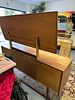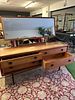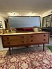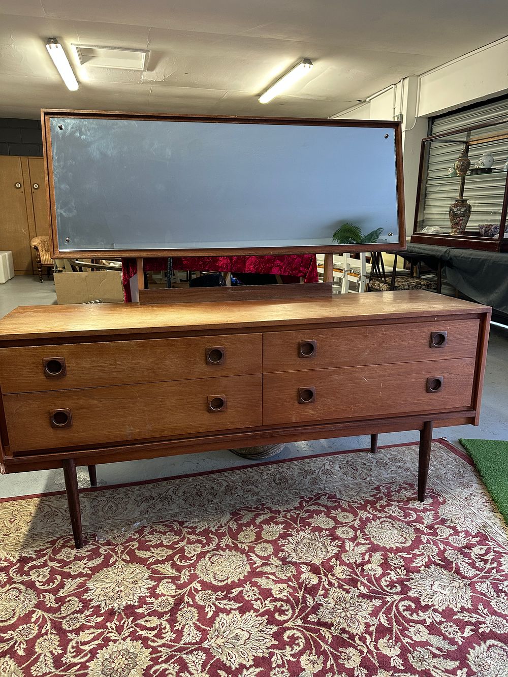 A Mid-Century Modern dressing table or long chest of drawers, constructed entirely of teak. The unit features a rectangular body supported by four tapered, exposed legs connected by a stretcher base, characteristic of 1960s design. The main case contains four drawers arranged horizontally in a single row. Each drawer front is fitted with two circular, integrated wooden pull handles. A large rectangular mirror, set within a teak frame, is mounted atop the back rail and designed to tilt. The form is consistent with designs produced by British manufacturers such as Wrighton, White and Newton, and McIntosh during the period.
