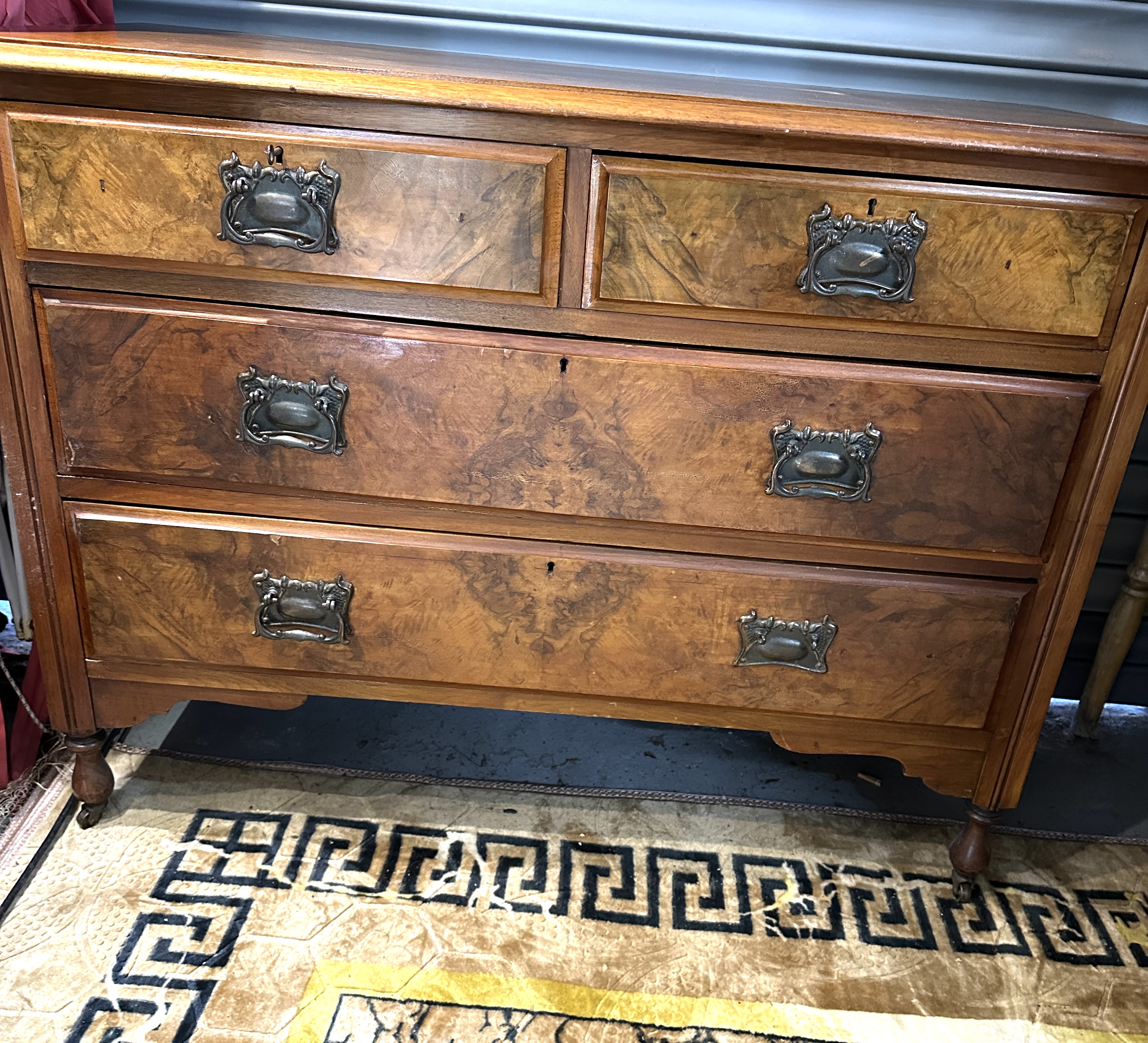 This is a traditional four-drawer chest of drawers featuring a two-over-two configuration. The drawer fronts are finished in a highly figured burl wood veneer, likely walnut or mahogany, providing a rich, variegated appearance. The unit stands on turned wooden legs fitted with small casters, typical of the late Victorian or Edwardian period. The piece is fitted with decorative dark metal handles and accompanying keyholes on all drawers.