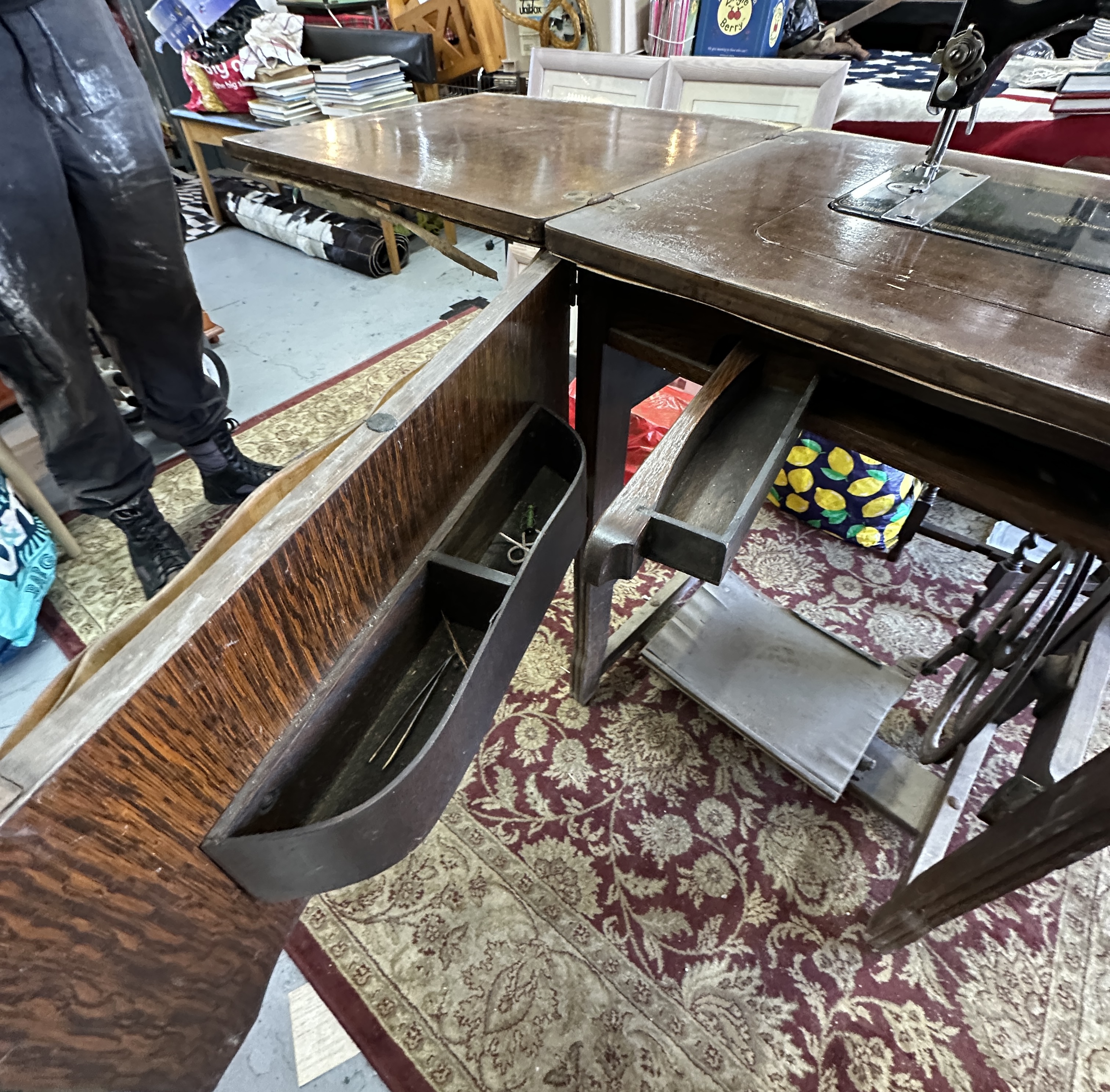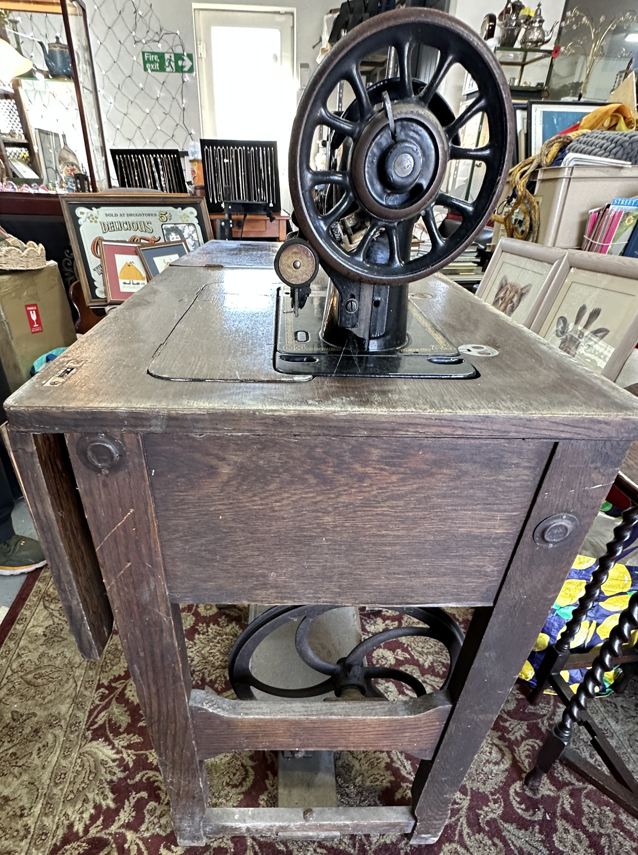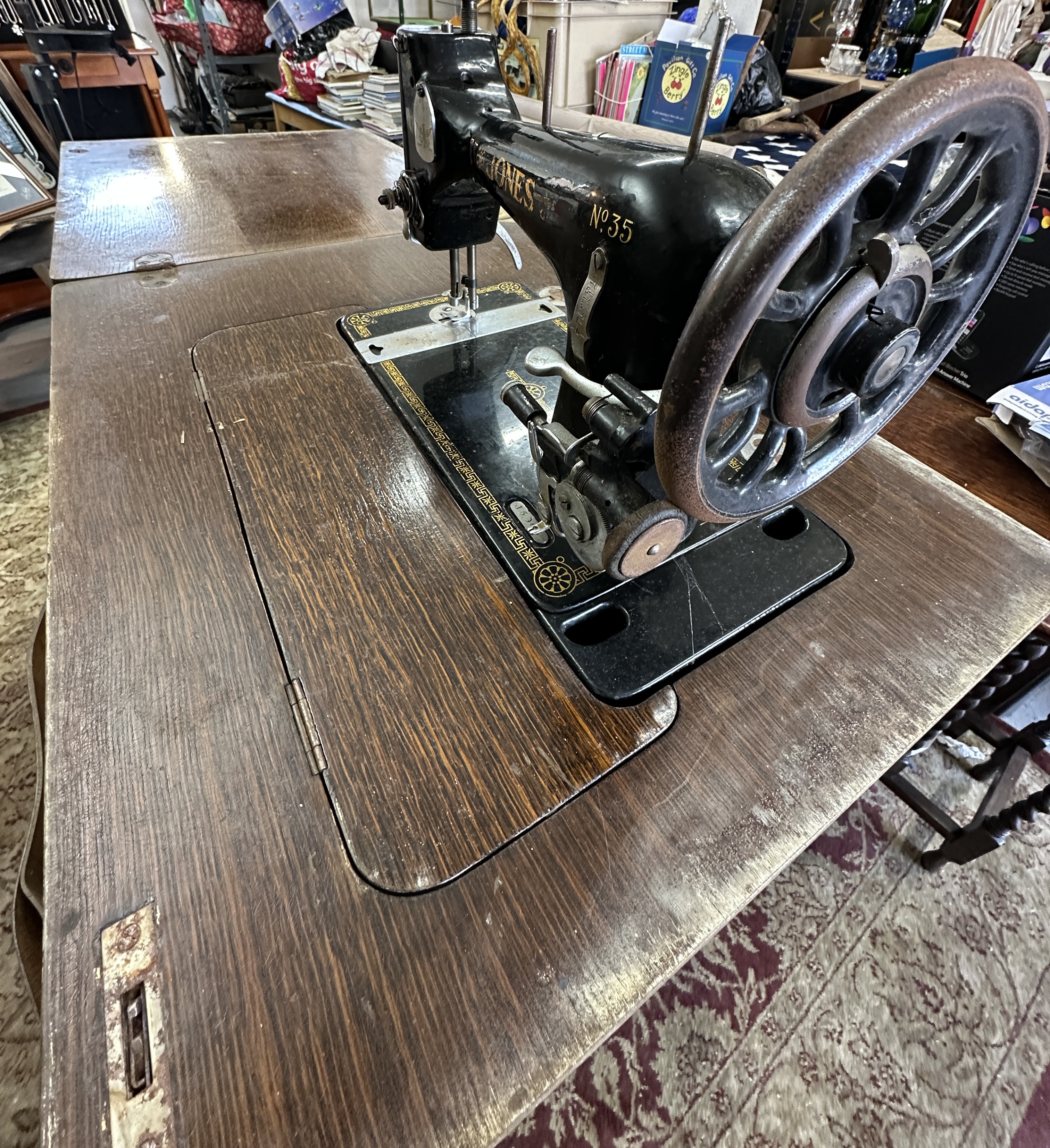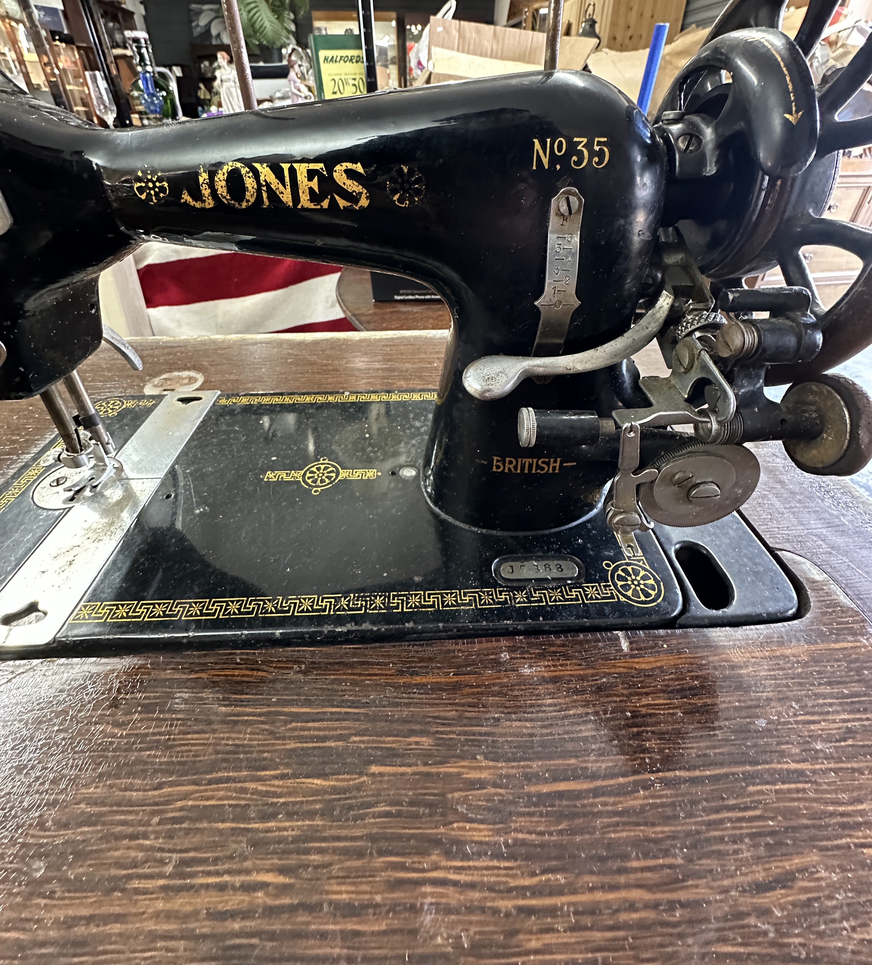 This lot presents an antique Jones N° 35 treadle sewing machine, identified by the visible markings on the machine head and bedplate, which also bears the designation “BRITISH.” The machine is housed within its original dark-stained wooden cabinet, featuring hinged folding side leaves and a swing-out wooden accessory tray located beneath the tabletop. The machine operates manually via a treadle mechanism, with the large cast iron hand wheel/flywheel present and visible.