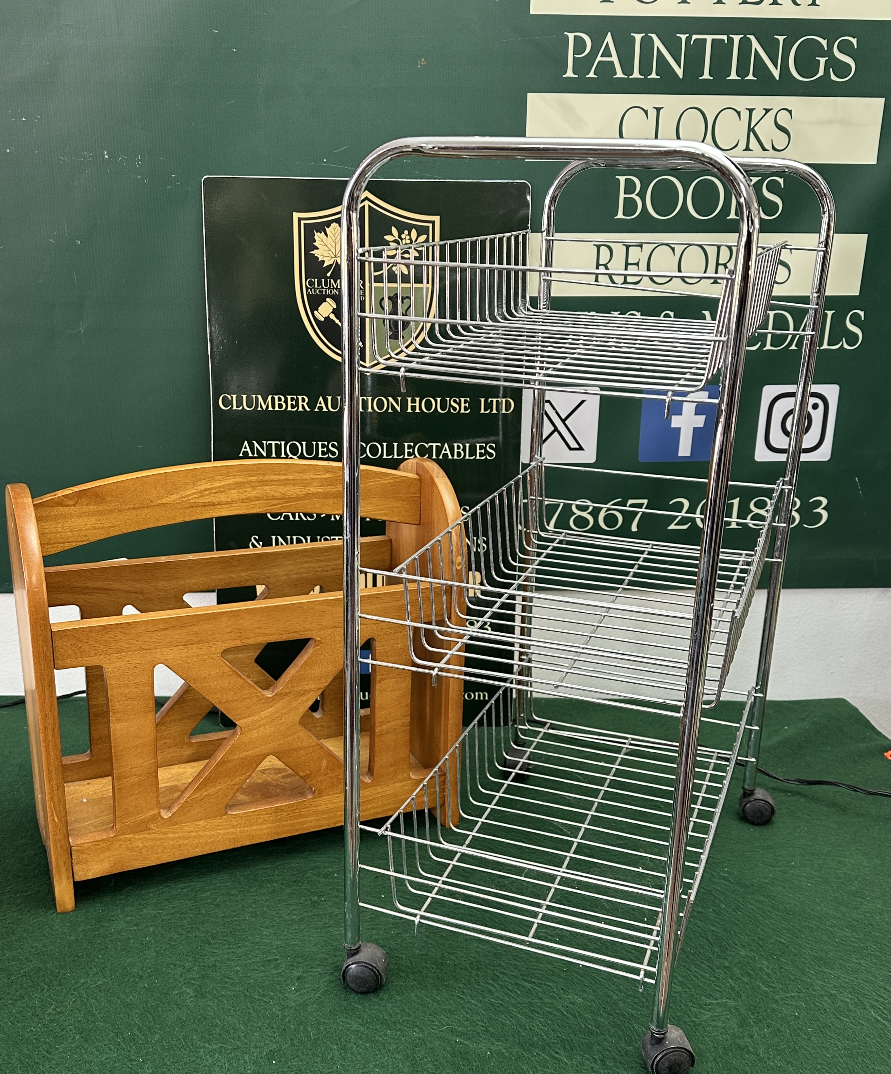 This lot comprises two distinct non-automotive items photographed against the backdrop of Clumber Auction House Ltd. The primary item is a modern, three-tier utility cart constructed of chrome-plated wire steel, mounted on four black caster wheels, suitable for kitchen, pantry, or general storage use. The second item is a light brown, finished wooden magazine or document caddy featuring an open X-frame design on the sides.