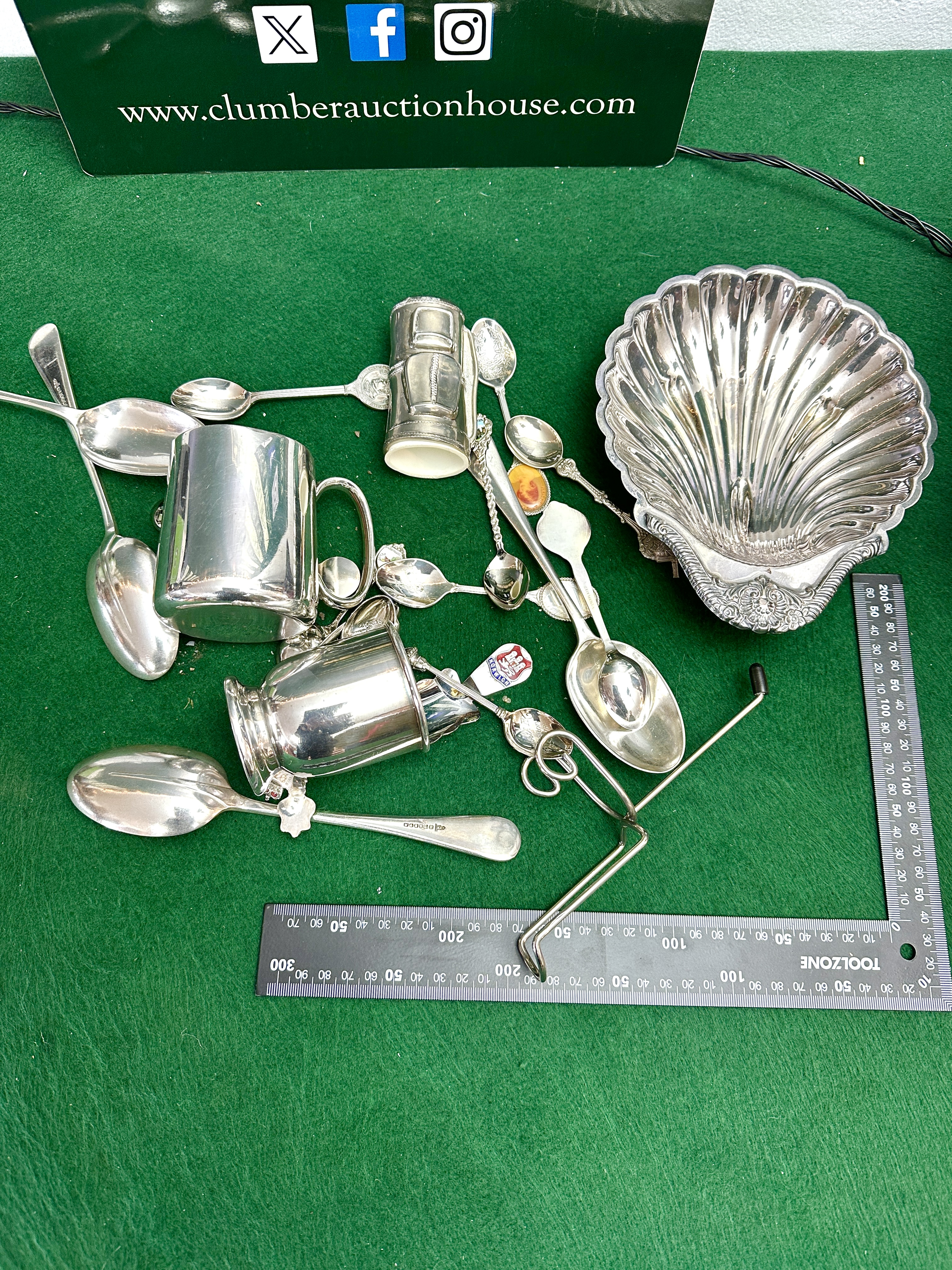 The provided image and associated data sources do not contain any visible automotive vehicle, VIN, registration plate, or related components necessary for a standard vehicle cataloguing process. The image depicts a collection of domestic metallic serving items and measuring tools laid out on a green felt surface, with an advertising sign for Clumber Auction House visible at the top. As the core asset (a vehicle) is absent, the mandatory structured factual list (Make, Model, Year, Engine Capacity, etc.) cannot be compiled.