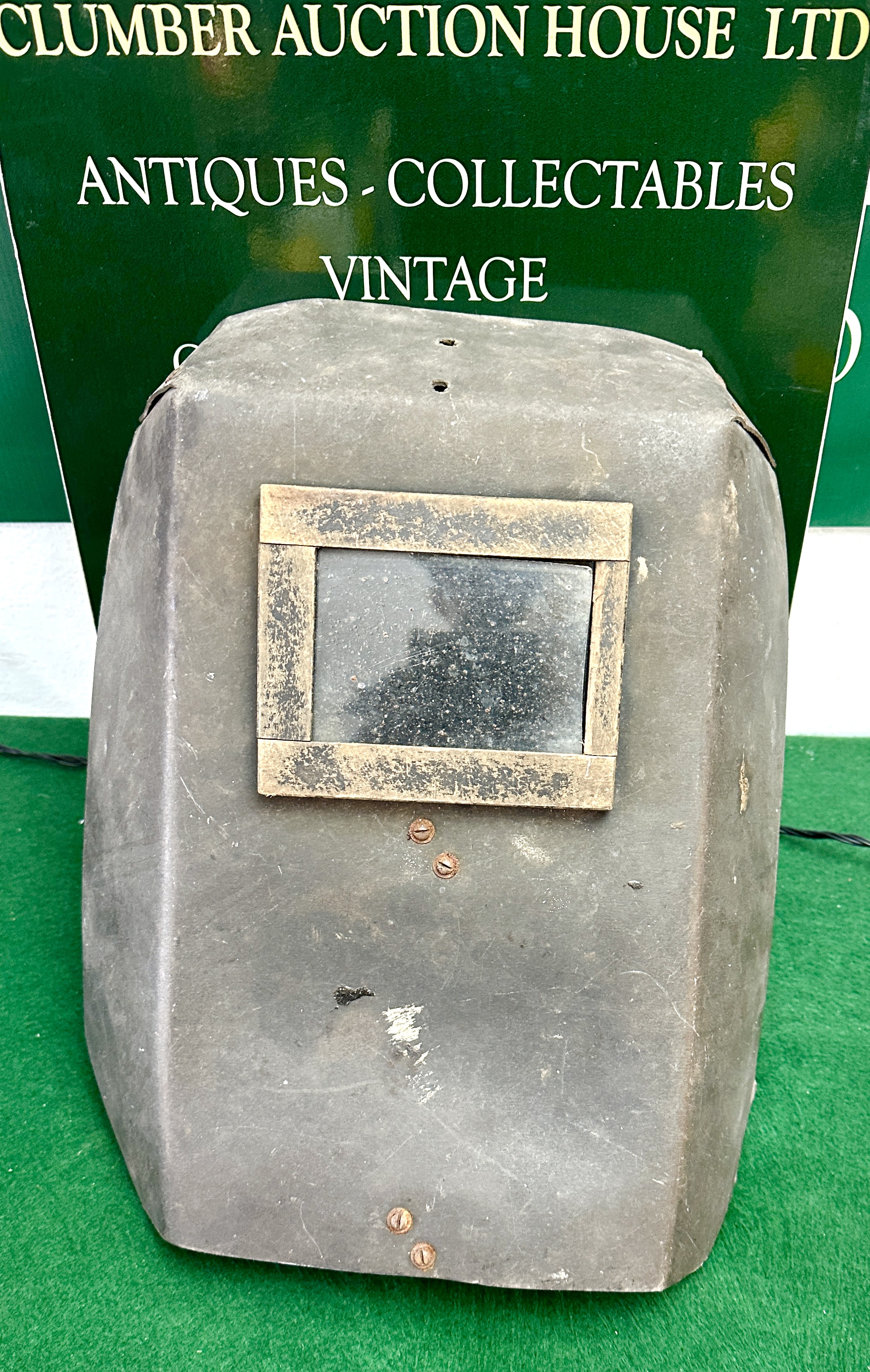 This is a vintage industrial protective welding shield, comparable to early handheld designs used in heavy industry. The shield features a large, concave body constructed from heavy-gauge material, secured by numerous rivets along the edges and structure. It retains its original rectangular viewing aperture fitted with a dark glass lens, secured by a simple frame with brass-colored fixings. The shield is equipped with a vertical wooden handle for handheld operation. The piece exhibits heavy patina consistent with significant industrial use, making it a desirable industrial artifact for collectors.