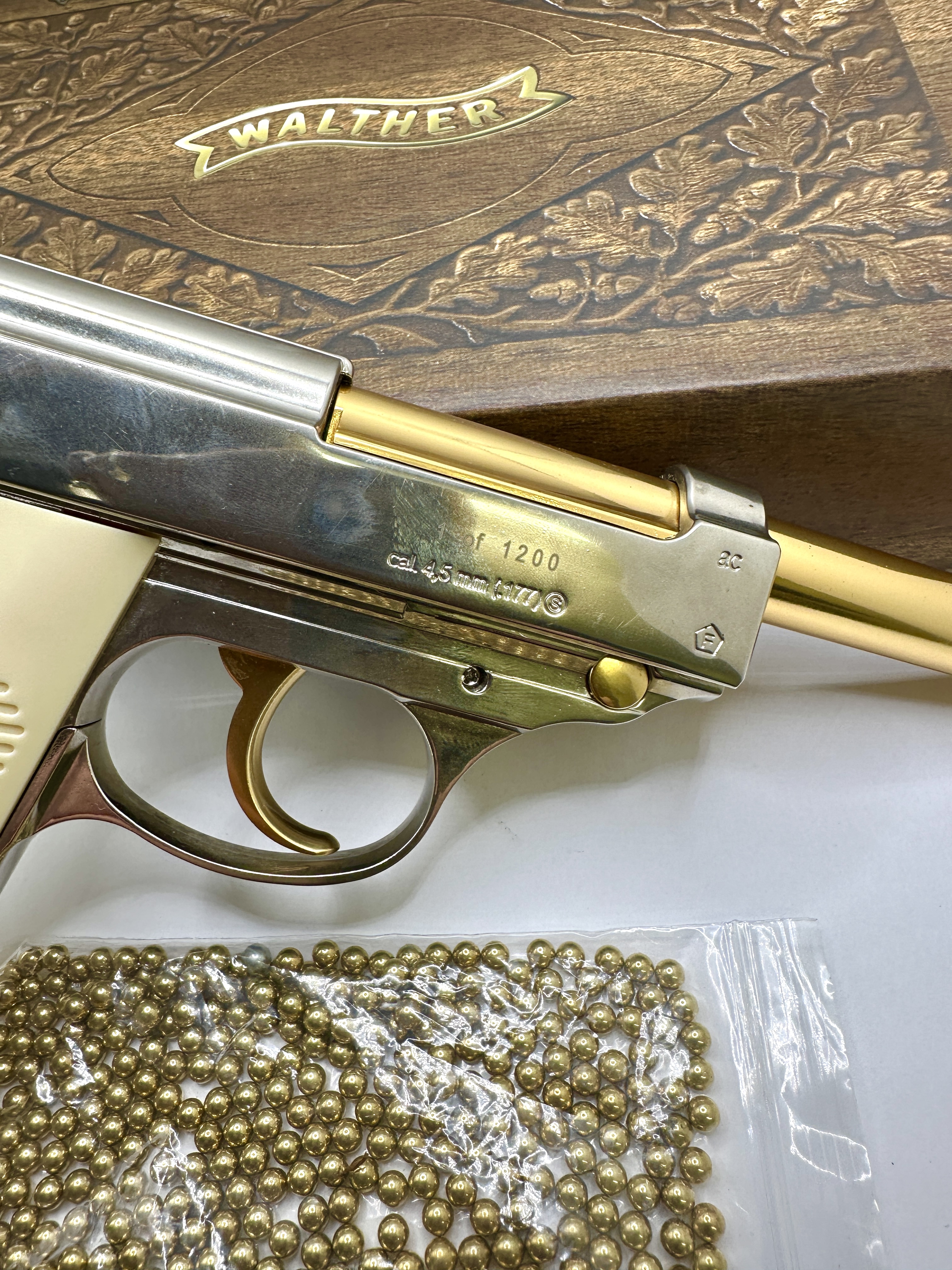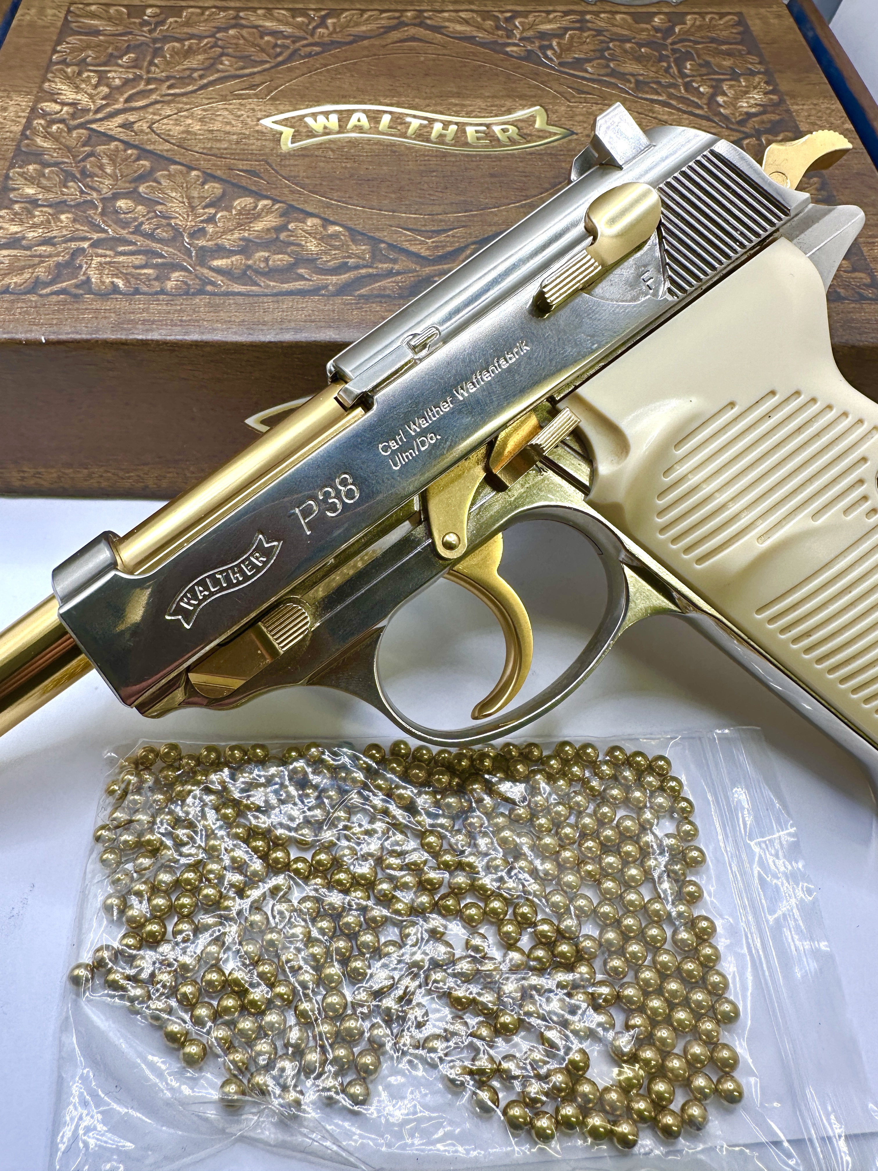 This item is a highly detailed, two-tone replica of the classic Walther P38 pistol, designed to fire 4.5 mm (.177 caliber) spherical BBs using a CO2 power source. The pistol features a polished silver or chrome finish on the main slide and frame, contrasted by extensive gold plating on components including the barrel, trigger, hammer, and safety lever. The grips are a light ivory or cream-colored plastic with vertical ribbing. The left side of the slide bears the full manufacturer mark Carl Walther Waffenfabrik Ulm/Do. P38. The pistol is offered complete with a highly detailed, ornately carved wooden presentation case featuring the Walther logo, and includes a clear plastic bag containing gold-colored spherical BB ammunition.