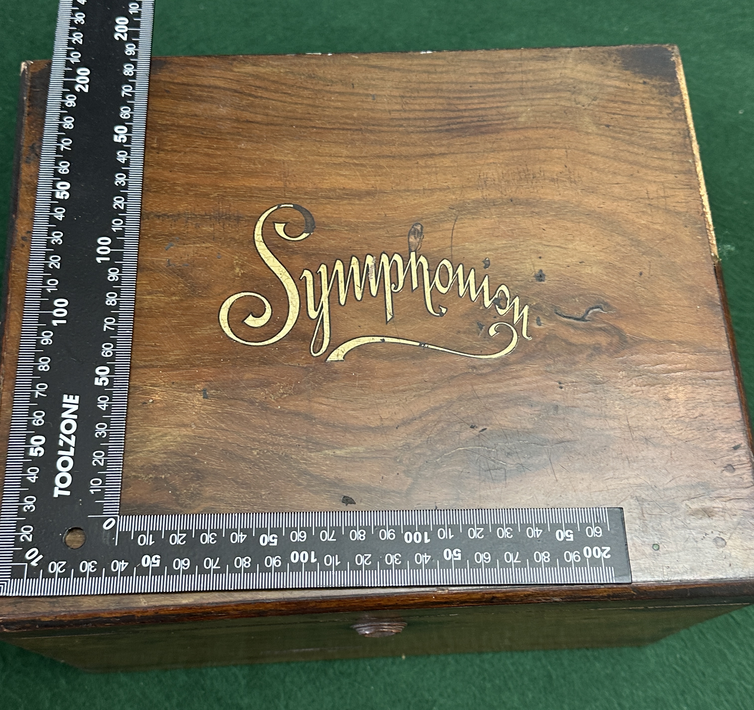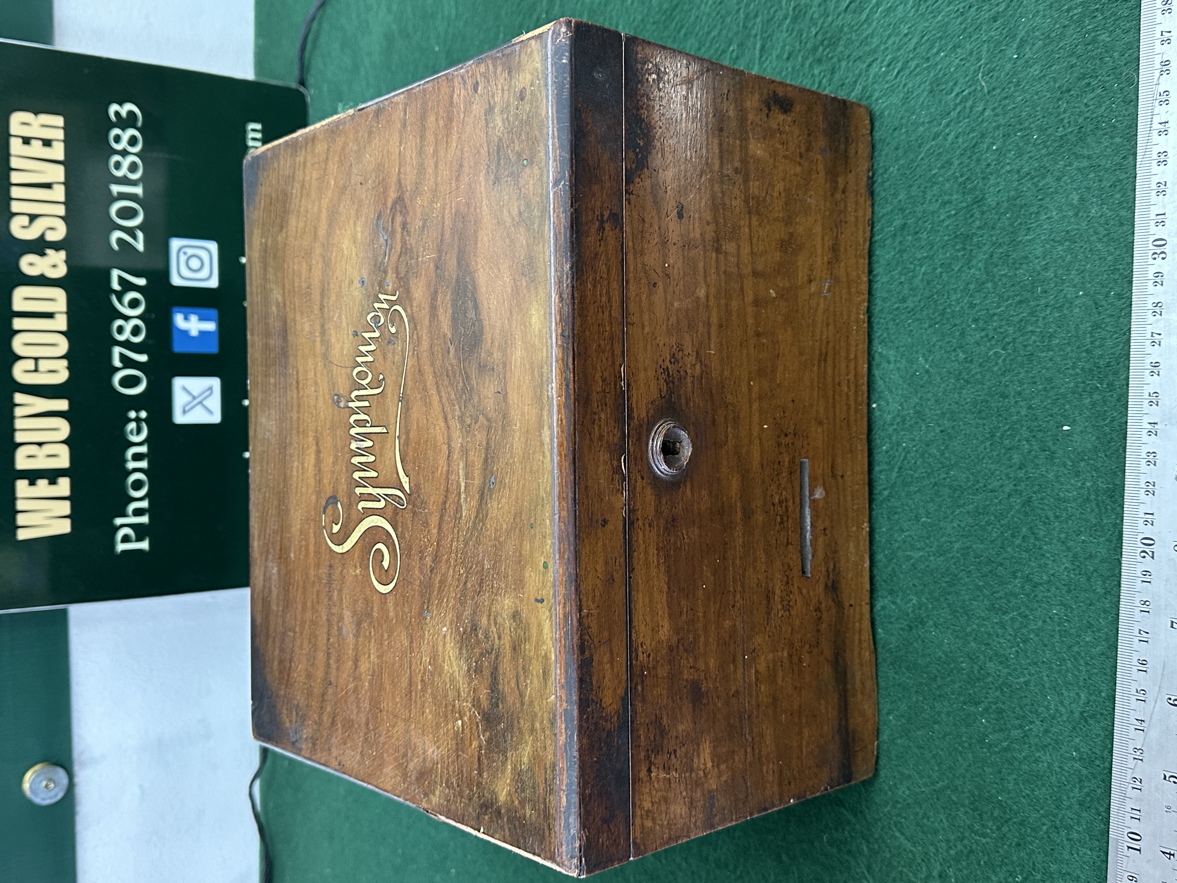 This lot comprises an antique wooden cabinet box marked “Symphonion,” likely dating to the late 19th century and originally intended to house a disc music mechanism, though the mechanism is currently absent. The box features a dark reddish-brown wood stain finish with decorative gold script lettering on the lid. The interior lid features a black-and-white print of cherubs playing instruments. The box is currently filled with a large quantity of miscellaneous costume jewelry, including imitation pearl necklaces, various colored glass and stone beads, metal chains, and two circular cased items identified as medallions or coins, one referencing a bank saving institution.