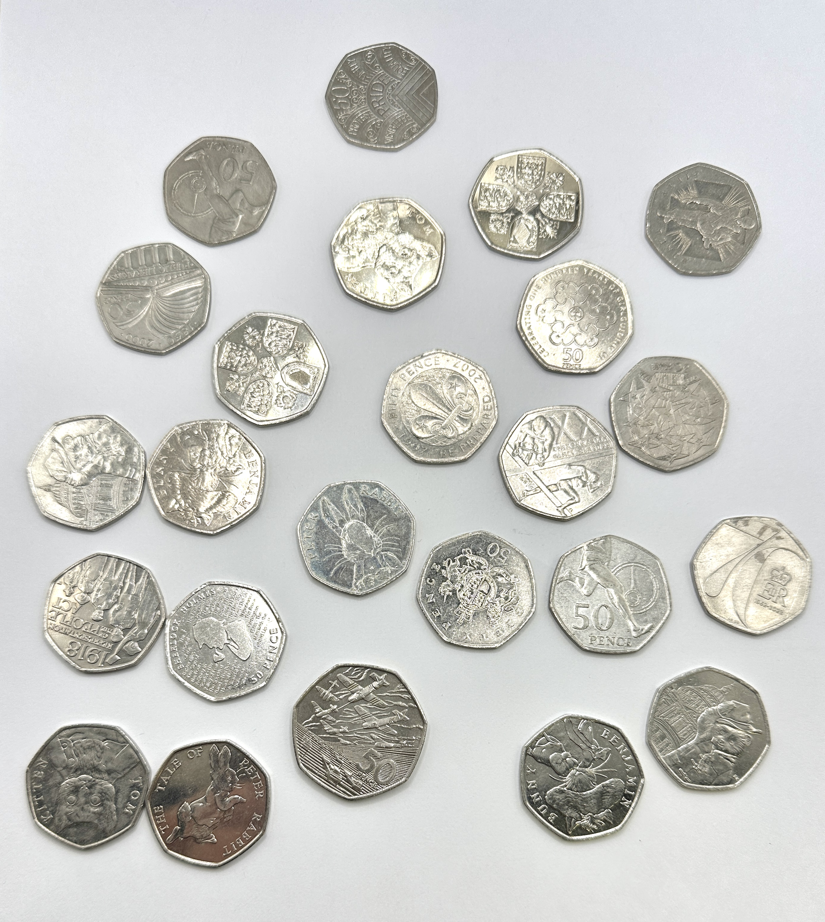 This lot comprises a collection of approximately 25 British 50 pence coins, featuring various commemorative designs released into circulation by the Royal Mint. The collection includes several highly sought-after themes such as the Beatrix Potter series (including Peter Rabbit, Tom Kitten, and Benjamin Bunny), various London 2012 Olympic designs (cyclist, runner), and historical commemoratives (Representation of the People Act 1918, Scouting 100th Anniversary 2007, Battle of Britain). The coins span multiple years, with visible dates including 2000, 2002, 2007, and designs referencing events up to 2012. This collection offers a diverse cross-section of modern British numismatic history. Note: The item presented is a collection of coinage and not a motor vehicle; therefore, standard automotive specifications are not applicable.