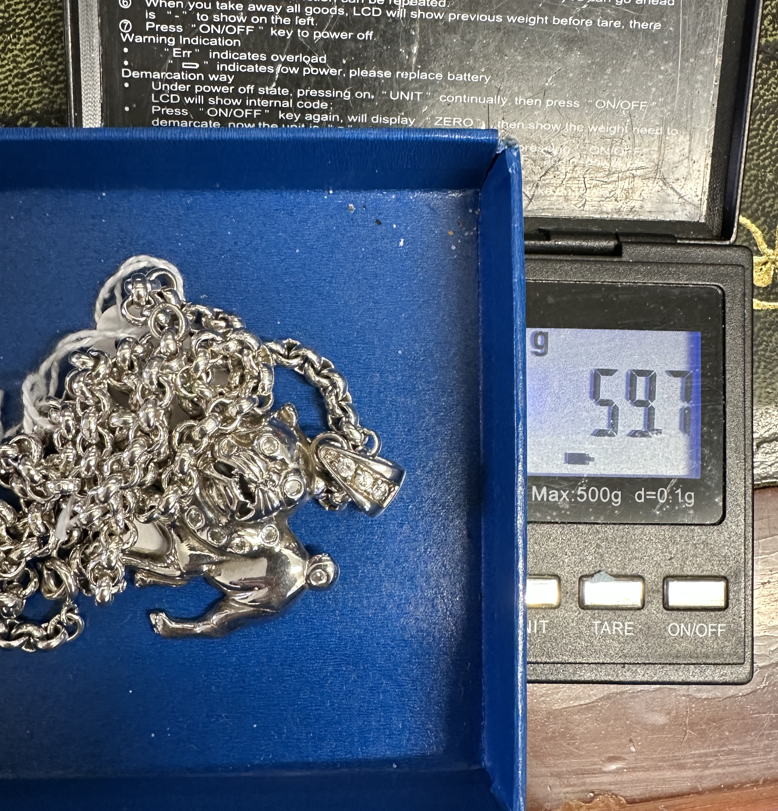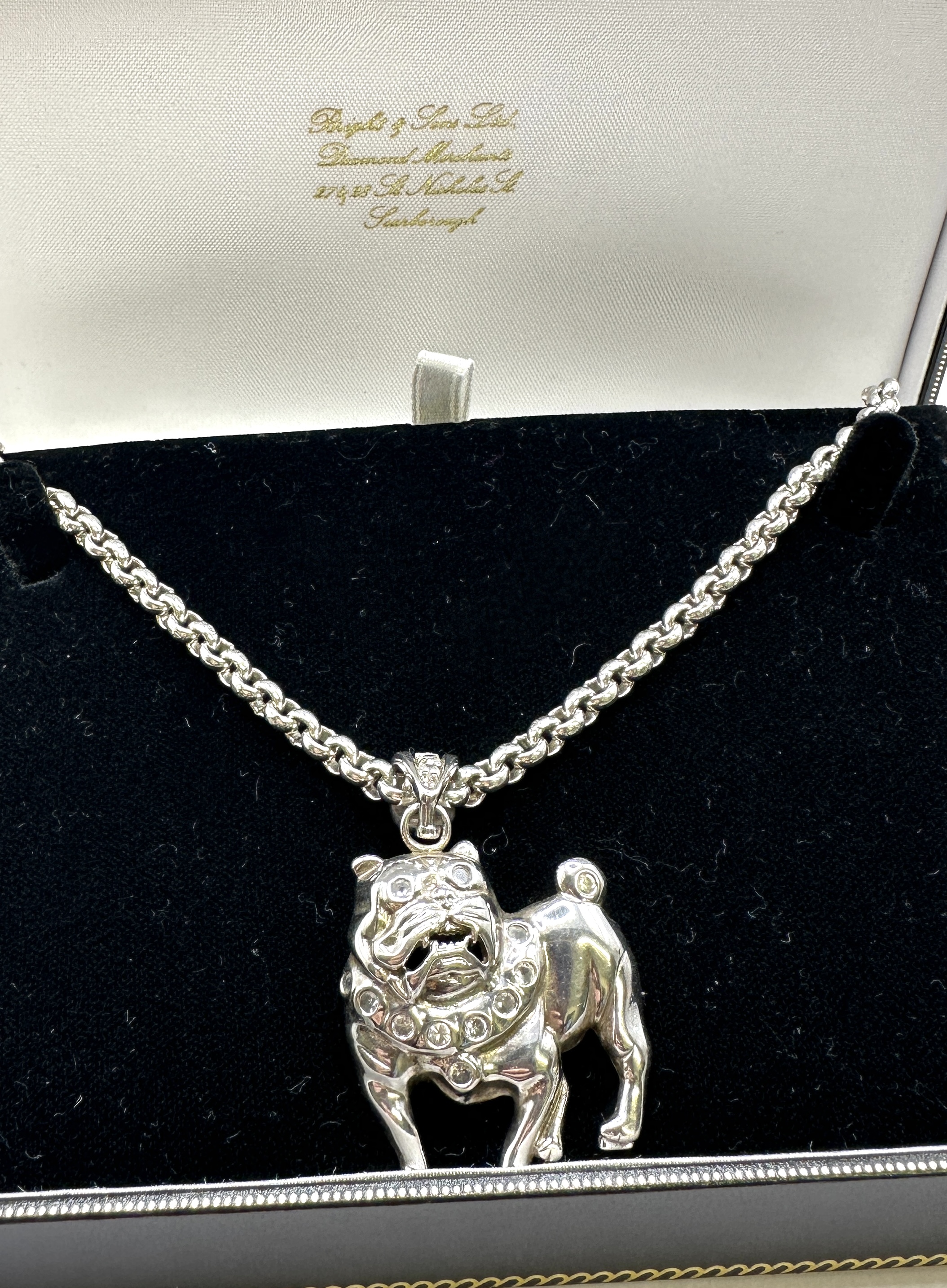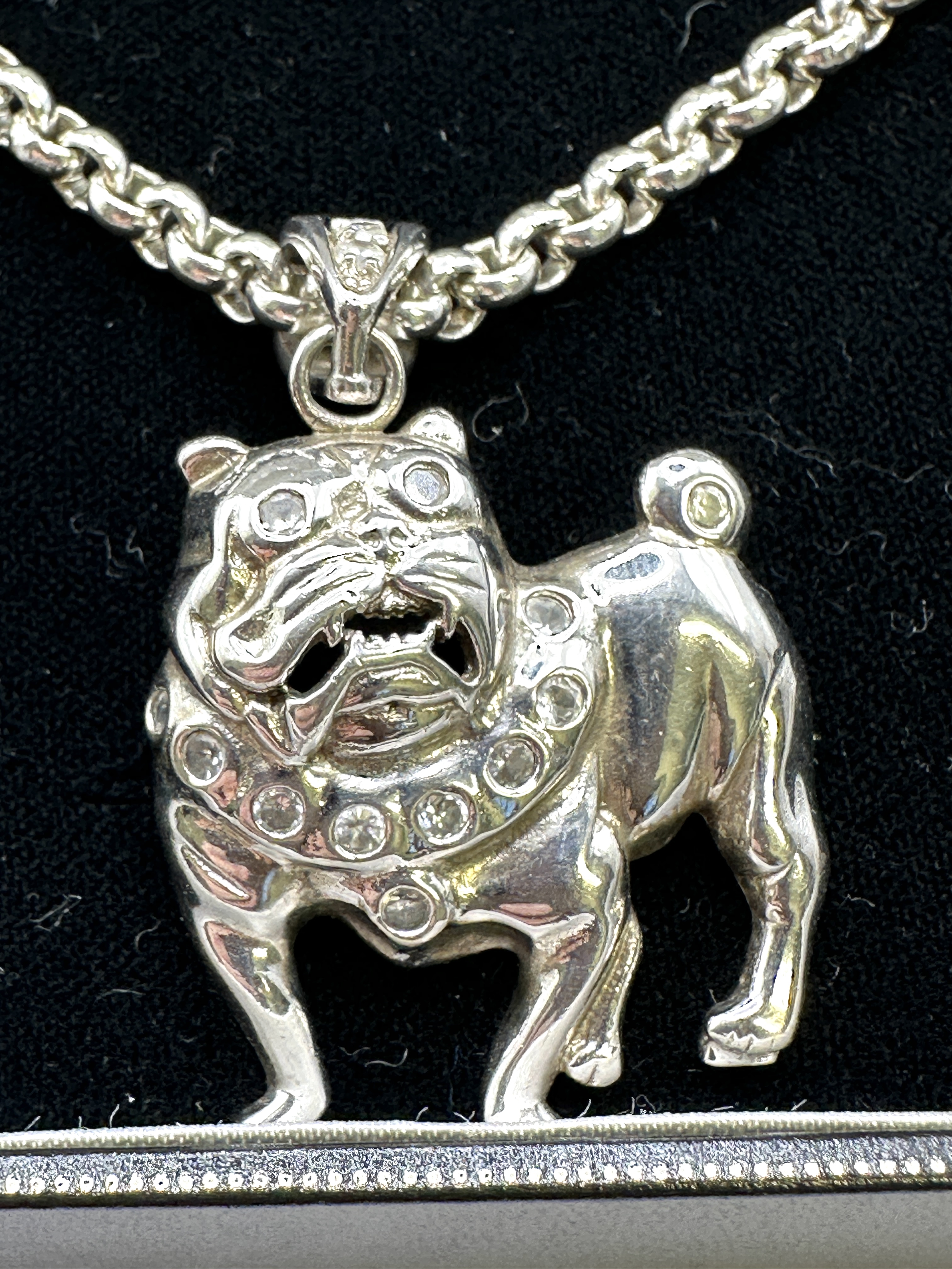 A single necklace featuring a substantial figural bulldog pendant crafted from 925 silver. The pendant is modeled as a standing bulldog with highly detailed features, including pronounced folds and an expressive face. The design incorporates numerous small, round, colorless stones, consistent with Cubic Zirconia (CZ) simulants, set in a collar-like arrangement around the neck and highlighting the tail area. The pendant is suspended from a heavy, uniform link chain. The item is presented in a black velvet-lined box bearing the inscription Dyball & Son Ltd / Diamond Merchants / 27 & 28 St. Nicholas St. / Scarborough.