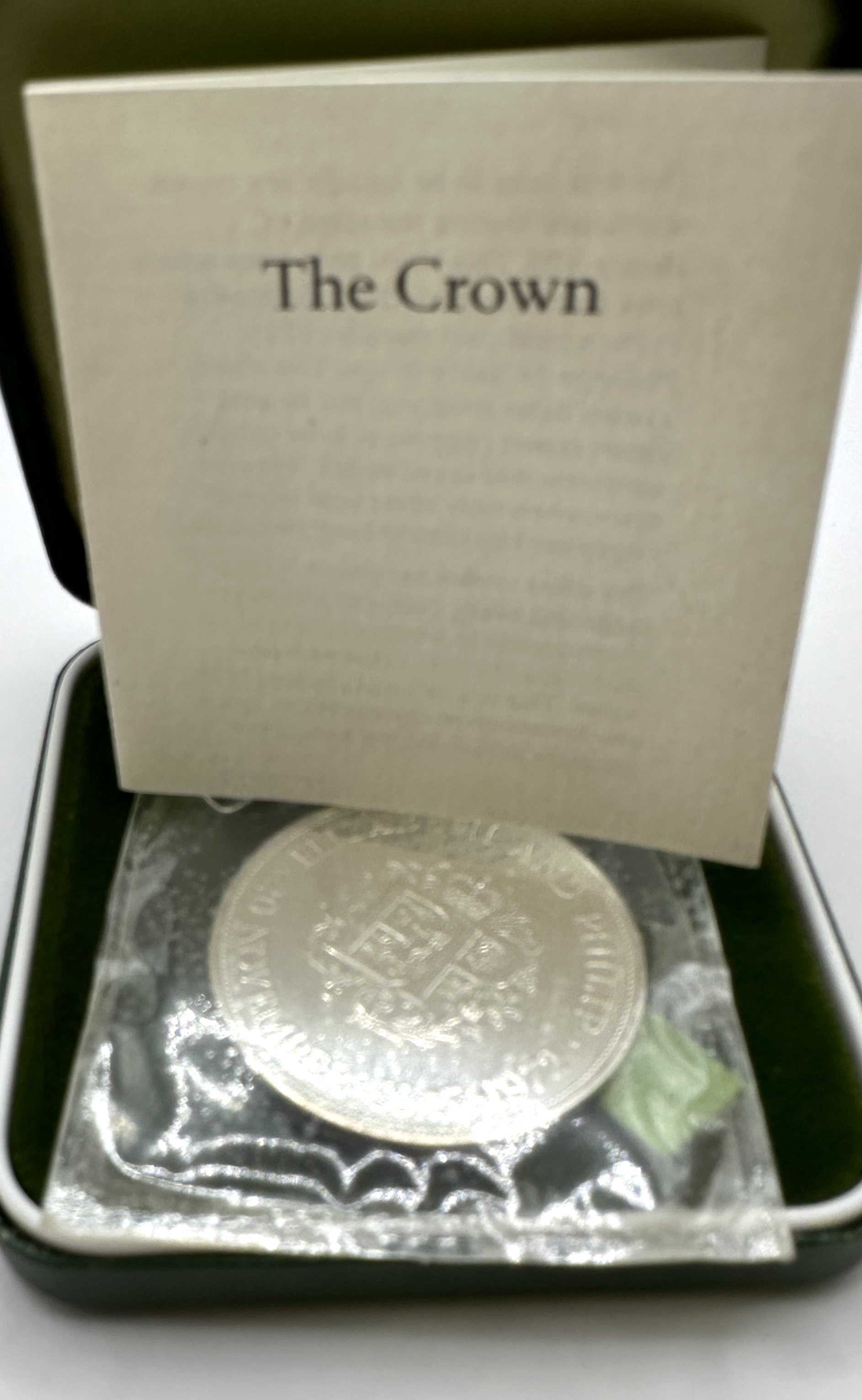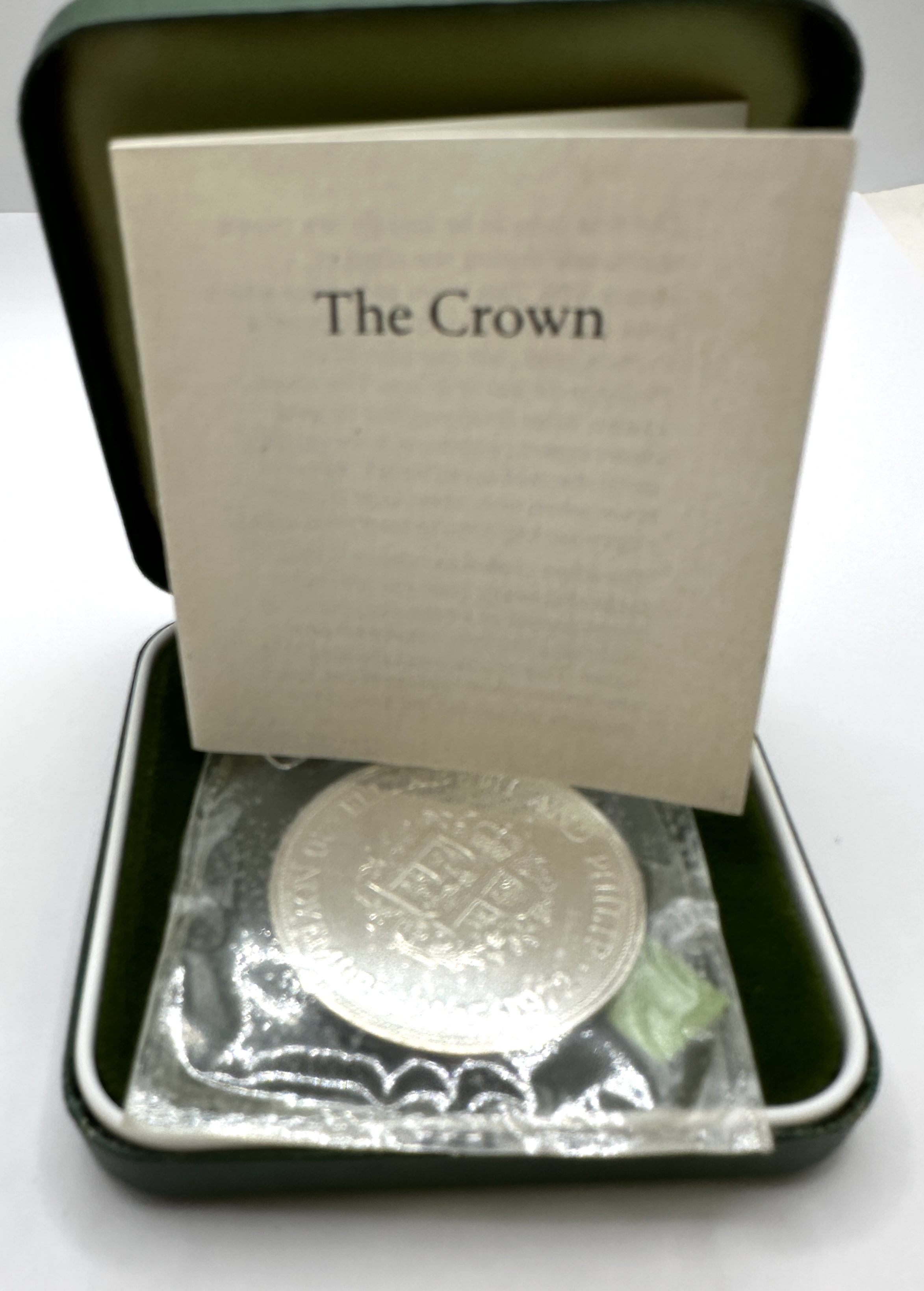 A 1972 Silver Proof Crown coin, issued to commemorate the 25th Wedding Anniversary (Silver Wedding) of Queen Elizabeth II and Prince Philip. The coin is presented in its original dark green hinged display case and includes the original light tan informational card titled “The Crown.” The round, silver-toned metal coin is sealed within a clear plastic sleeve, consistent with its Proof designation. The obverse or reverse design features a central motif of quartered shields overlaid with crowns. The visible legend around the perimeter includes the inscription “ELIZABETH II D G REG F D” and the names “AND PHILIP,” confirming the subject and monarch.