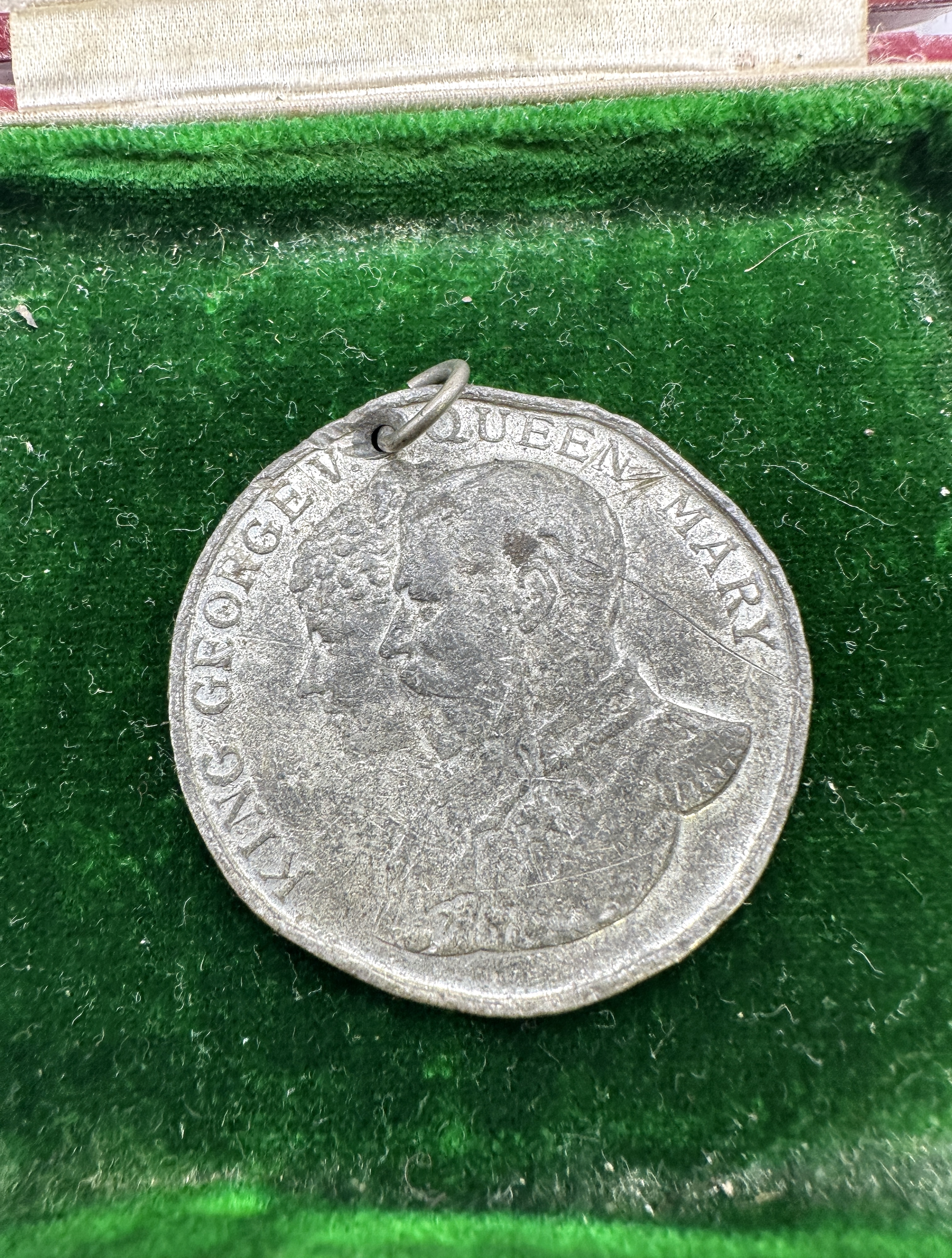 A commemorative medal struck for the 1935 Silver Jubilee of King George V and Queen Mary. The circular medal is constructed of a gray base metal and features a suspension ring. The obverse displays the conjoined profile busts of the King and Queen, encircled by the inscription KING GEORGE V QUEEN MARY. The reverse features heraldic elements above the inscription TO COMMEMORATE THE SILVER JUBILEE OF KING GEORGE V & QUEEN MARY MAY 6TH 1935. The medal is housed in its original hinged presentation case, which has a reddish-brown exterior. The interior base is lined with green velvet, and the lid is lined with cream silk, stamped in gold with the retailer’s information: DANCE & DUERDEN. GOLDSMITHS & SILVERSMITHS 84 QUEEN ST MORLEY, YORKS.