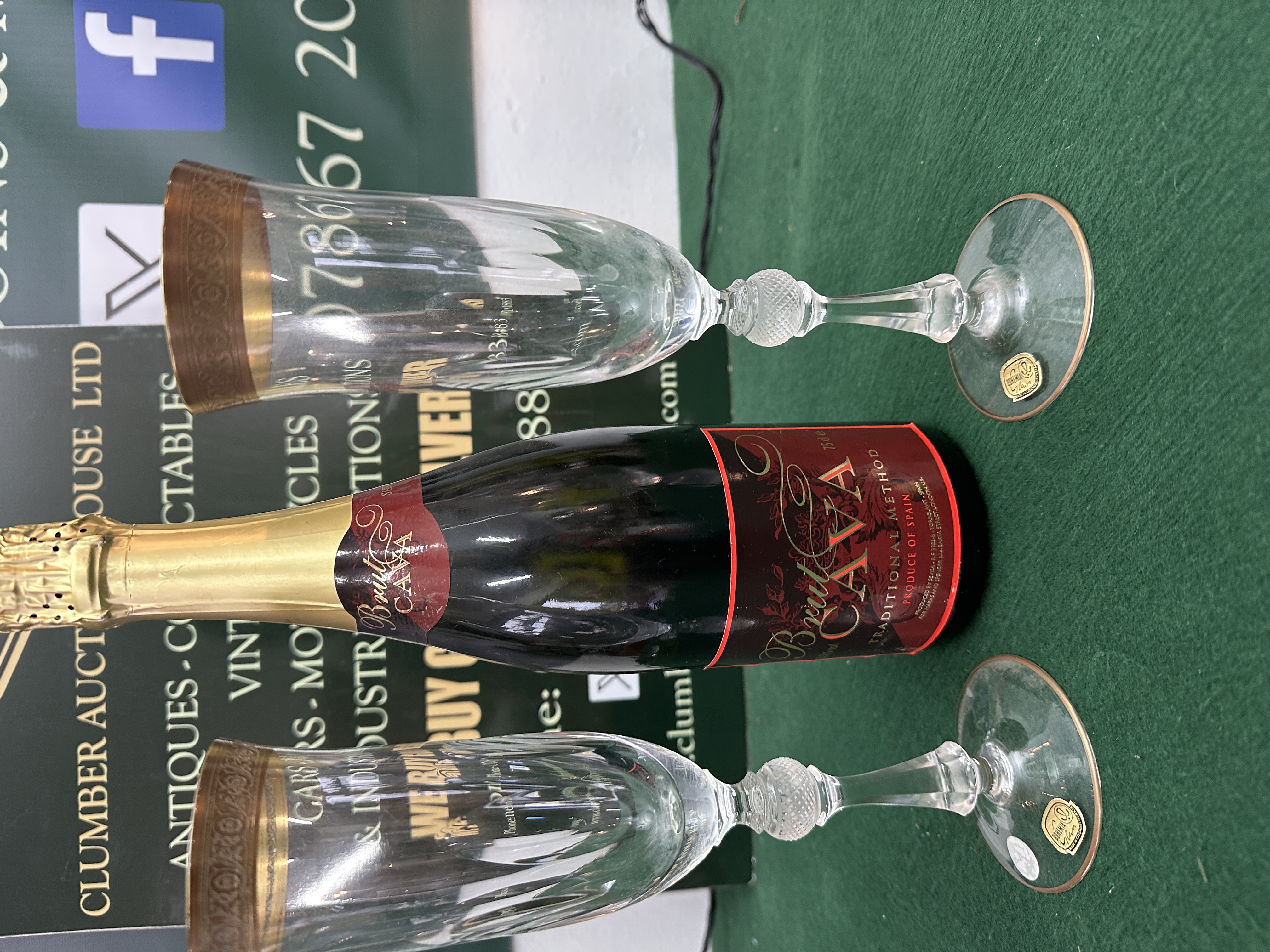 A collection of three items comprising a pair of cut crystal champagne flutes and one sealed bottle of Spanish sparkling wine. The flutes are clear glass or crystal, featuring tall, faceted bowls and ornate stems. The stems include a deeply cut diamond-patterned central knop. The rims of the flutes are encircled by a wide band of decorative gold gilt. A gold foil label visible on the base of the flutes identifies them as “Bohemia Czechoslovakia.” The accompanying bottle is 75cl, dark glass, sealed with a gold foil closure, and features a red and black label identifying the contents as “Brut Cava,” produced in Spain using the Traditional Method. The label indicates the product is produced by Sevillana.