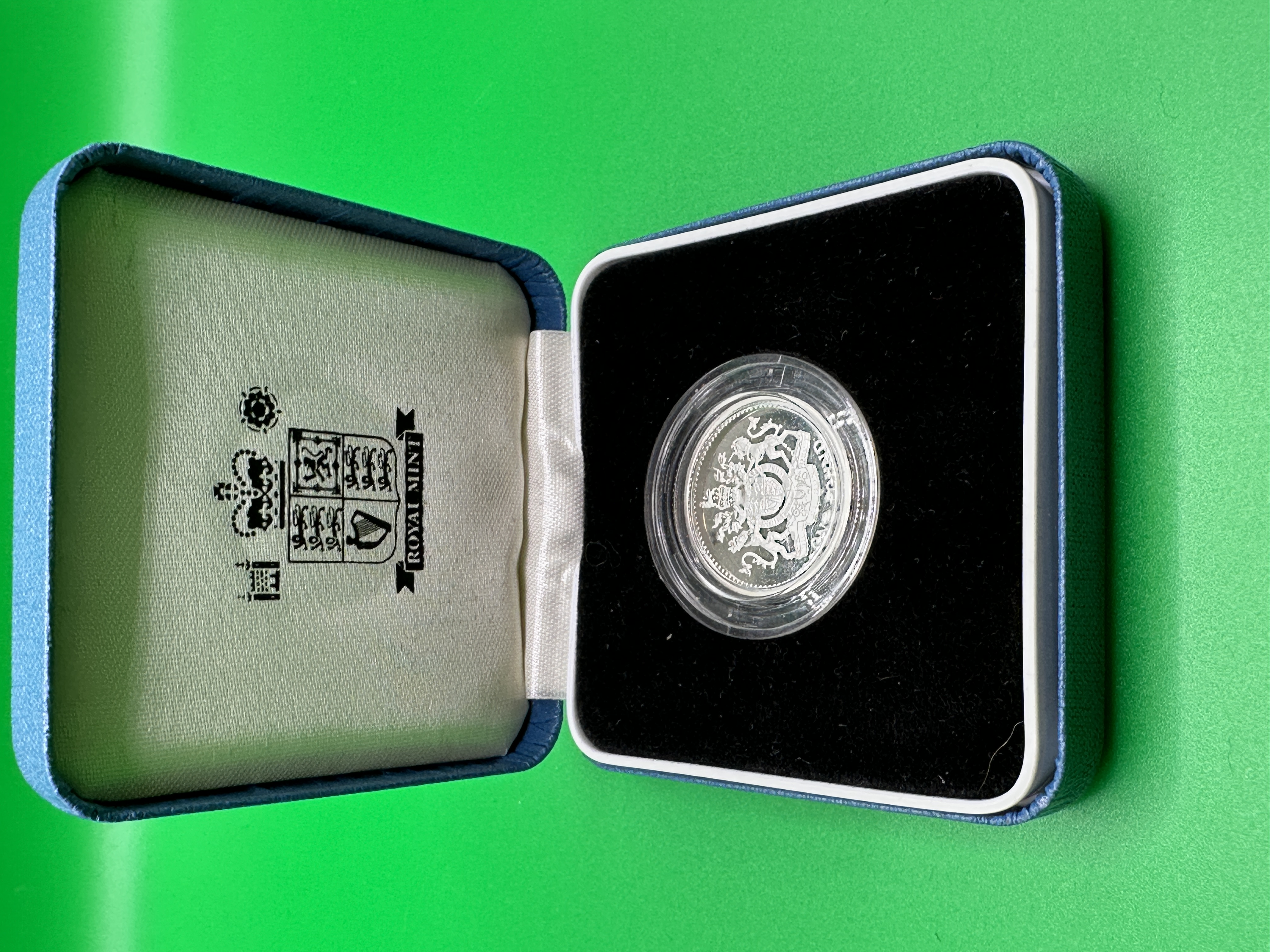 This lot features a Royal Mint proof coin, confirmed to be struck in 925 silver. The coin is secured within a clear protective capsule and presented in its original dark blue hinged case. The case lid features the Royal Mint crest and name printed on the cream satin lining, while the base utilizes a black velvet insert to showcase the coin. The coin displays the detailed UK Royal Coat of Arms. The specific denomination and year of issue are not visible or confirmed.