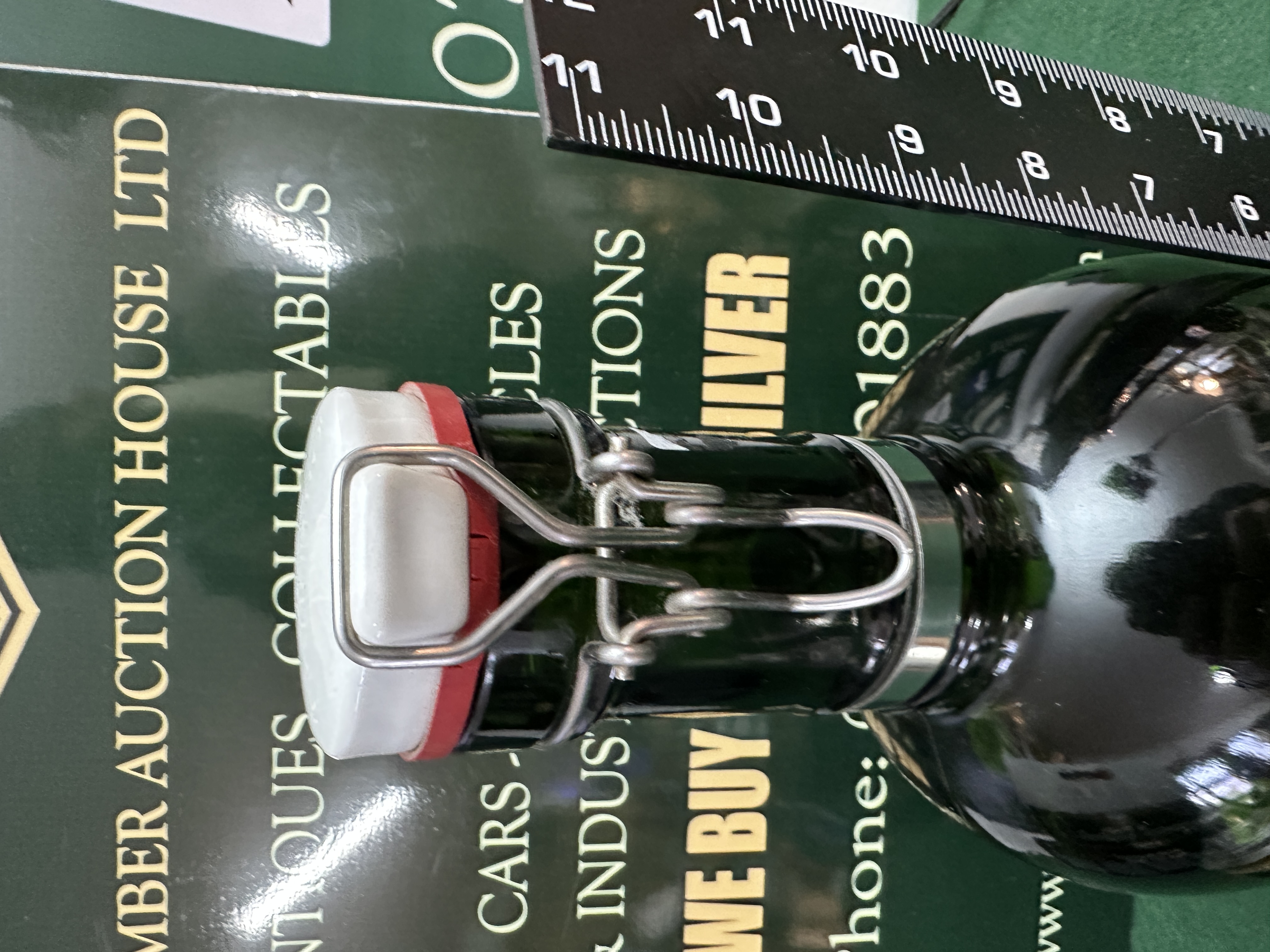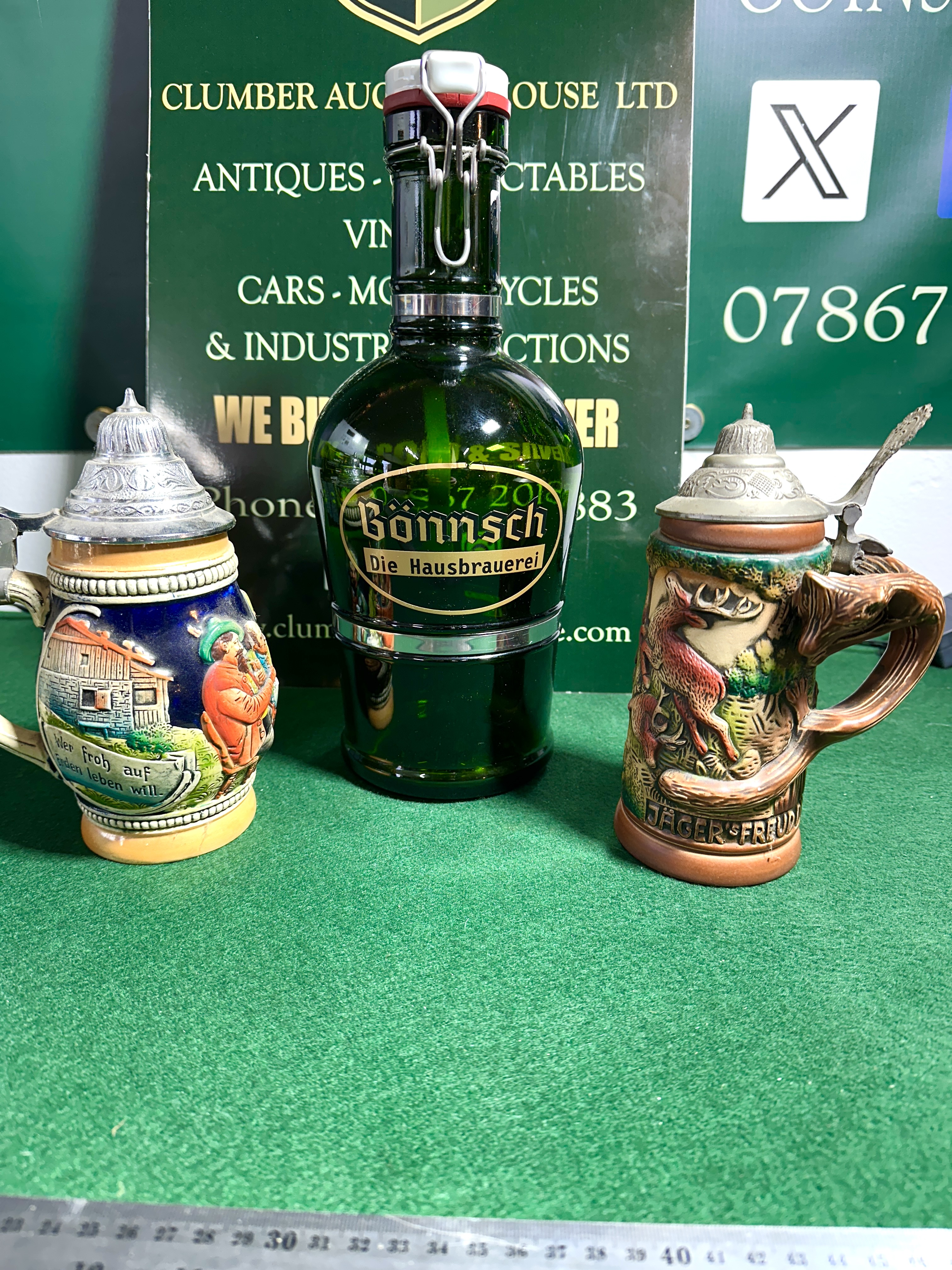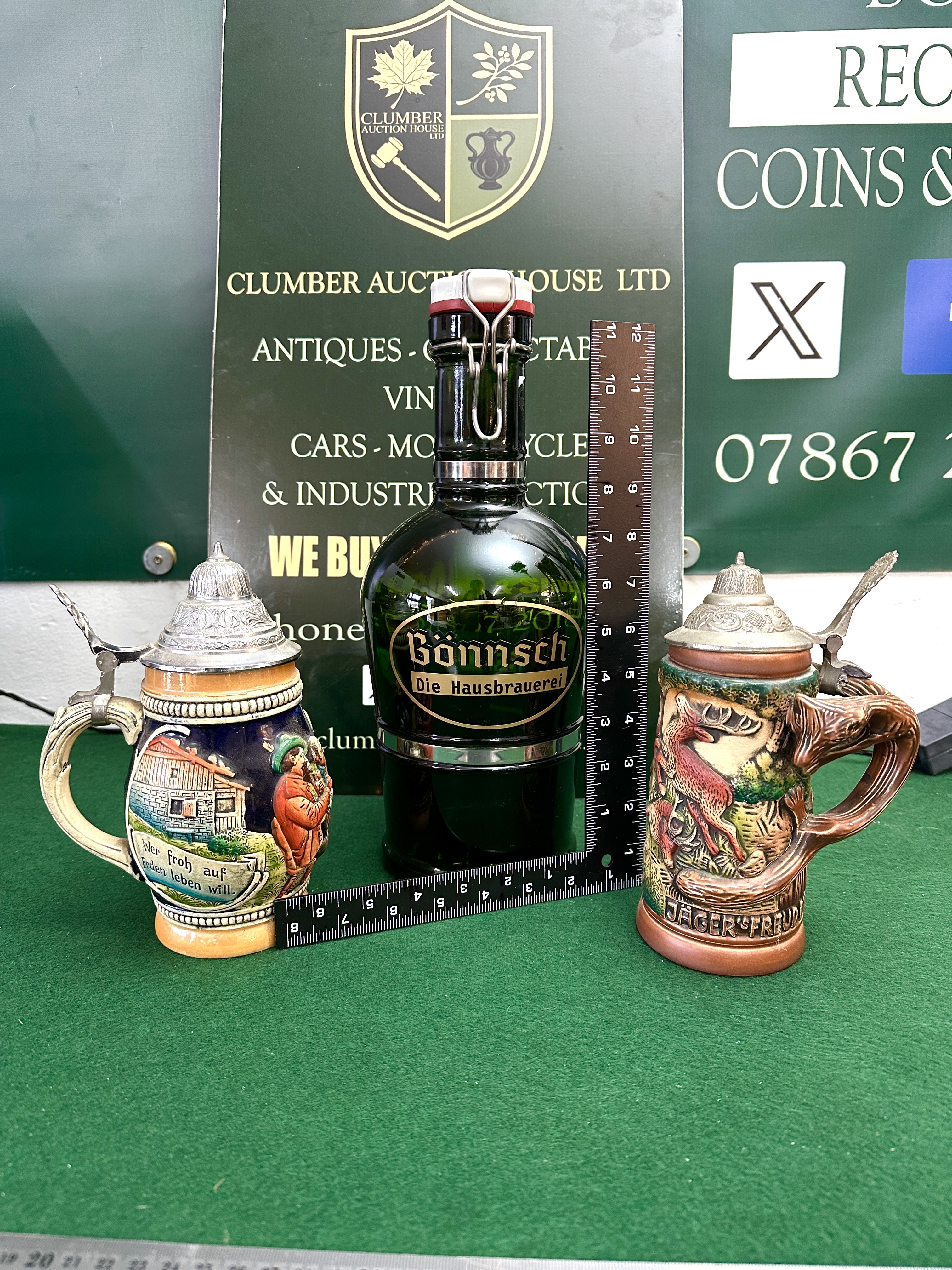 This lot comprises three items of German beer memorabilia. The central item is a dark green glass swing-top bottle, or growler, identified by raised glass lettering as “Bönnsch, Die Hausbrauerei” (The House Brewery), consistent with the Brauhaus Bönnsch in Bonn. The bottle is fitted with a metal swing-top closure secured by a white ceramic or porcelain stopper and a red gasket. Flanking the bottle are two miniature traditional German-style steins (Bierkrüge). Both steins are constructed of glazed ceramic or stoneware with detailed molded relief decorations and fitted with hinged pewter or base metal lids. The stein on the left features a rural scene with a figure and is inscribed “Wer froh auf leben will” (Whoever wants to live happily/cheerfully). The stein on the right depicts a hunting scene featuring a fox and deer and is marked “JÄGER FREUD” (Hunter’s Joy/Delight).