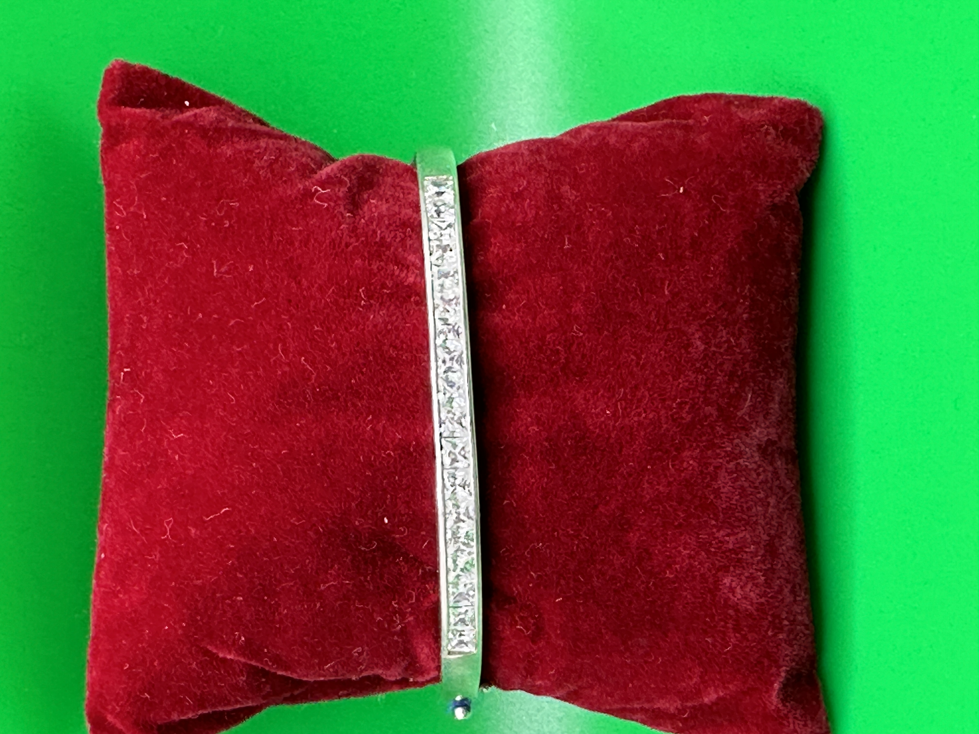 A contemporary bangle bracelet confirmed to be crafted from 925 silver. The design features a single row of clear, square-cut stones secured in a channel setting across the visible top surface of the band. The piece is photographed resting on a red velvet display cushion against a green background.