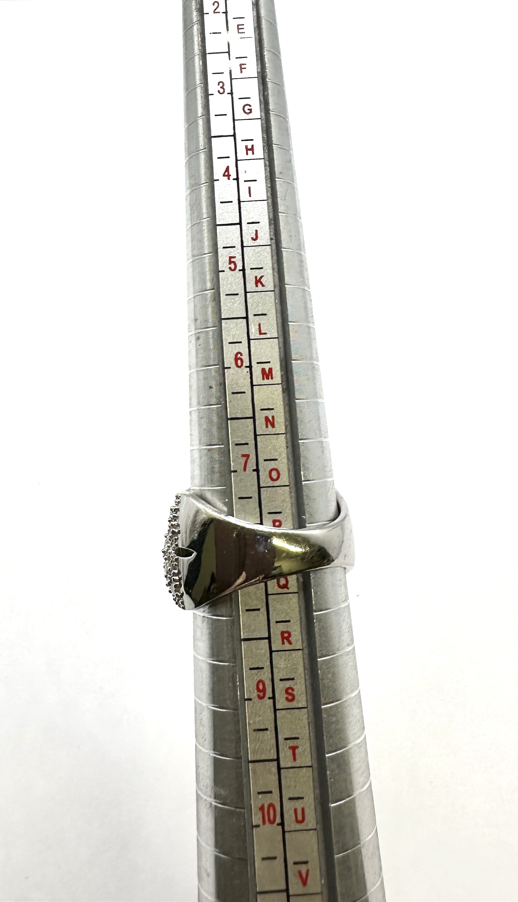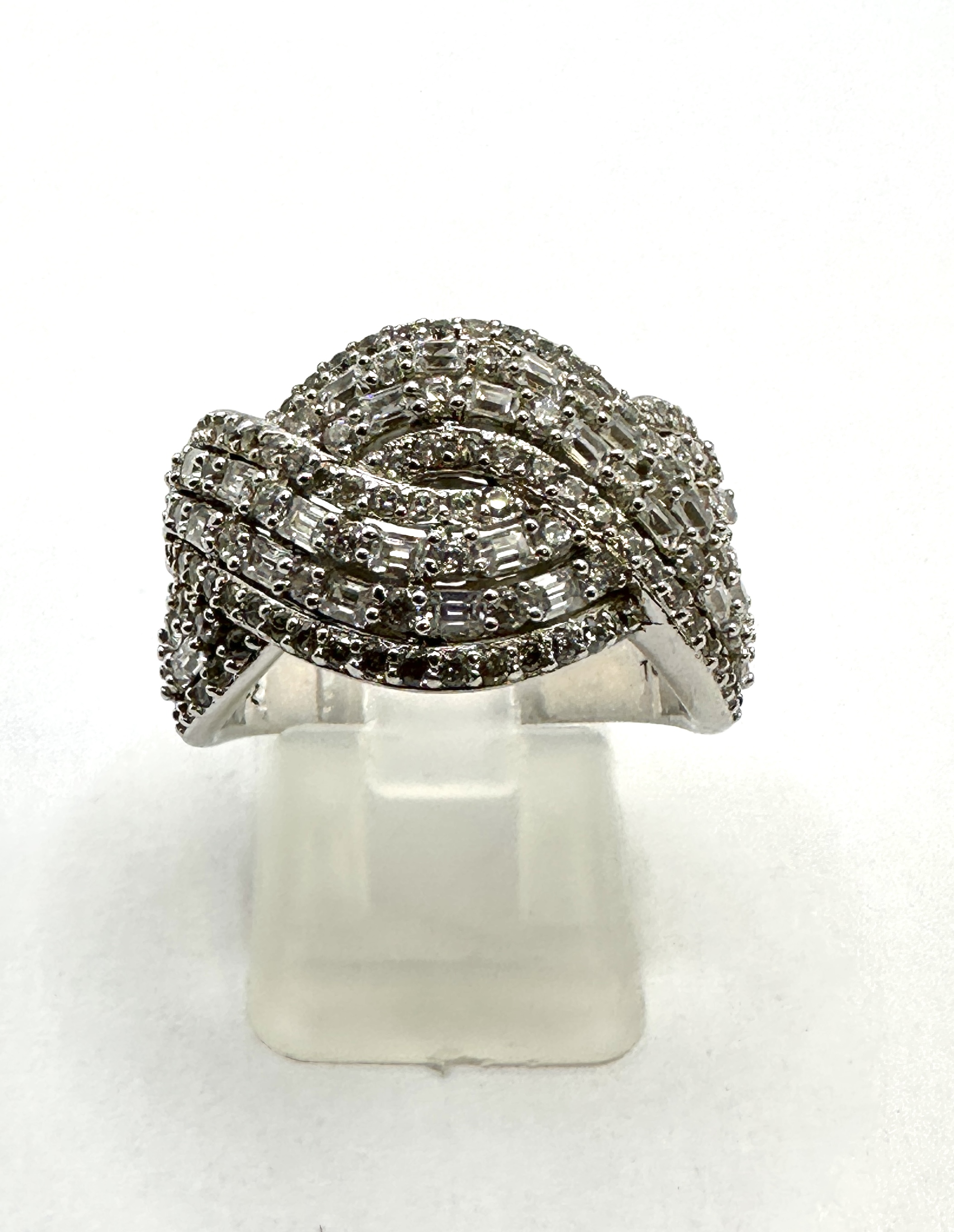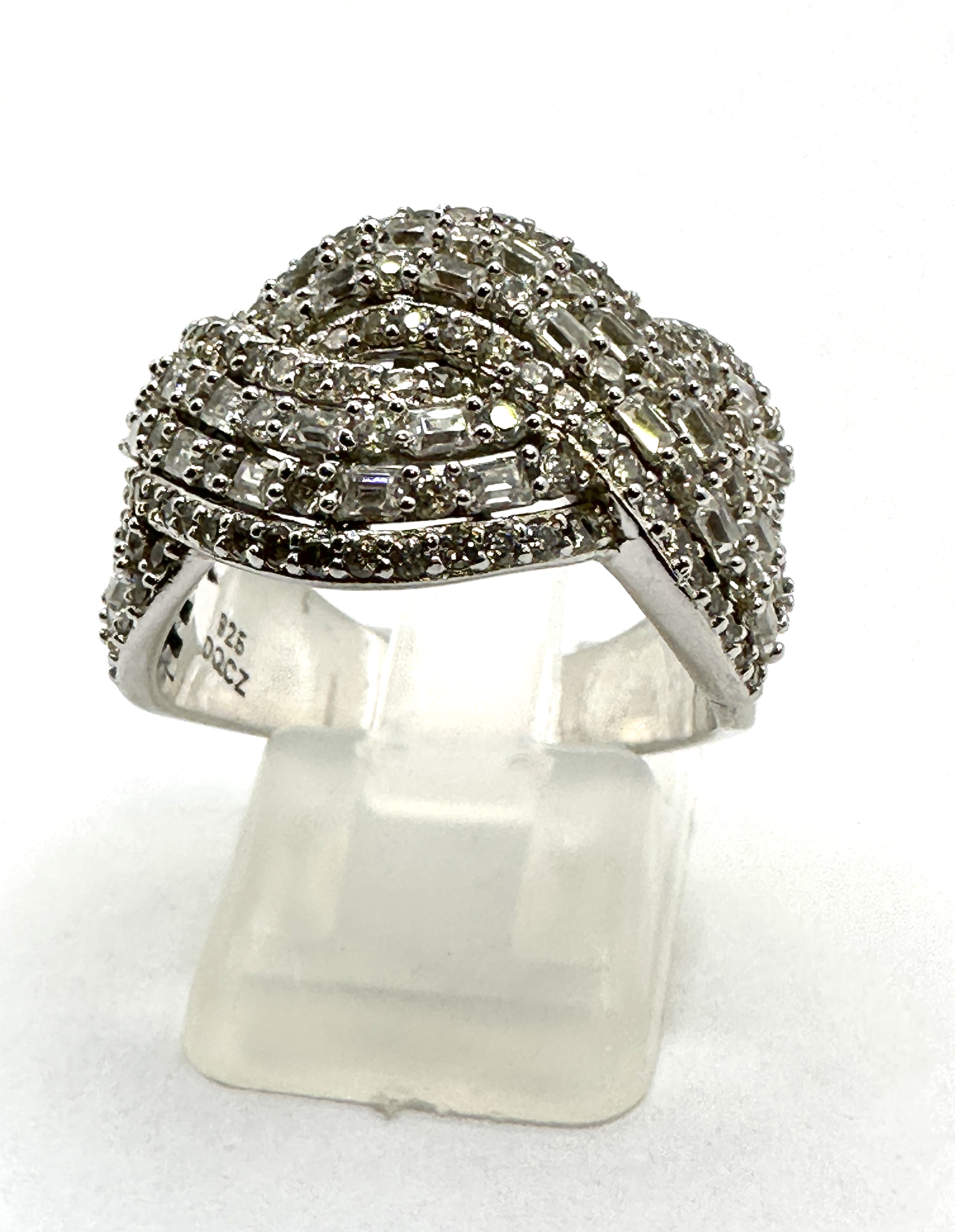 This lot contains a piece of jewelry, not an automotive vehicle. The item is a wide-band statement ring constructed of 925 silver, as confirmed by the inner band hallmark. The design features multiple intertwined rows forming a high dome, densely paved with clear, brilliant-cut stones in both round and baguette shapes. The secondary hallmark QDCZ suggests the use of quality cubic zirconia or similar simulants. The ring is sized approximately US 7.5 based on the measurement mandrel.