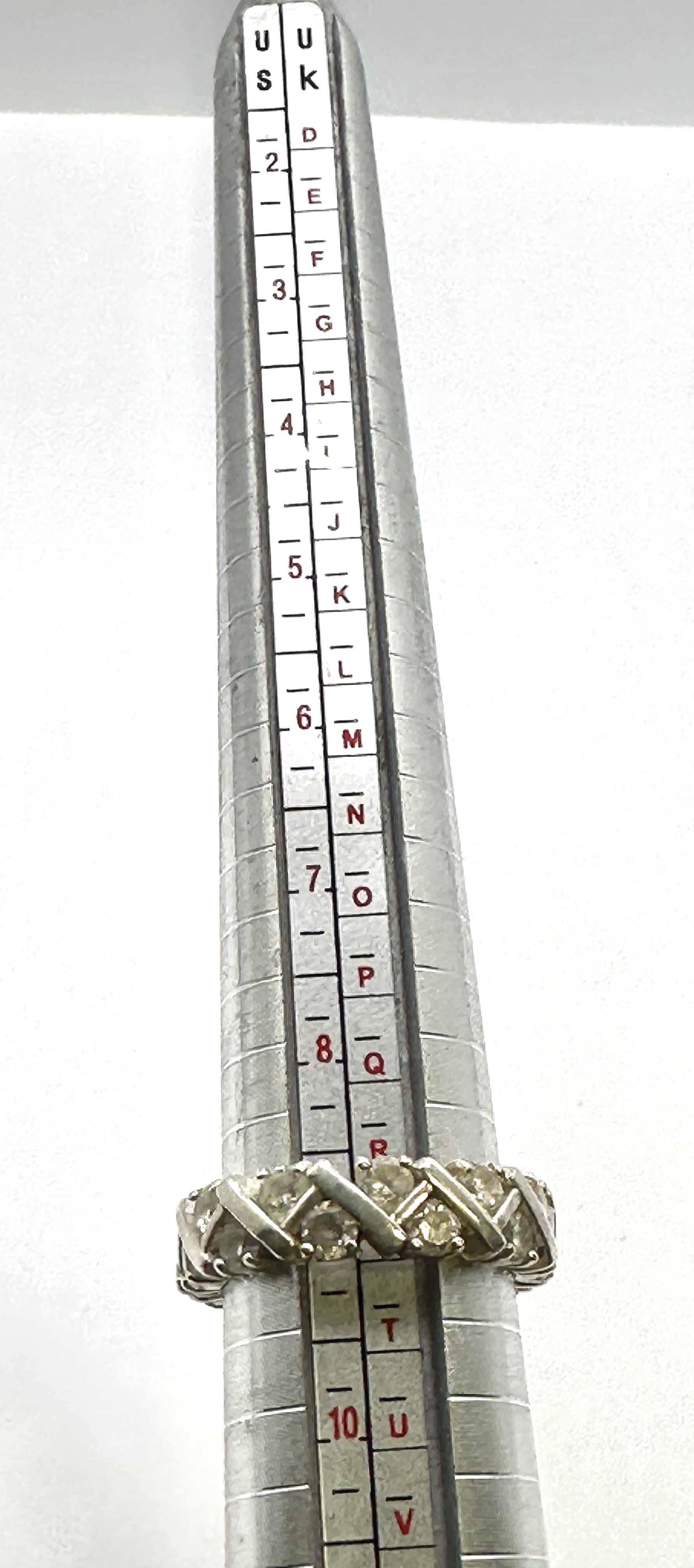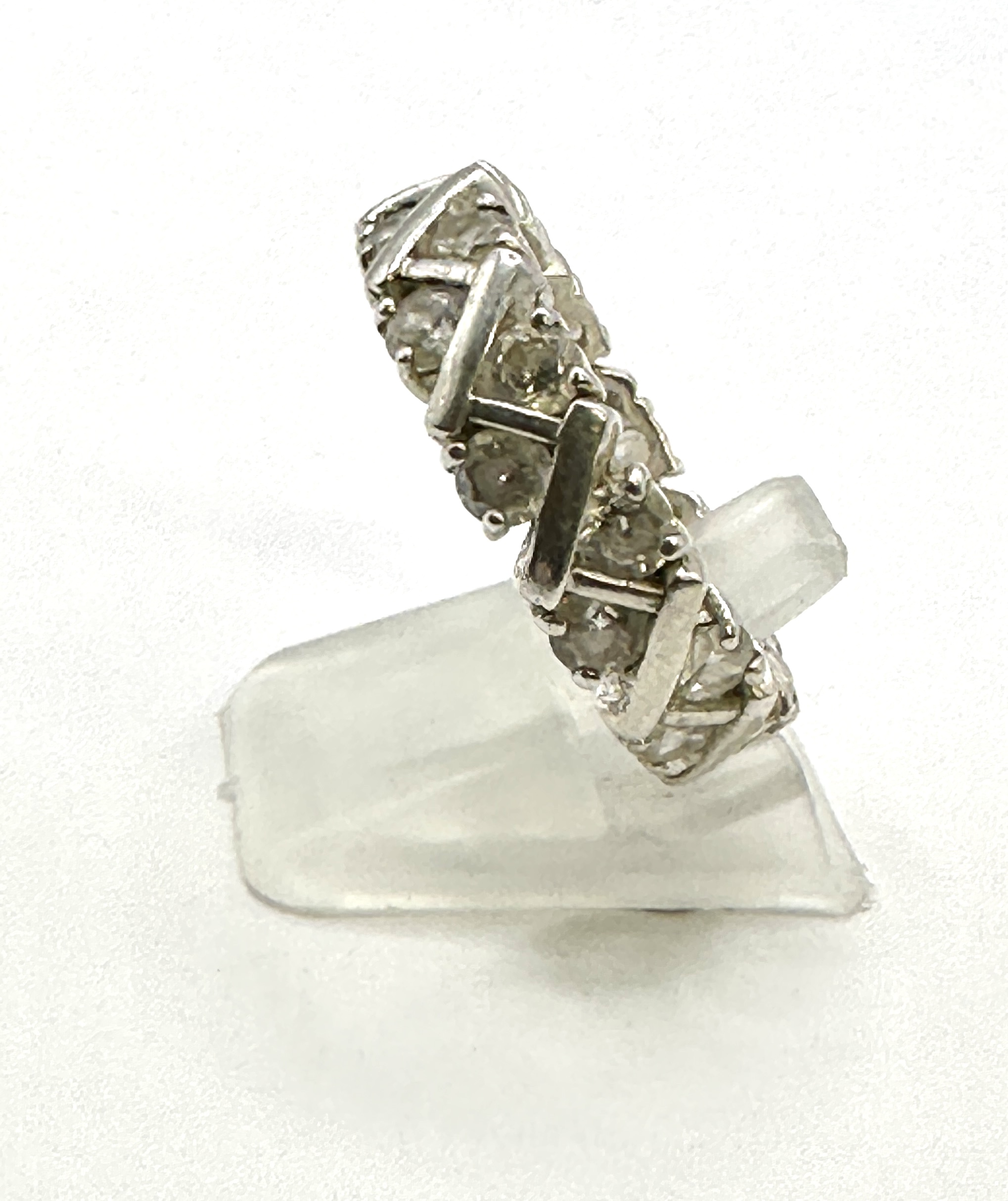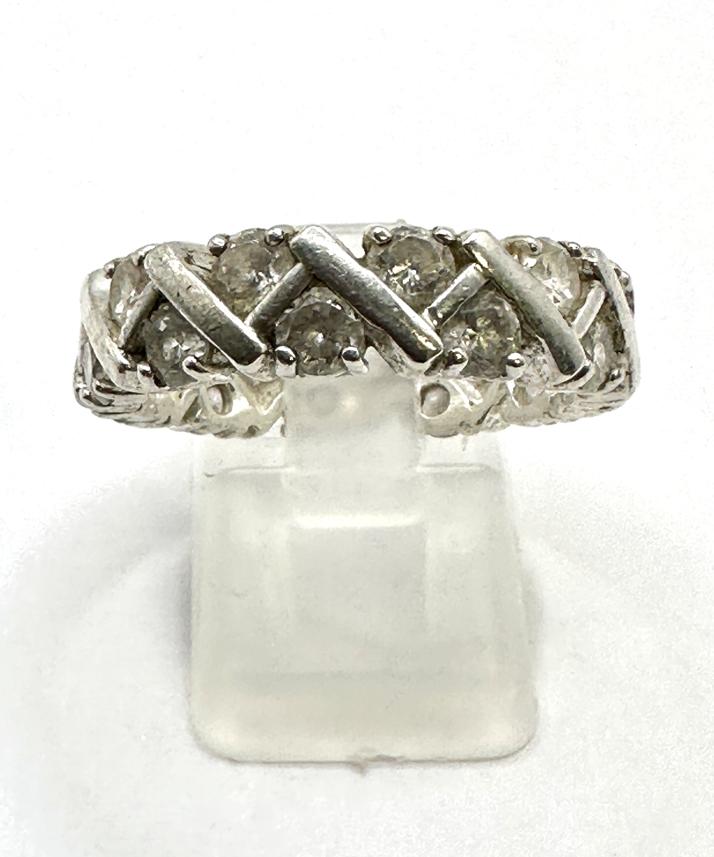This is a wide eternity band ring crafted from 925 silver, featuring a continuous repeating criss-cross or “X” pattern across the face. The design is highly comparable to the classic Tiffany Vannerie style. The band is set with numerous round faceted stones throughout the metal structure. The ring measures approximately US Size 8.5 (UK/AU Size R) as verified by the included sizing mandrel.
