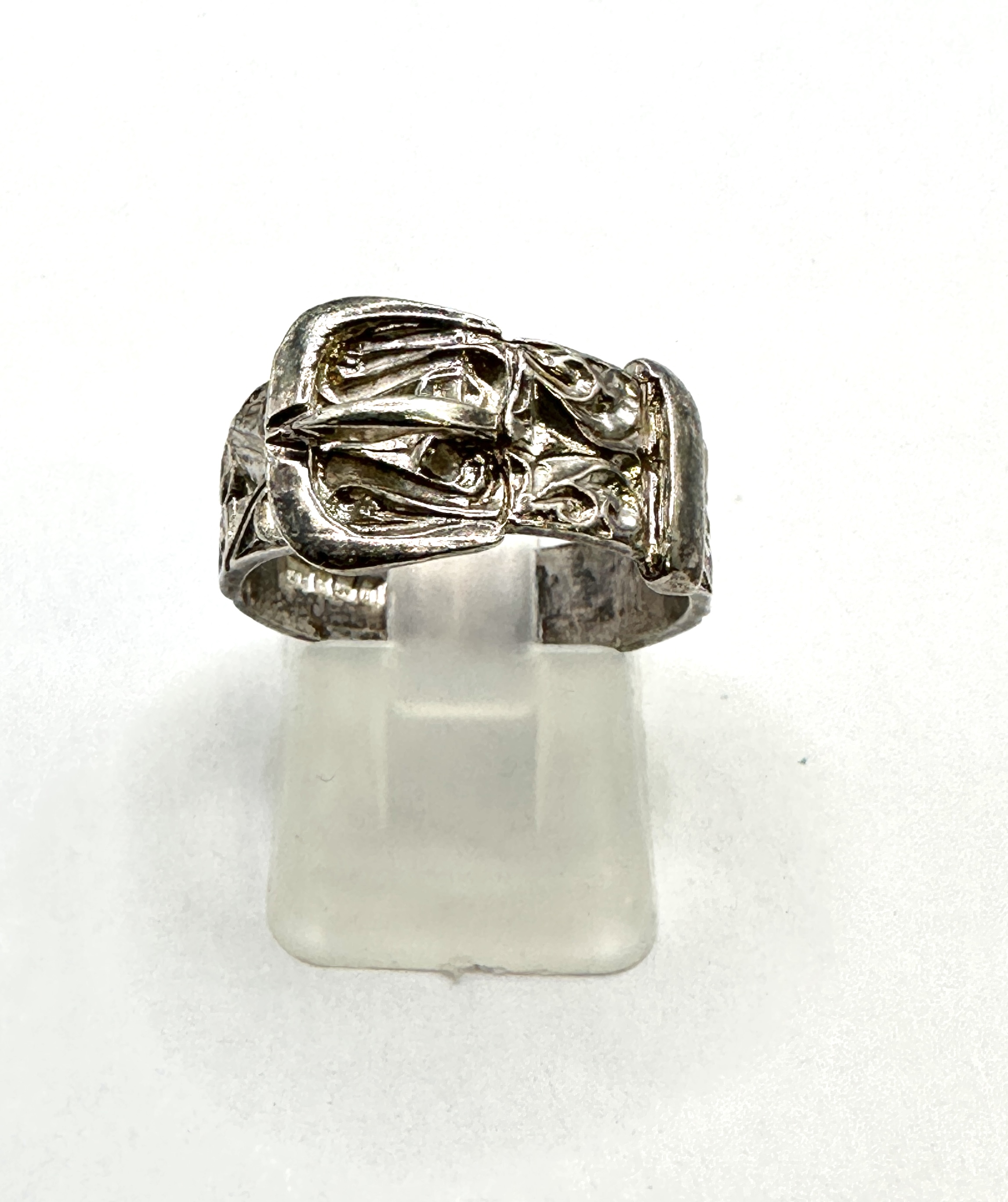 This is a highly detailed finger ring crafted from confirmed 925 silver, featuring a classic belt and buckle design with intricate scrollwork across the band. The piece presents a substantial weight and is sized accurately to US 7 (UK/AUS O) as verified on the professional sizing mandrel. The design is highly sought after and is comparable in style to retired models produced by prominent American silversmiths.