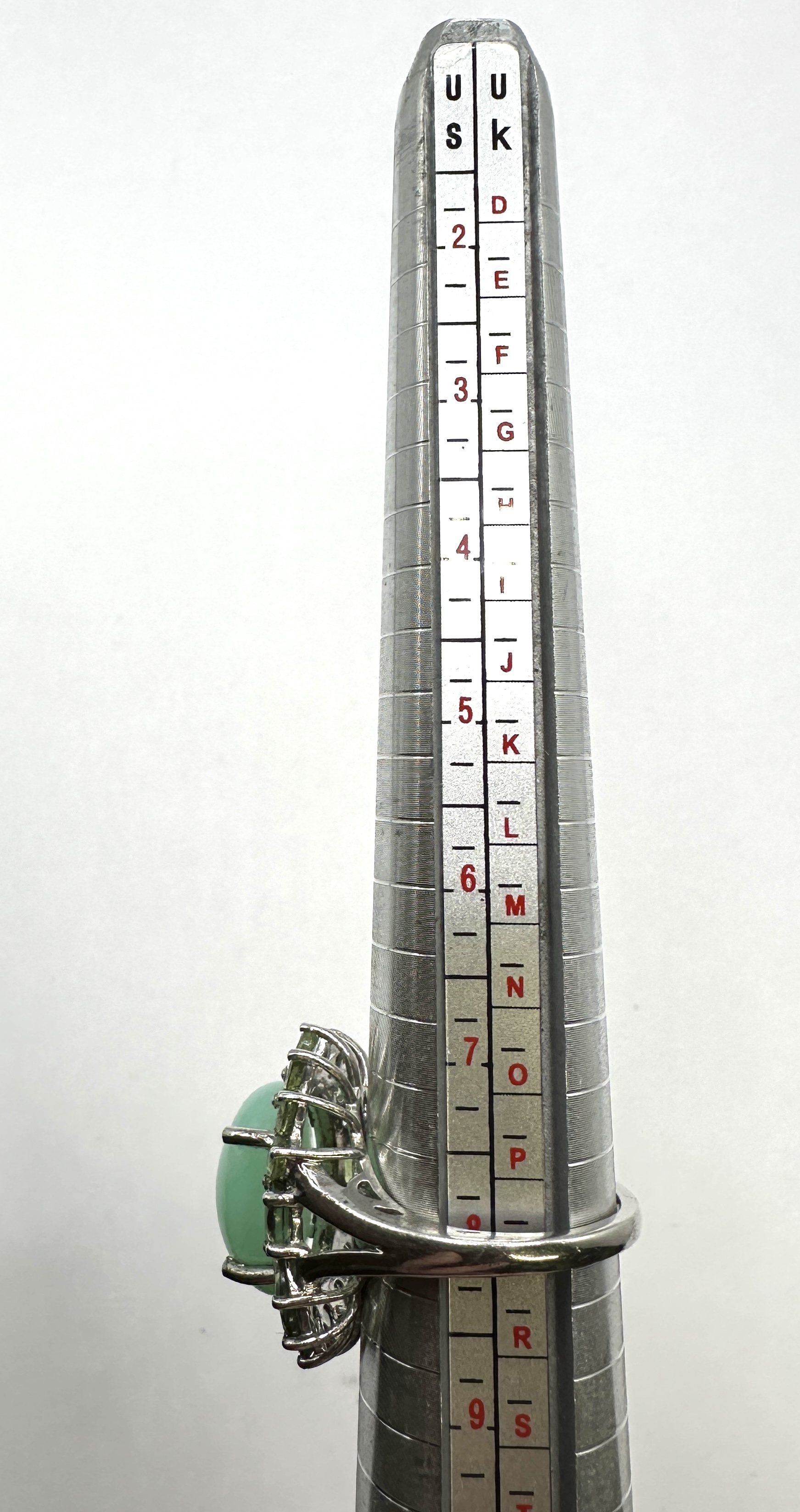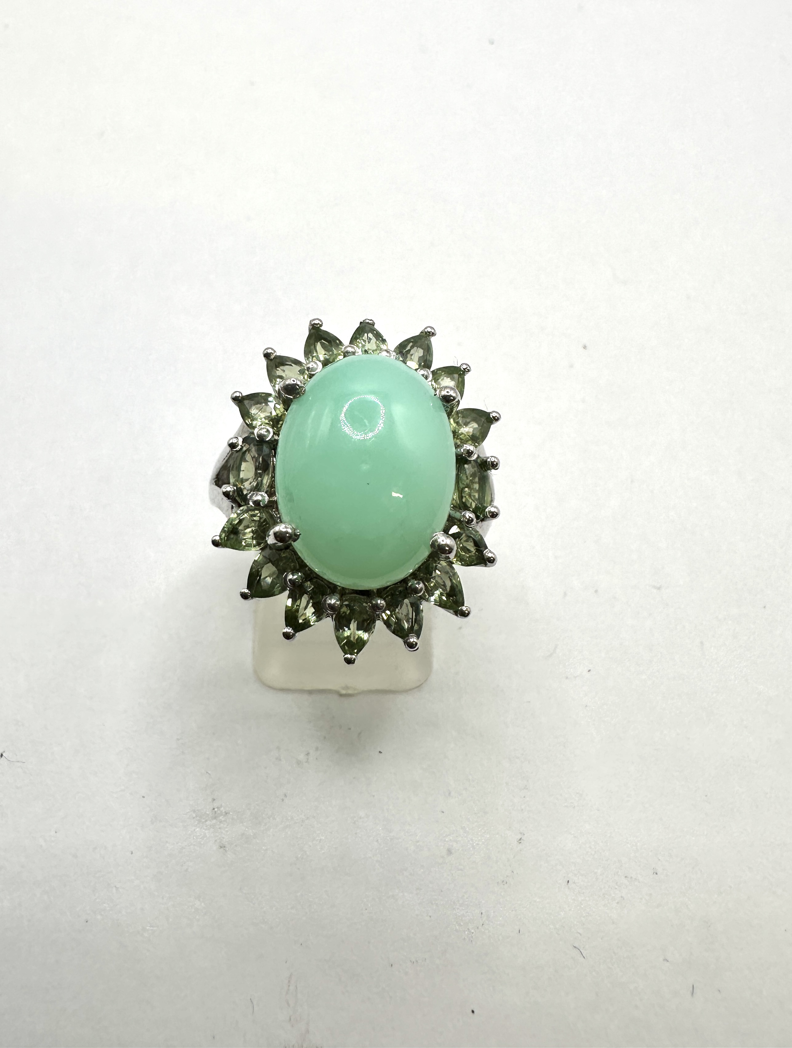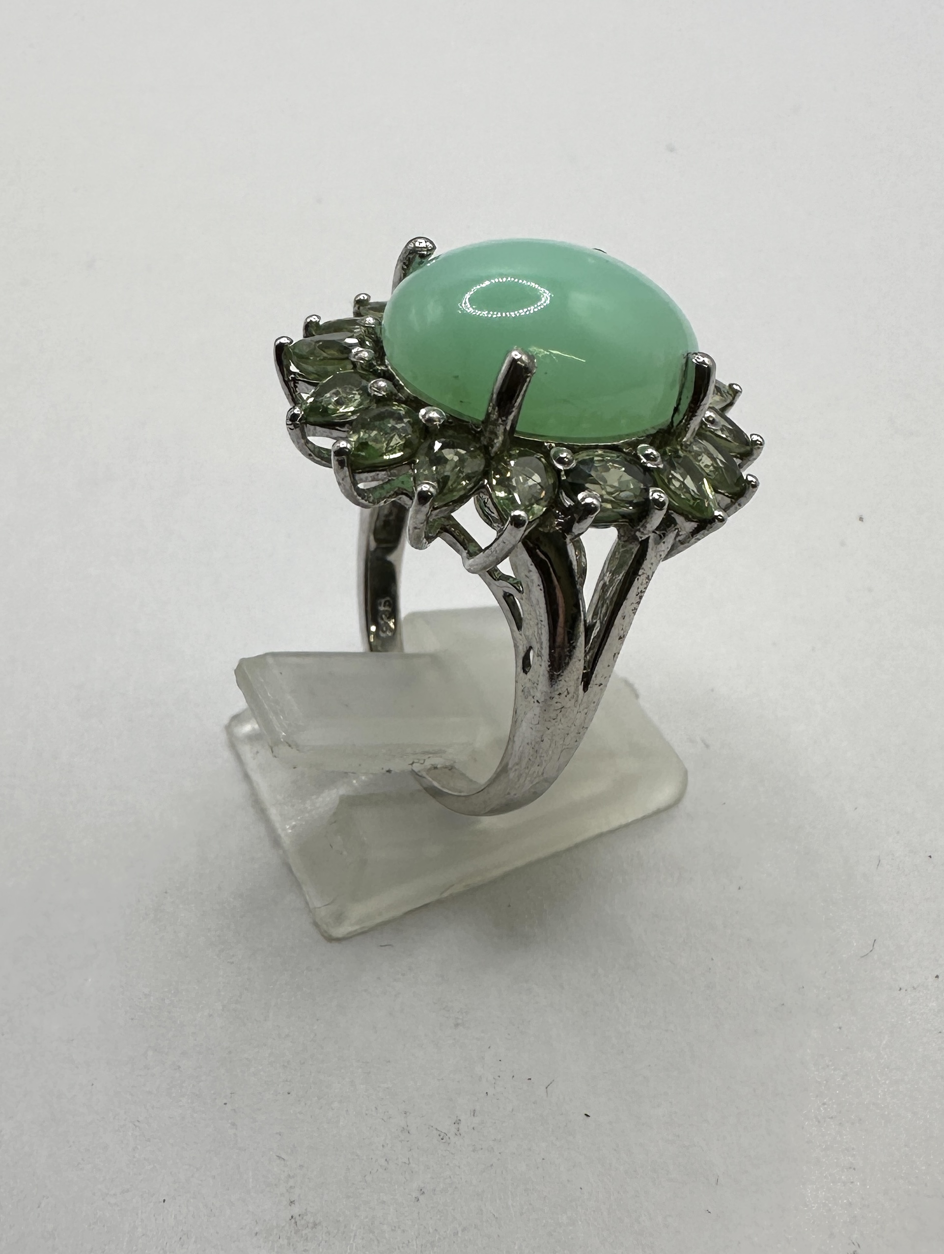 This striking cocktail ring features a substantial oval cabochon center stone of a pale mint green hue, possibly chrysoprase or light jade. The center stone is surrounded by a halo of smaller, darker green faceted stones, creating a dramatic sunburst effect. The setting is confirmed to be 925 silver. The ring is presented on a high-profile gallery setting.