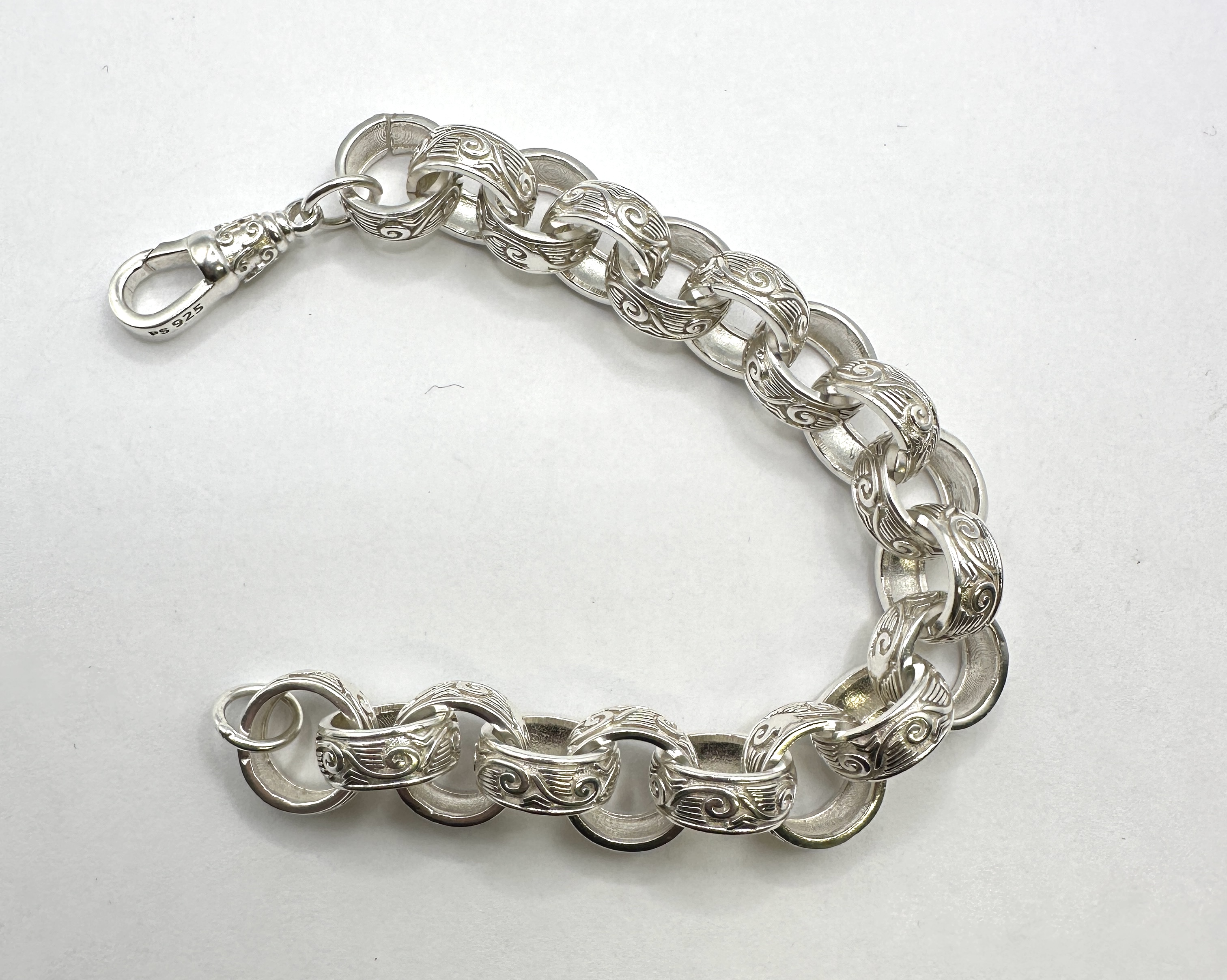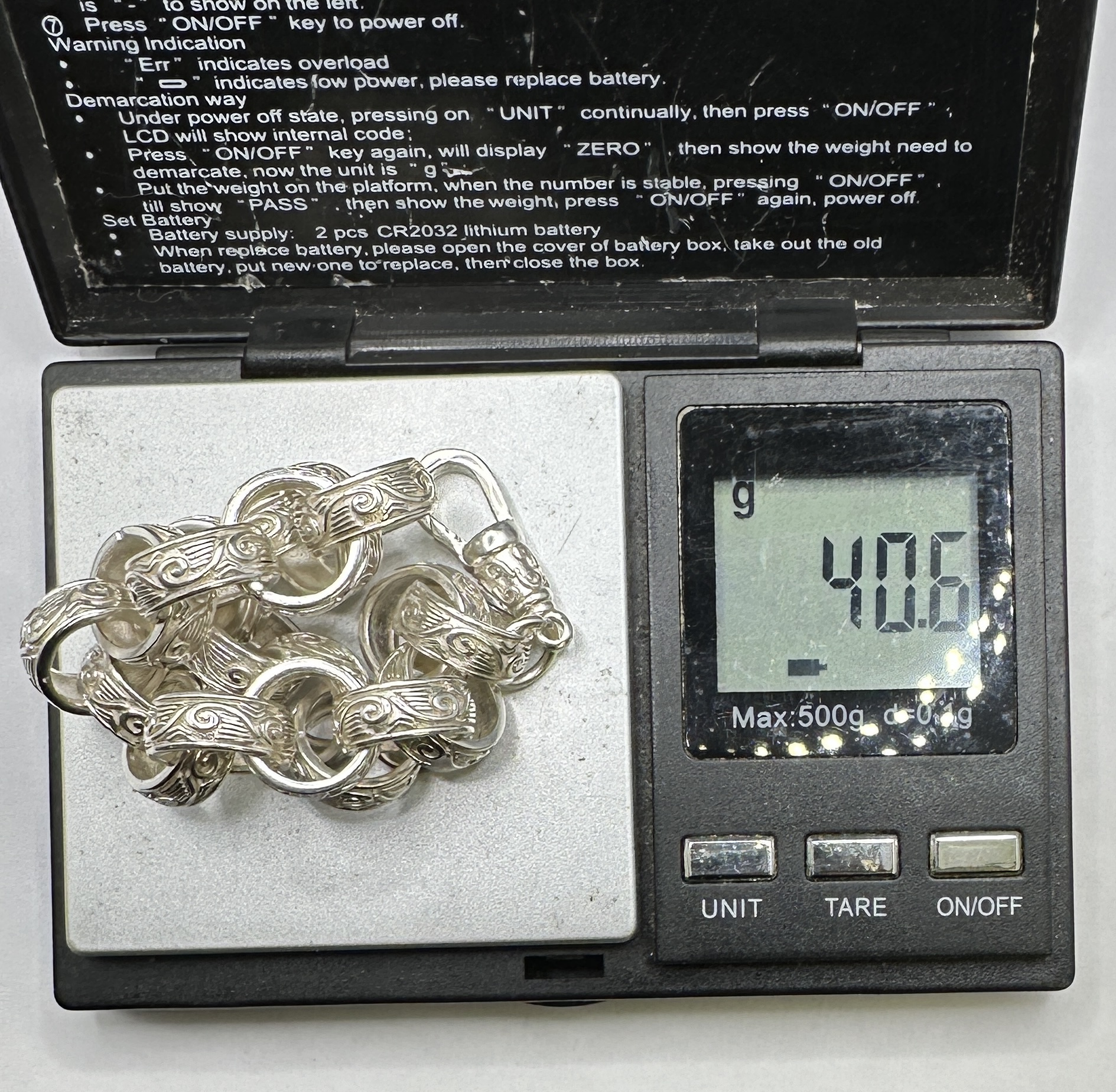 This is a substantial piece of jewelry, confirmed to be 925 silver, featuring large, thick oval links. Each link is detailed with a raised, scrolled, or engraved pattern, giving the piece a heavy, artisanal aesthetic. The bracelet is secured by a functional lobster clasp mechanism stamped with the maker’s mark PS 925. The item was measured on a digital scale confirming a weight of 40.6 grams.