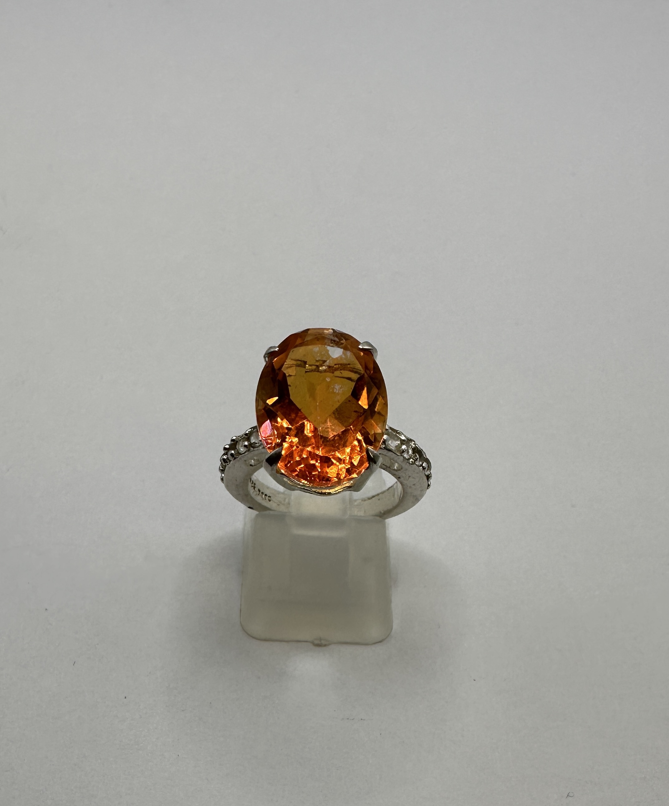 A striking cocktail ring featuring a large, high-set oval faceted gemstone exhibiting a deep orange to amber hue, likely citrine or treated quartz. The stone is secured by four prongs in a setting confirmed to be 925 silver. The shoulders of the band are accented with small, round clear stones, enhancing the overall brilliance. The ring is sized approximately UK M or US 6.