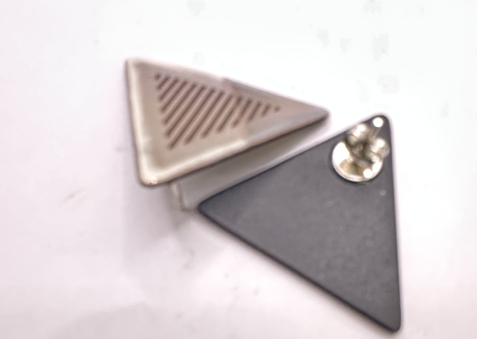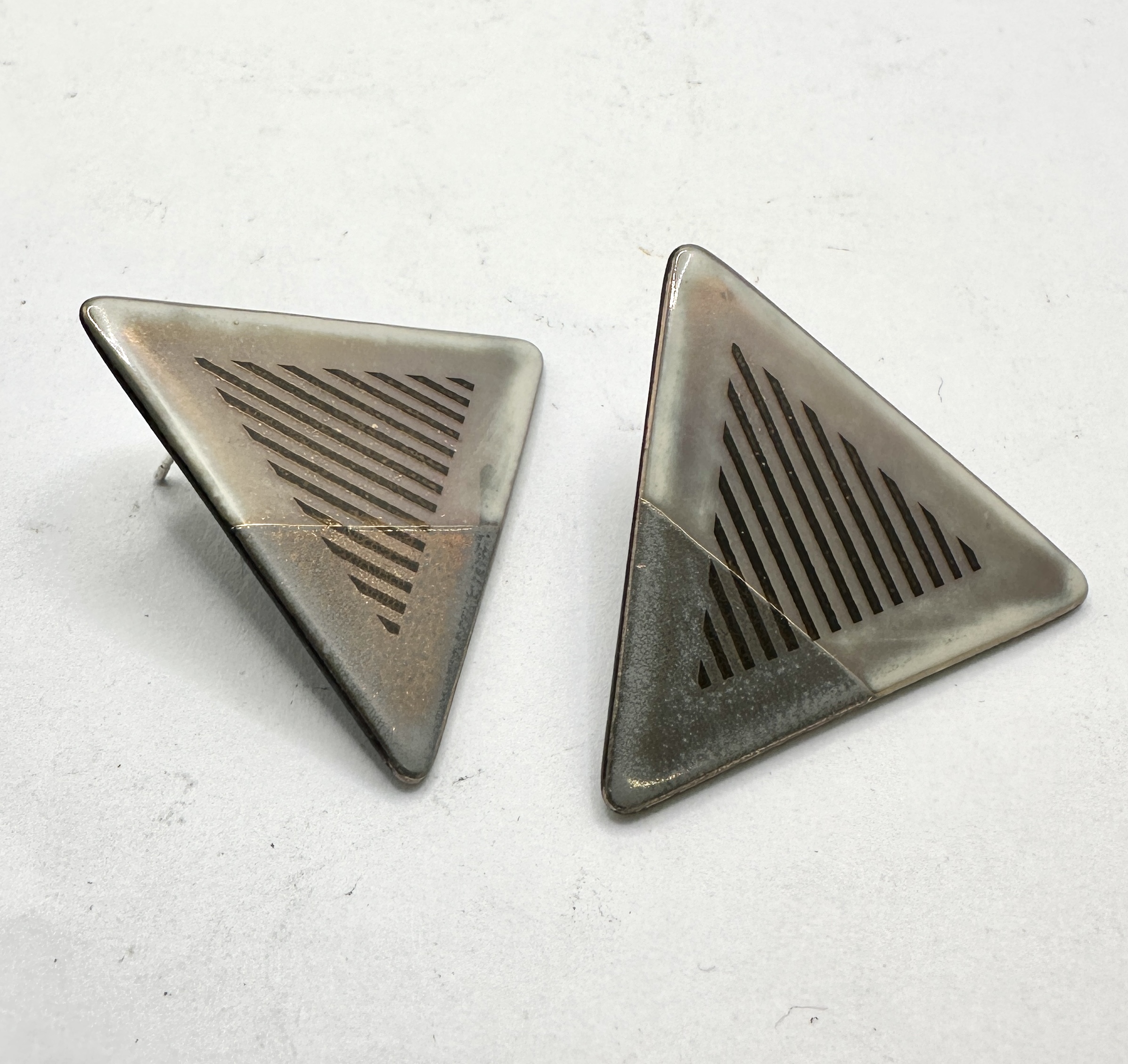 A pair of large, triangular stud earrings executed in 925 silver, consistent with a geometric Post-Modern style reminiscent of late 20th-century design. Each earring features a flat, isosceles triangular face. The surface of the face is visually divided into two sections. The upper section features a lighter metallic finish with parallel diagonal etched lines, providing a striated texture. This contrasts with the lower section, which exhibits a darker, highly oxidized or patinated surface treatment. The earrings utilize standard post-and-clutch findings on the reverse. No visible hallmarks or manufacturer’s markings are discernible on the items.
