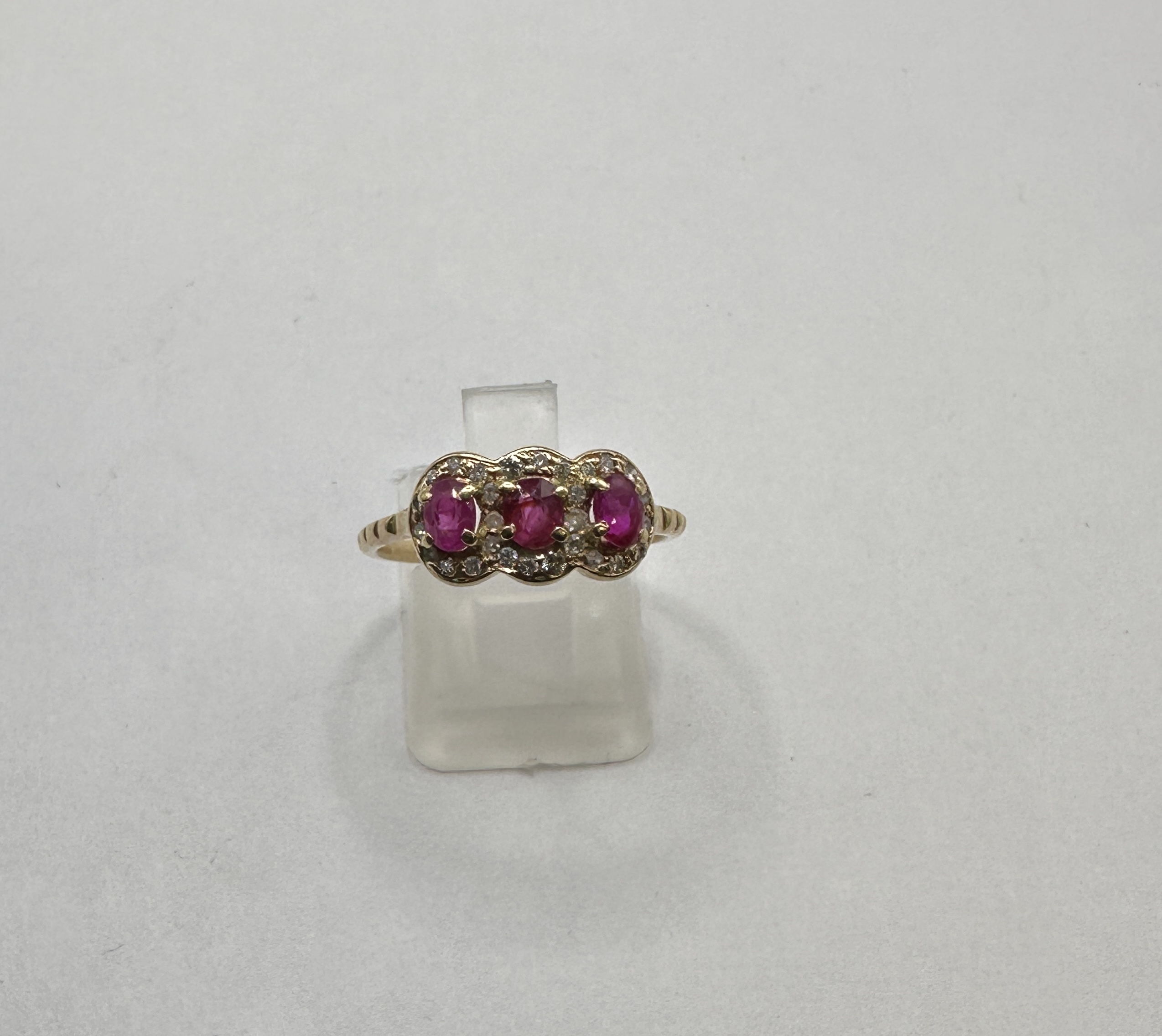 This piece presents a classic three-stone cluster design set in 14k yellow gold. The setting features three prominent oval-cut rubies, each surrounded by a halo of smaller diamond accents, forming a continuous scalloped cluster across the head of the ring. The band exhibits decorative grooving along the shoulders. The ring is sized approximately US 7.5 (UK O/P) as measured on a sizing mandrel.