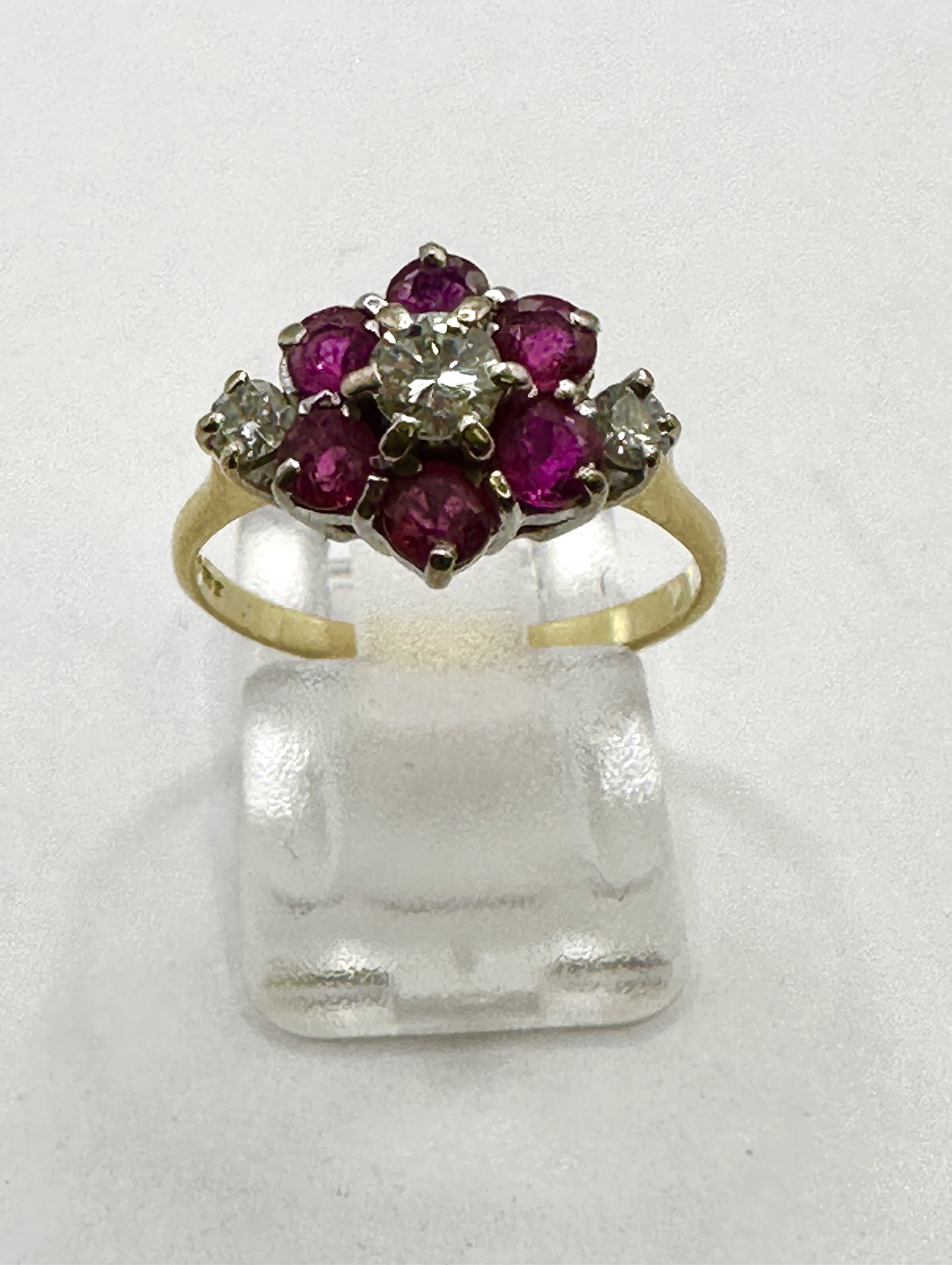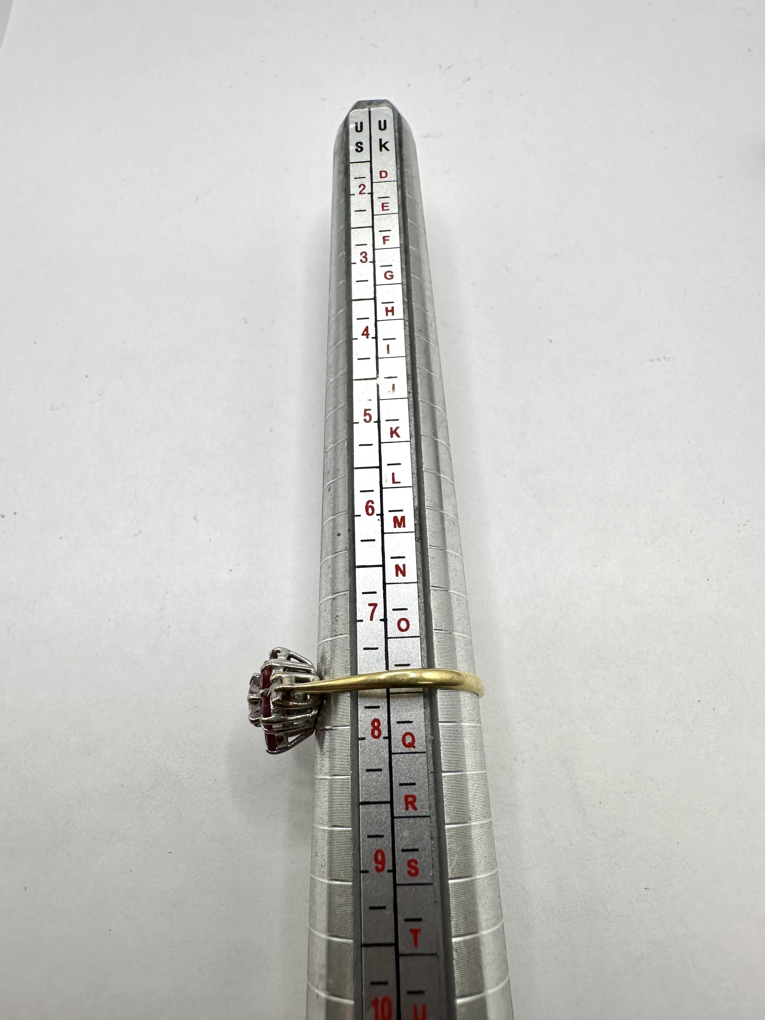 This lot presents a fine piece of jewelry, confirmed to be constructed of 18k gold and set with rubies and diamonds in a classic cluster formation. The setting features a prominent grouping of stones, creating a floral or starburst effect. The band is yellow gold, consistent with the 18k specification. The item is sized at UK O (US 7) as measured on the sizing mandrel shown in the imagery.