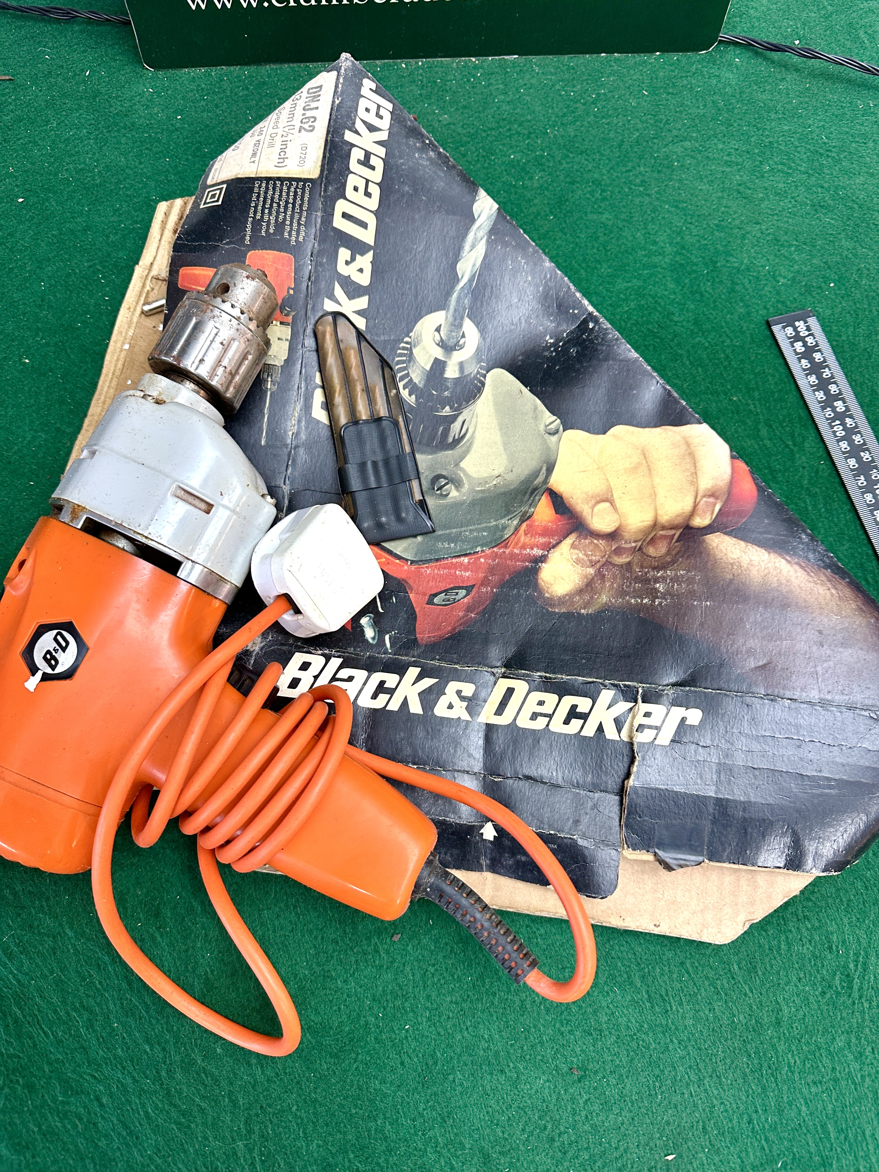A vintage Black & Decker corded electric drill, identified by the DMJ.62 product code visible on the original packaging. This unit features the characteristic orange plastic housing and a light grey metal motor casing, equipped with a 13 mm (1/2 inch) chuck. The tool operates on 240 V and includes its original coiled orange power cable terminating in a white UK-style three-pin electrical plug. It is presented alongside a small black pouch containing several brass-coloured cylindrical inserts, likely drill bits or specialized accessories.
