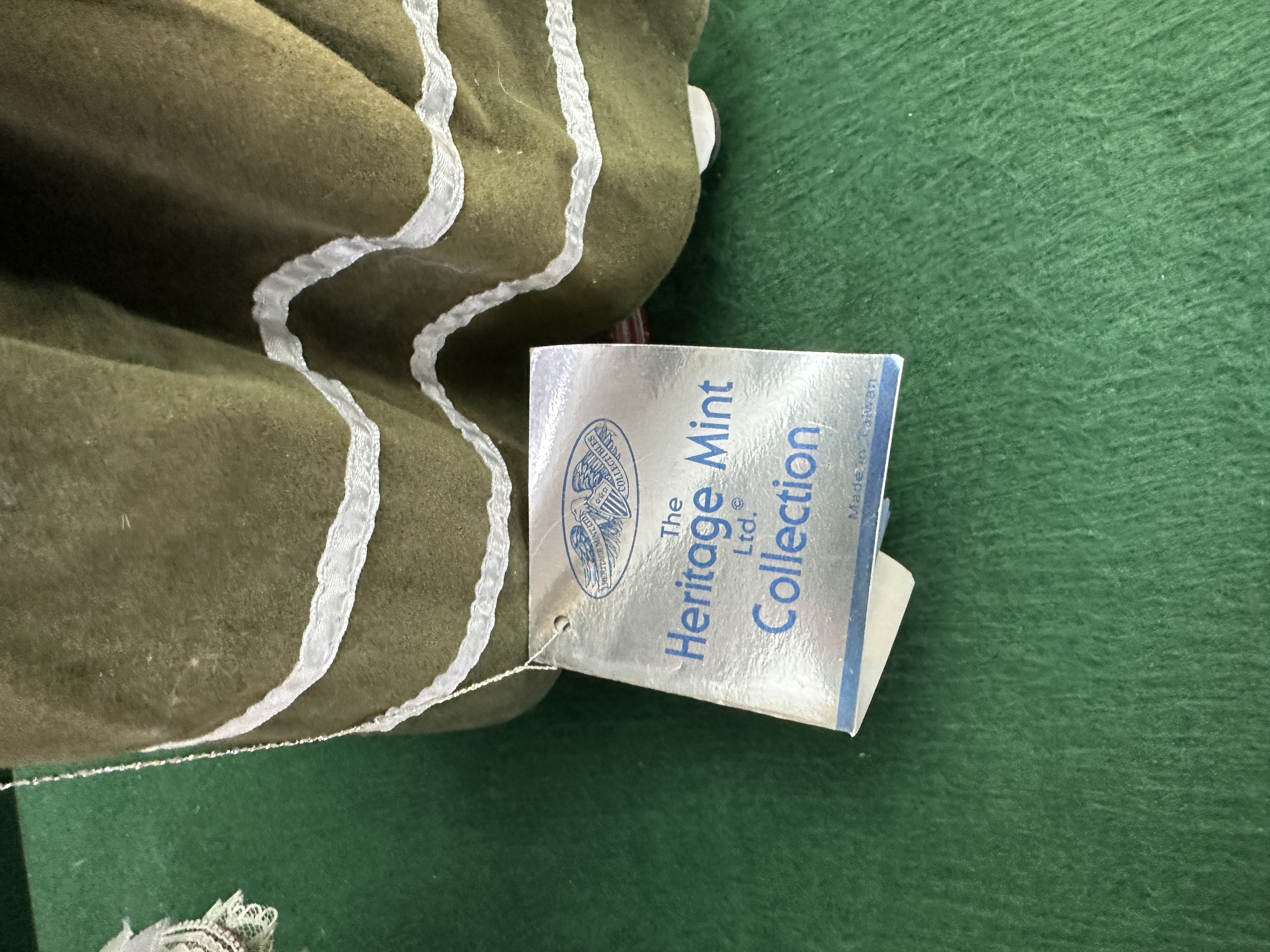 A pair of collector’s dolls featuring porcelain heads and limbs, synthetic curly hair, and elaborate fabric costumes, rendered in a Victorian or Edwardian style. The first doll, identified by its hang tag as a Leonardo Collector’s Porcelain Doll, wears a cream and pink floral patterned dress detailed with significant lace. The second doll, identified by its hang tag as part of The Heritage Mint Ltd. Collection, wears a pink puffed-sleeve blouse with a high lace collar and an olive-green skirt detailed with horizontal white trim bands. The Heritage Mint Ltd. tag notes the doll was Made in Taiwan. Both dolls stand on circular display bases.