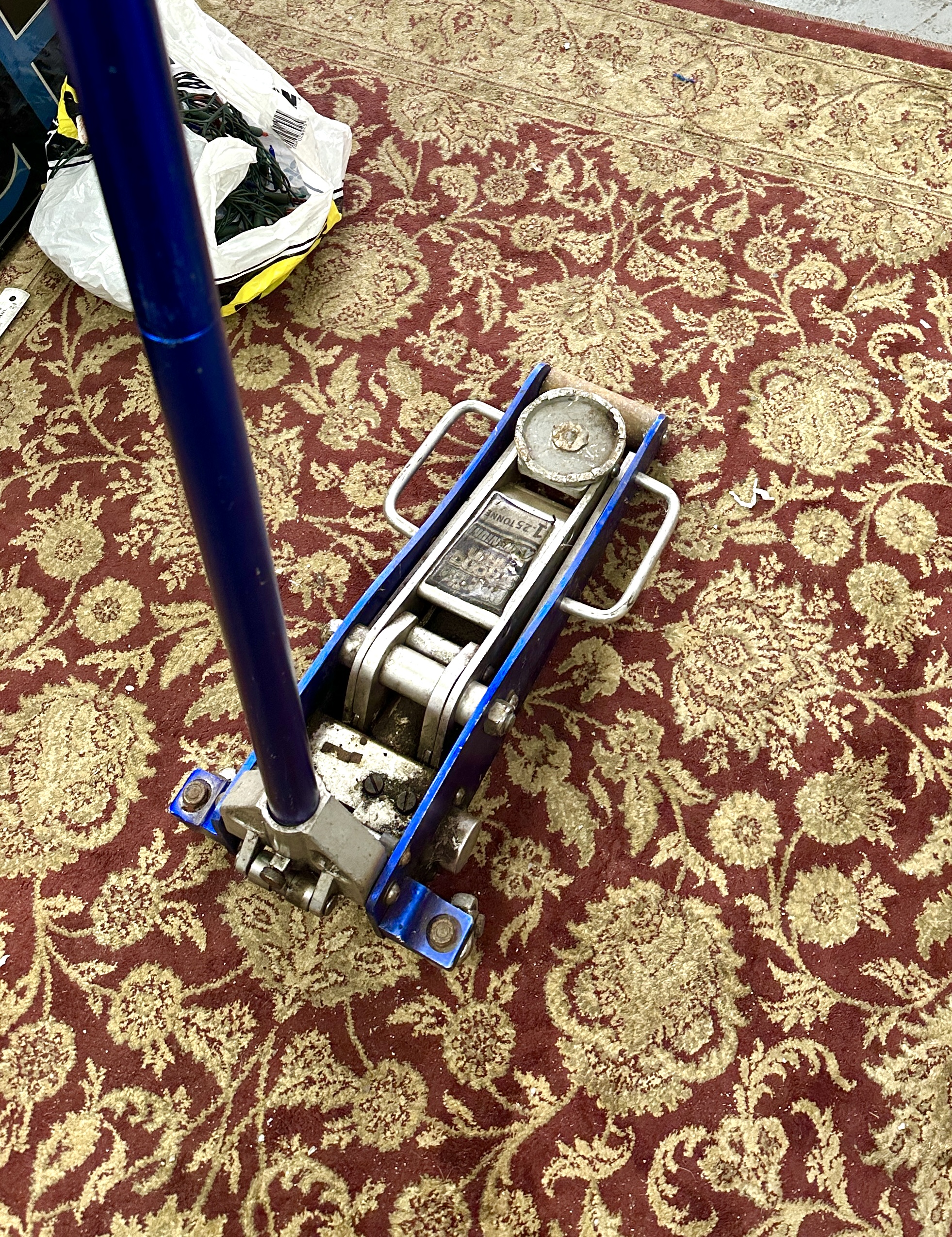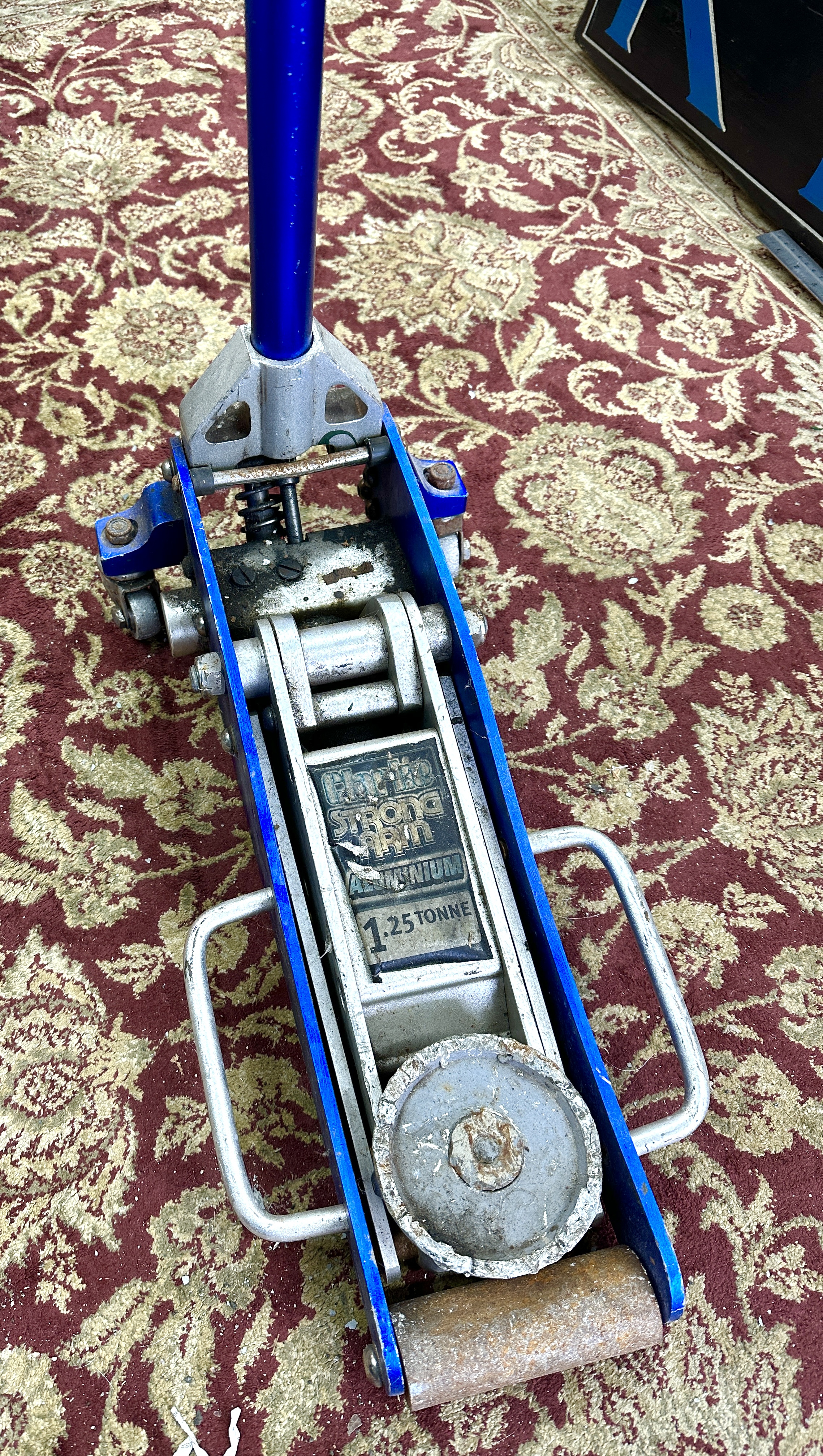 This listing is for a lightweight, low-profile aluminum floor jack, identifiable by its bright blue main lifting arms and handle shaft. The item is clearly marked with a capacity of 1.25 Tonne. This style of jack is commonly used in workshop and racing environments due to its lightweight construction and low-profile design, allowing access beneath vehicles with limited ground clearance.