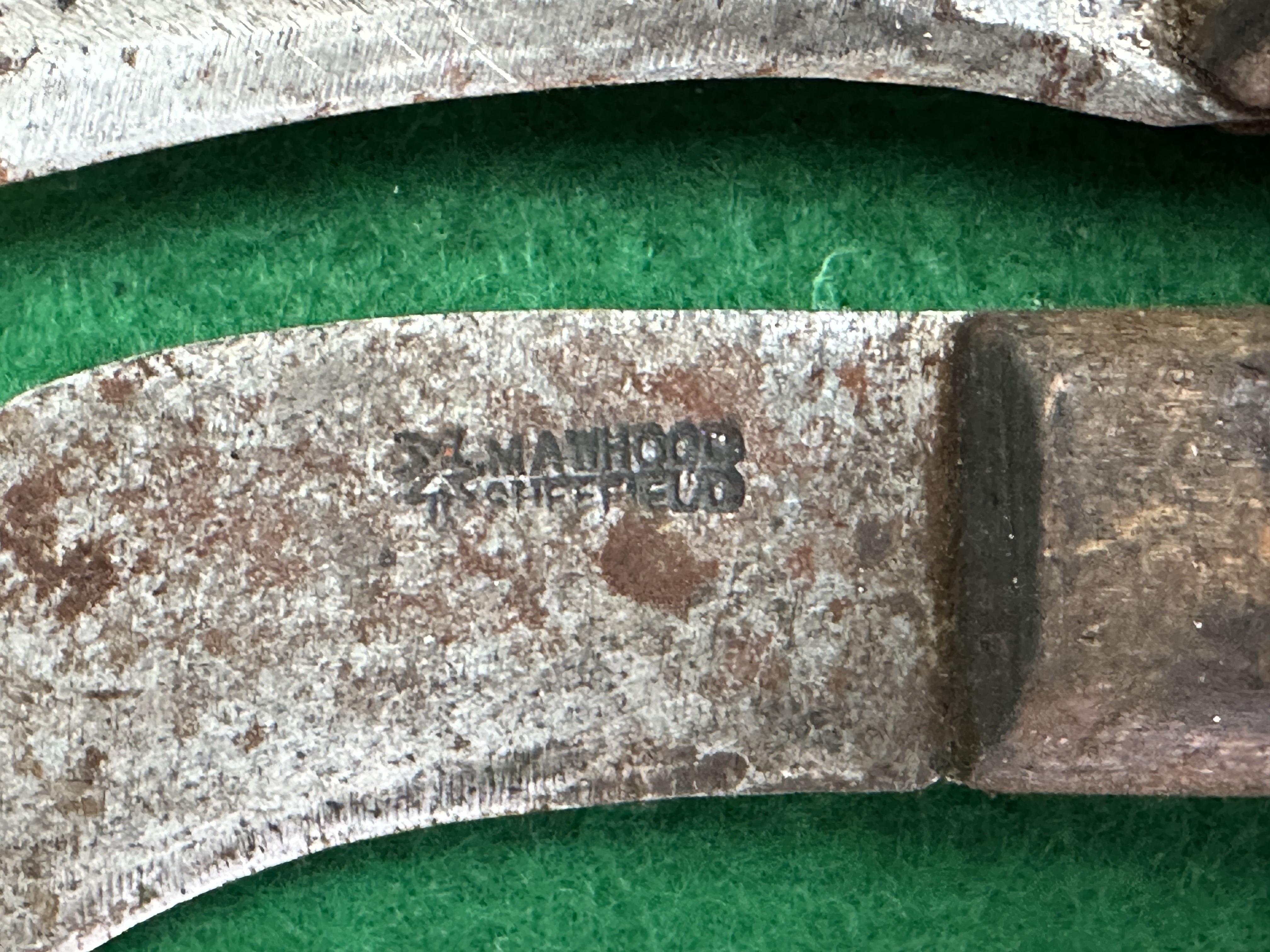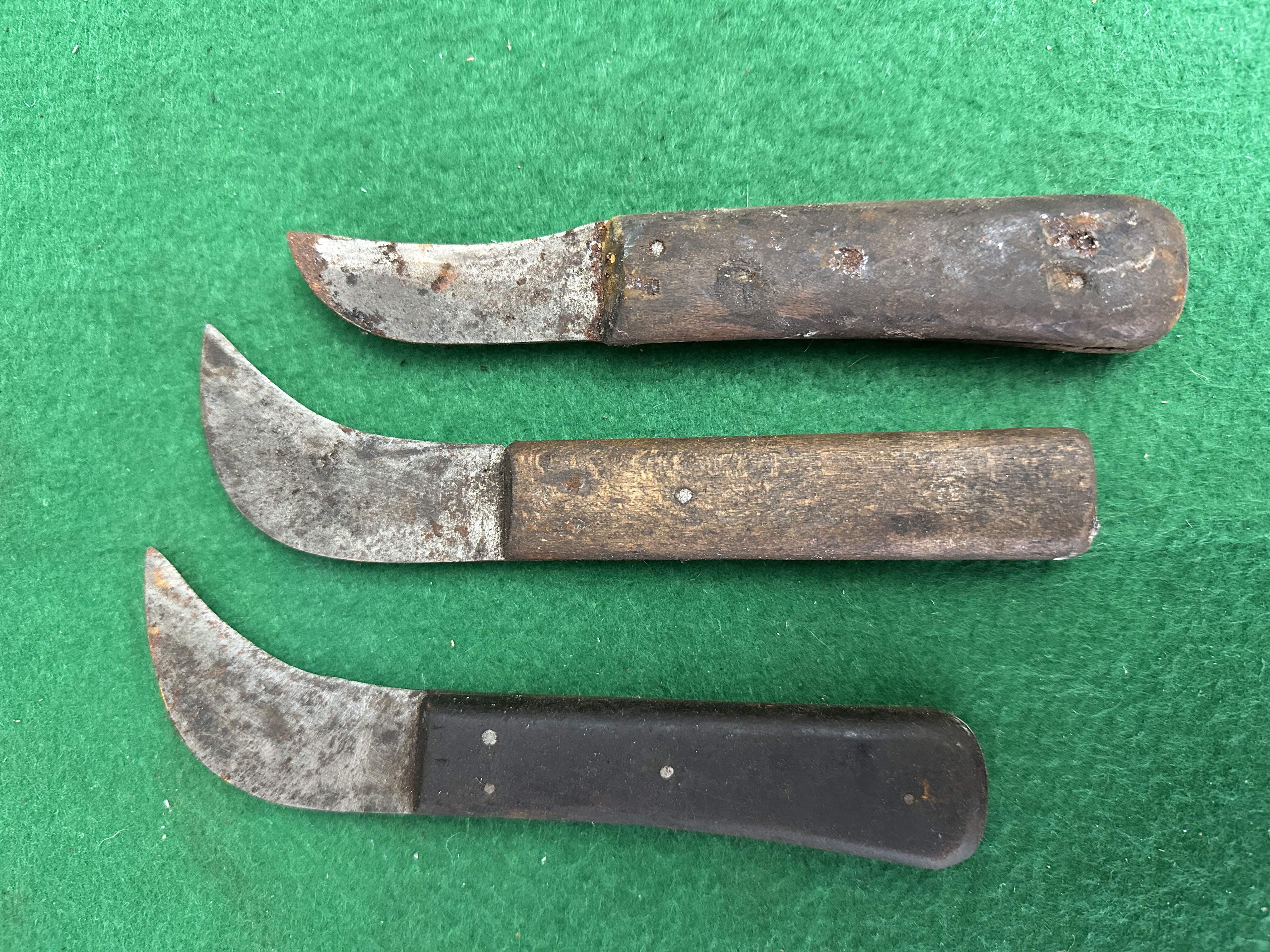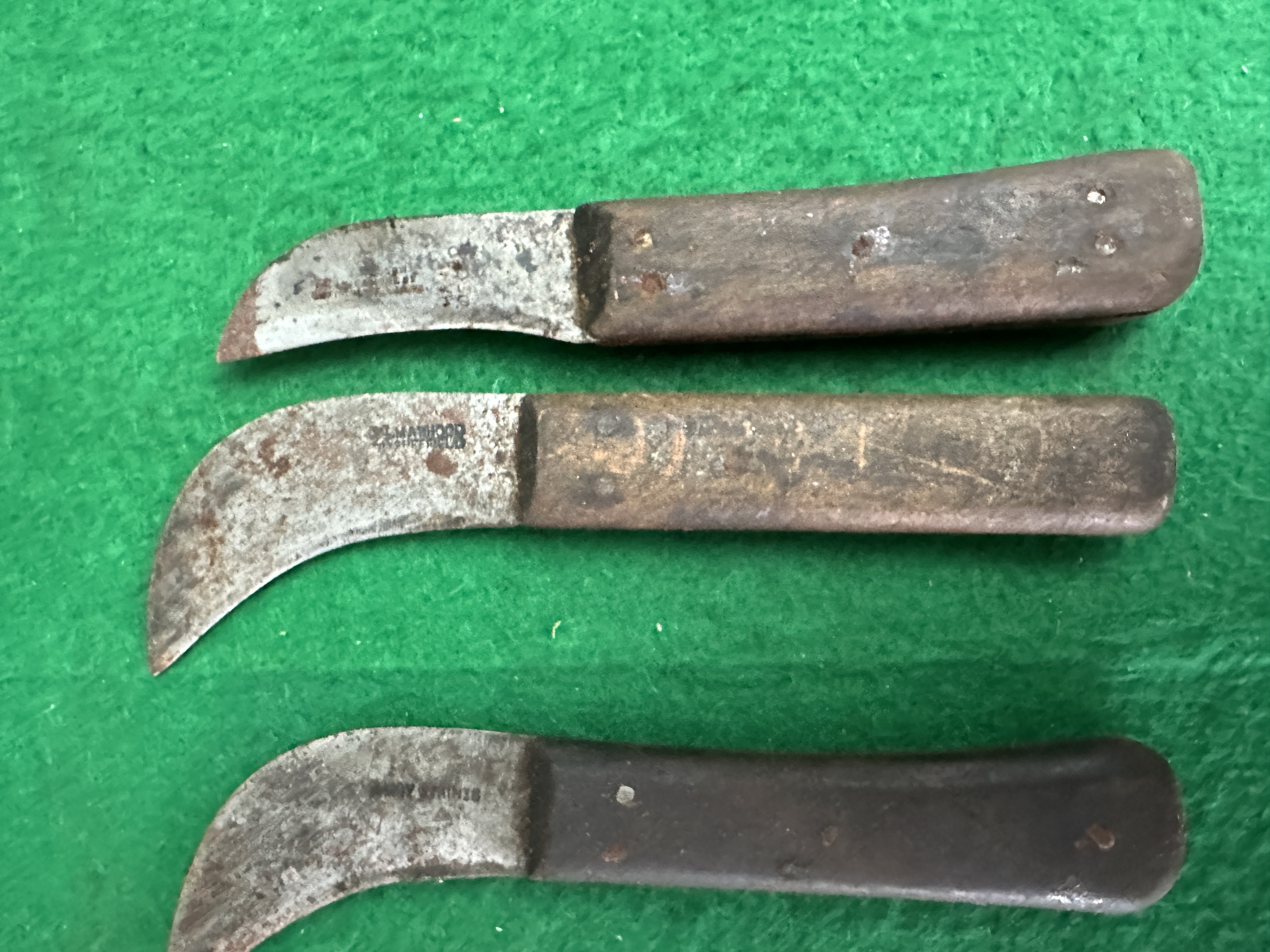 This lot comprises three aged, fixed-blade agricultural or utility hook knives, commonly used as sickles or pruning tools. The center tool is clearly marked CHAMPION (or CHAMPION 88) on the blade, while the leftmost tool appears to be marked SENIOR. The items exhibit significant signs of prolonged use and age, presenting as vintage or antique hand tools requiring restoration.