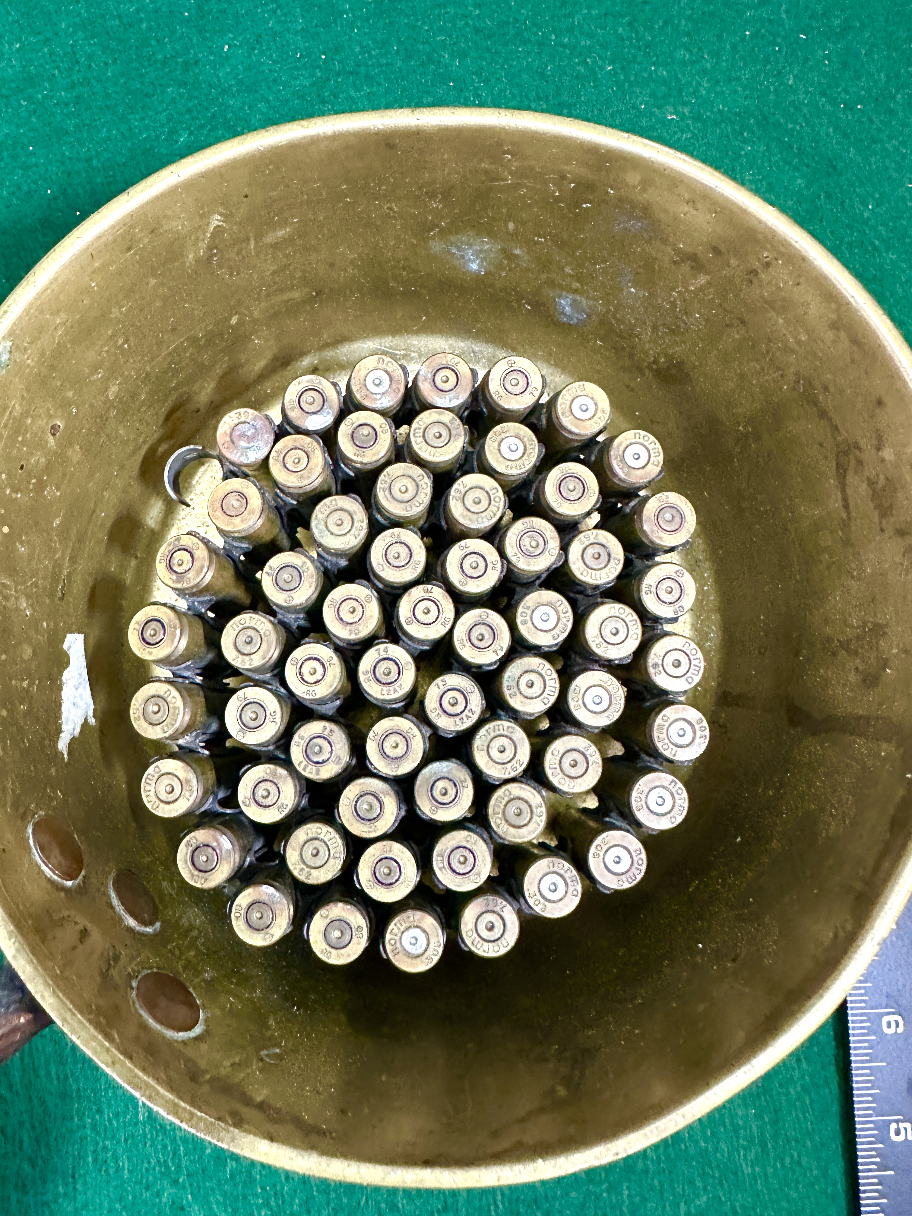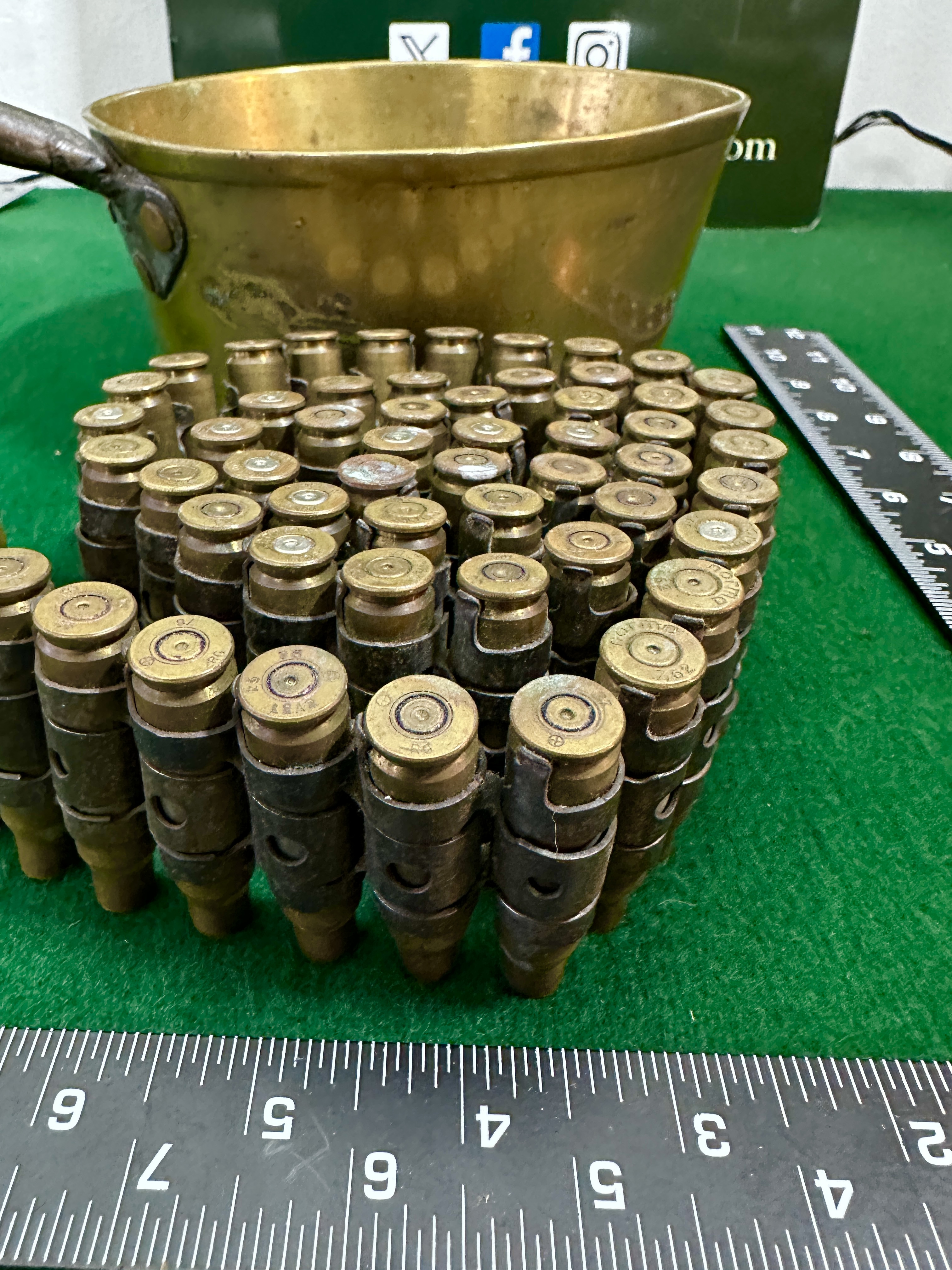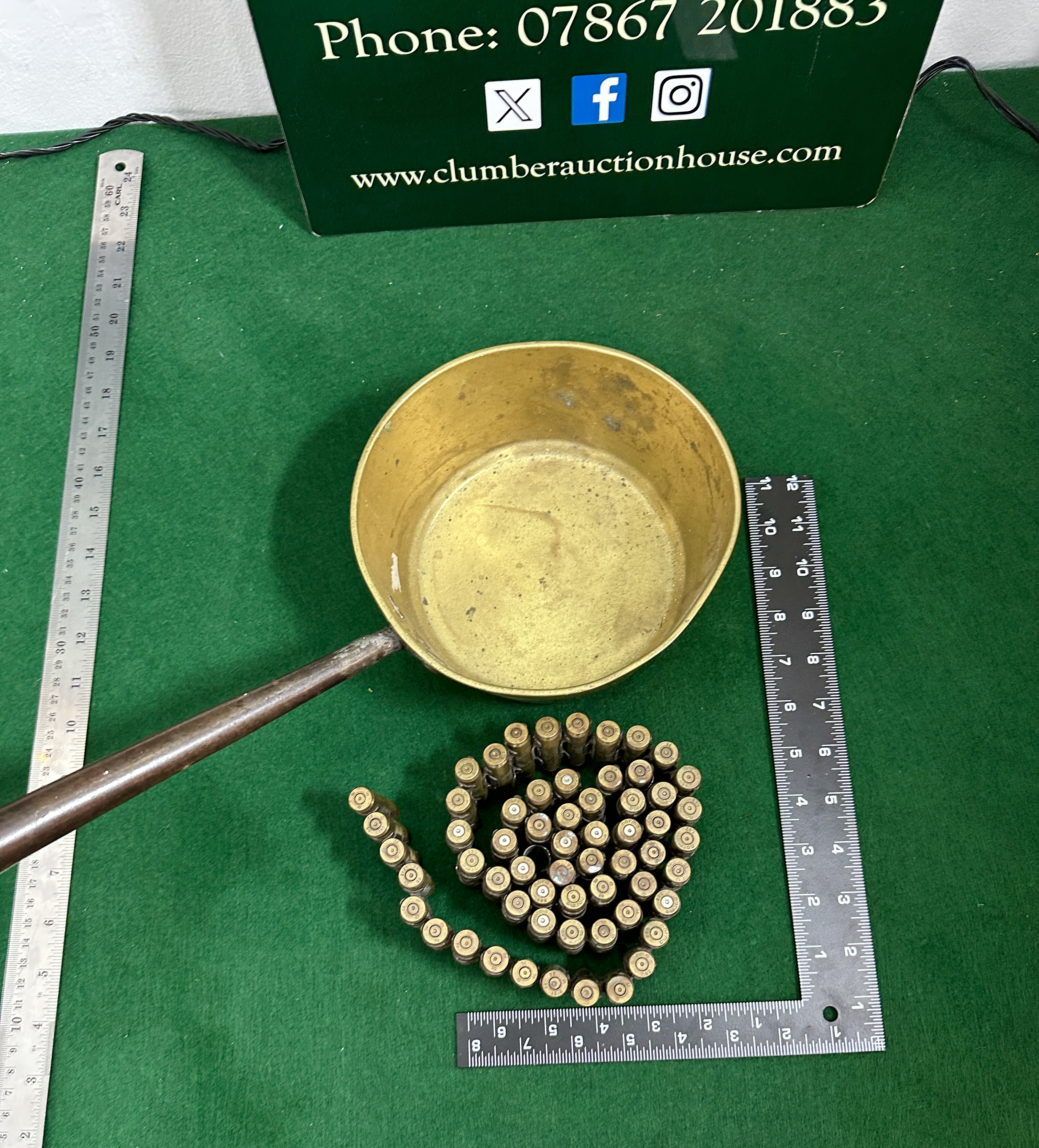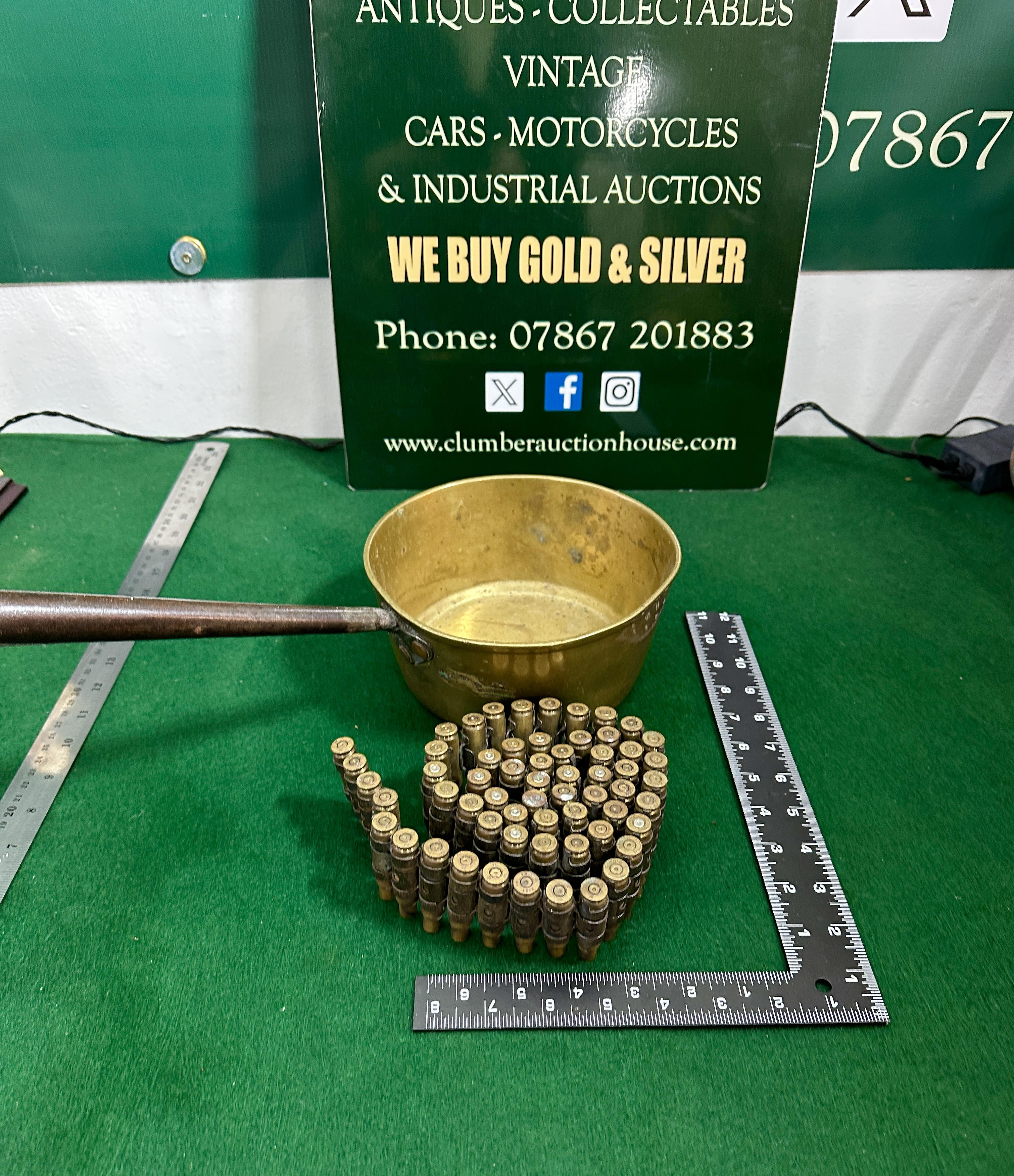 A collection of 57 items comprising a brass saucepan and 56 linked ammunition cartridges. The saucepan is of a conical form often associated with antique French preserve or jam pans. It features a solid brass body with a long, dark wooden or stained handle attached via a brass fitting. The accompanying 56 cartridges are linked together via dark metal clips, forming a coiled belt configuration. The cartridges feature brass casings and copper- or bronze-colored tips. Visible headstamps on the cartridge bases include military codes such as RI and A.