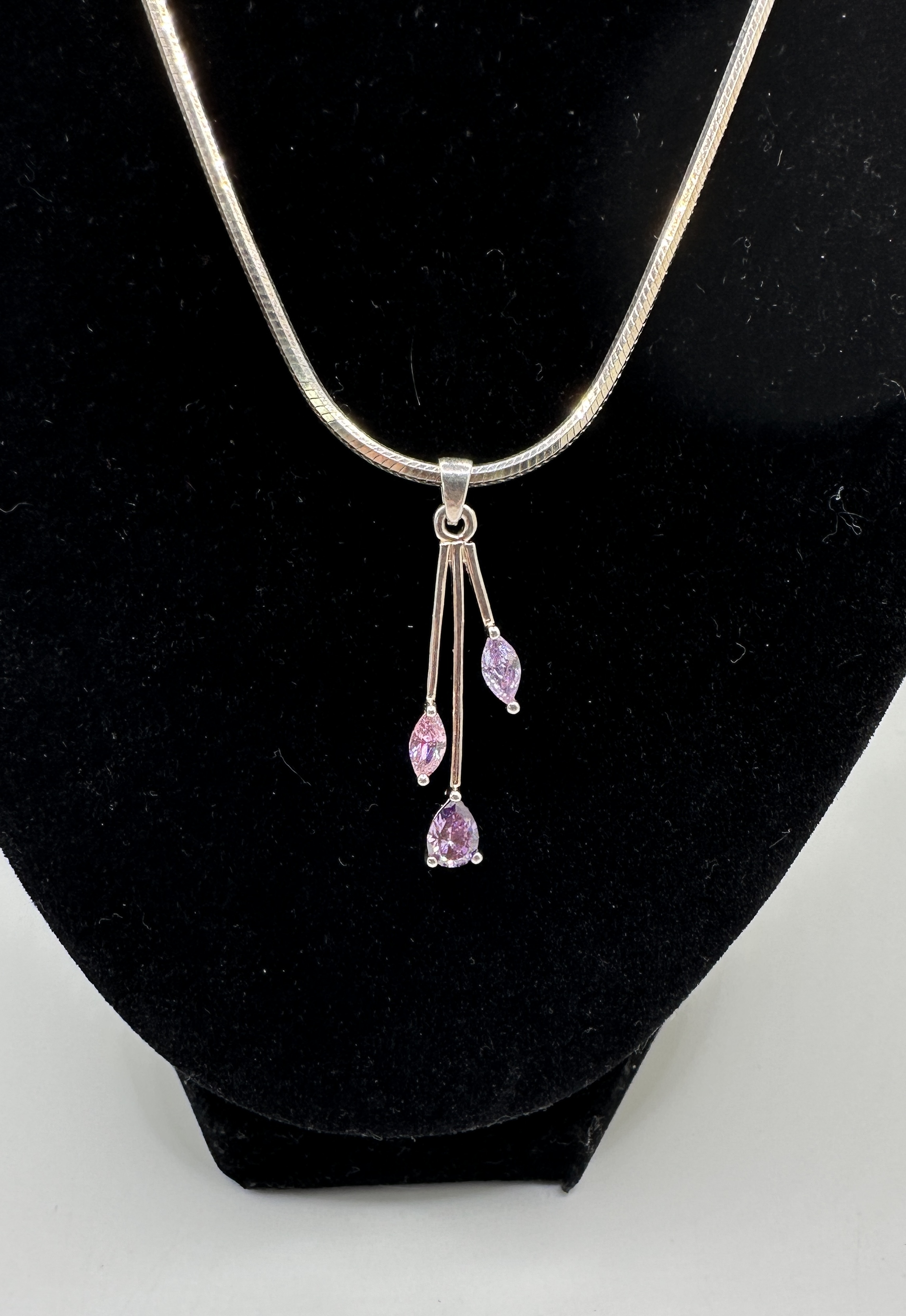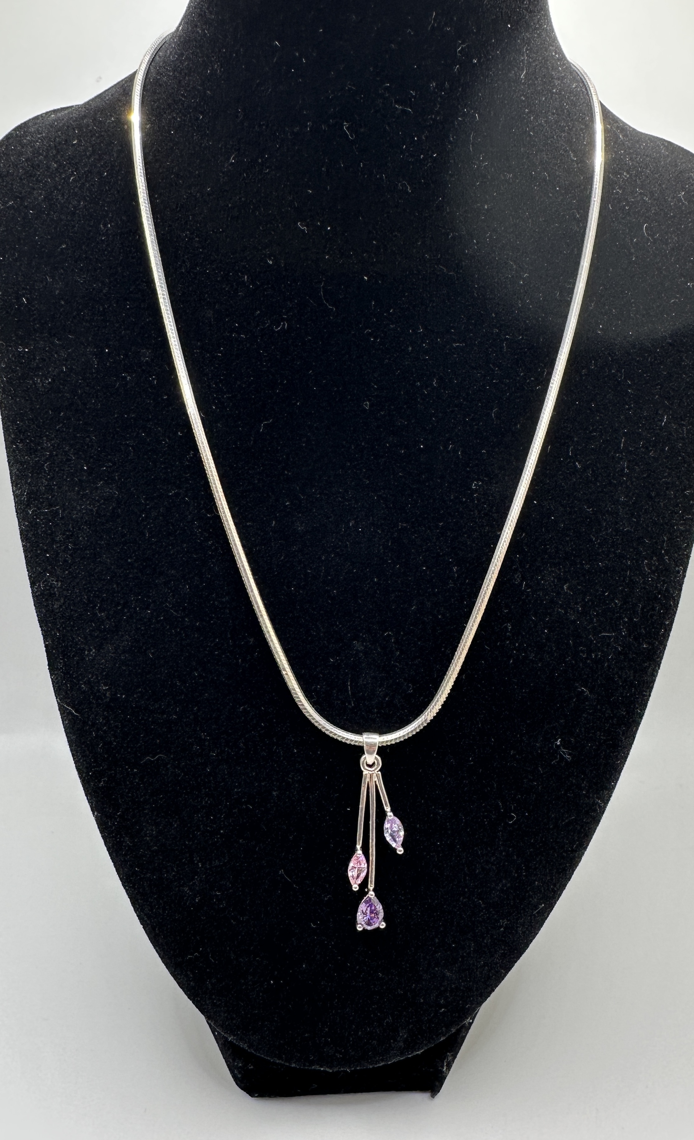 A contemporary pendant necklace crafted from verified 925 silver. The piece features a smooth, polished snake-style chain supporting a three-drop pendant setting. Each drop terminates in a faceted gemstone, displaying shades of pink and purple consistent with Amethyst and Rhodolite Garnet. The design provides movement and sparkle, suitable for immediate wear or display.