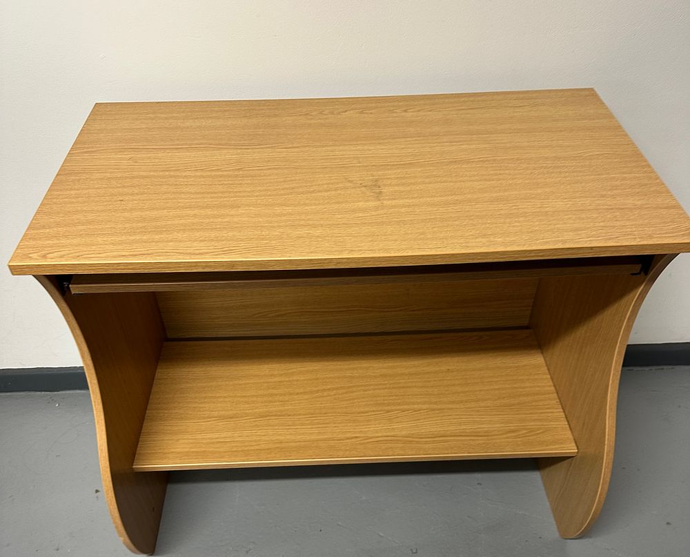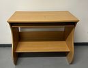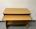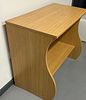 A contemporary computer workstation constructed of composite wood finished with a laminate surface simulating a light wood grain, likely oak or beech. The design features thick, curved side panels forming an S-shaped profile. The unit includes a main elevated desktop surface, a retractable keyboard tray mounted on metal slides positioned beneath the main top, and a fixed lower storage shelf. No manufacturer markings or labels are visible.