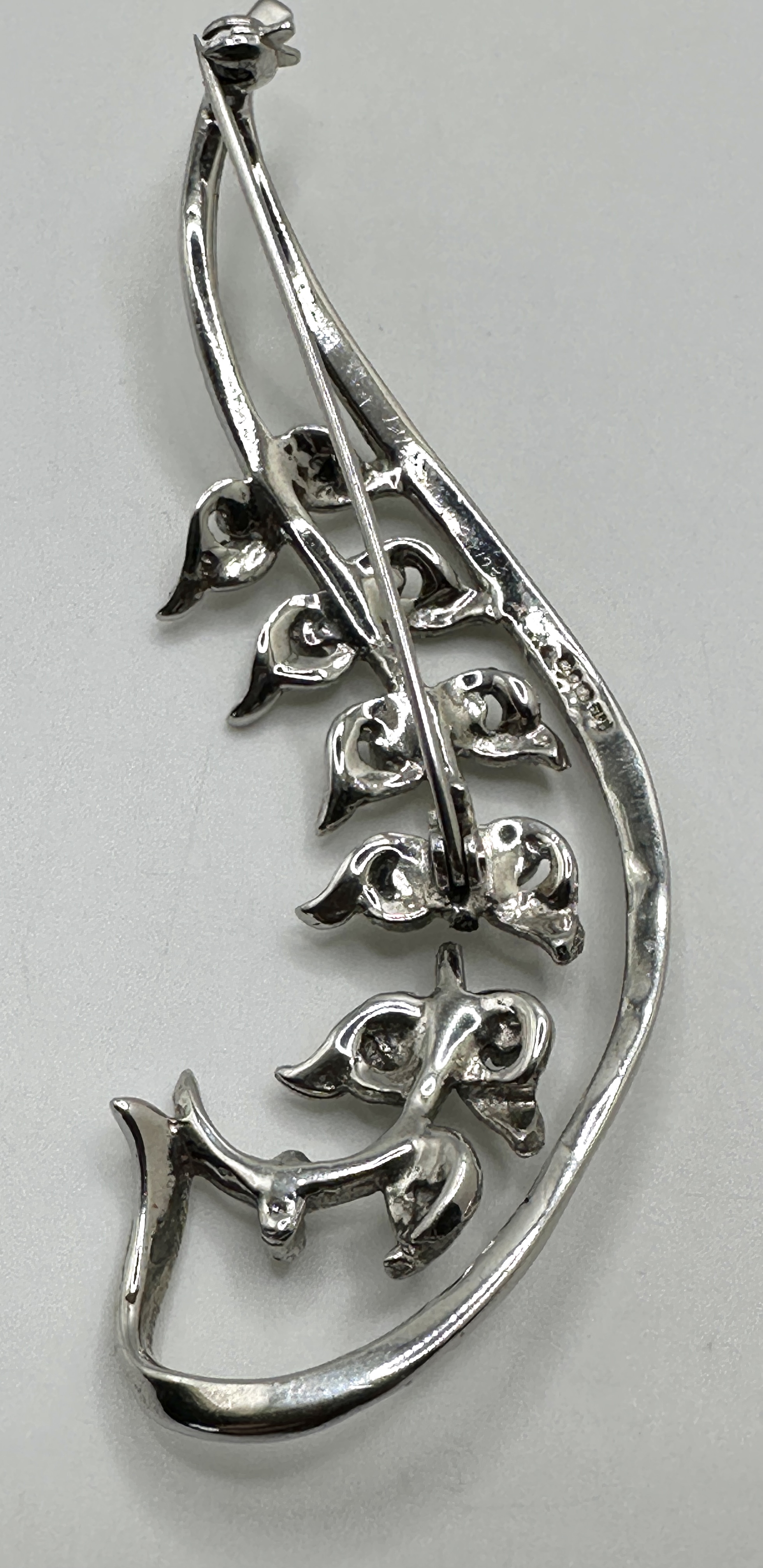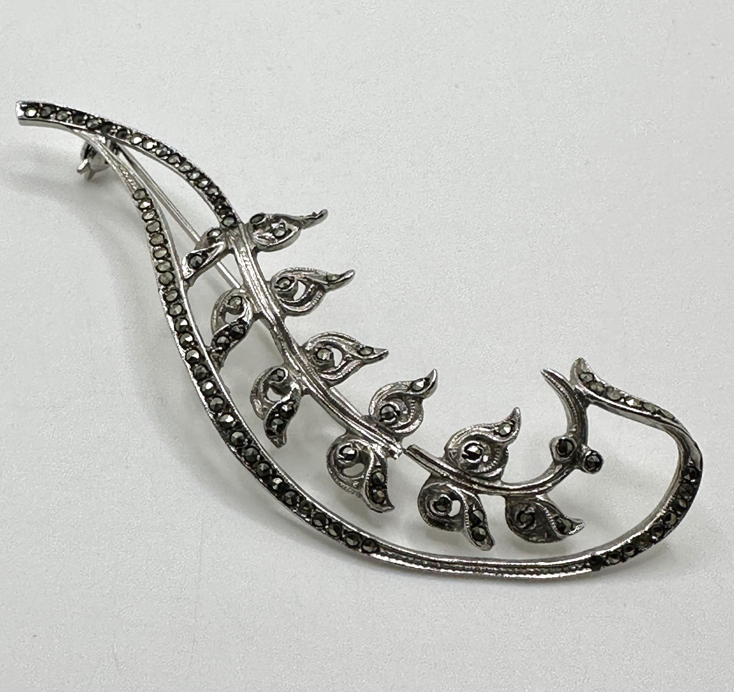 This lot presents a vintage decorative brooch crafted from verified 925 silver. The design features a sweeping, stylized vine or leaf motif, heavily embellished with small, dark marcasite stones set along the perimeter and within the scrolled leaf elements. The overall presentation is characteristic of Art Deco or mid-century design aesthetics. The reverse shows a standard hinged pin mechanism for secure fastening.