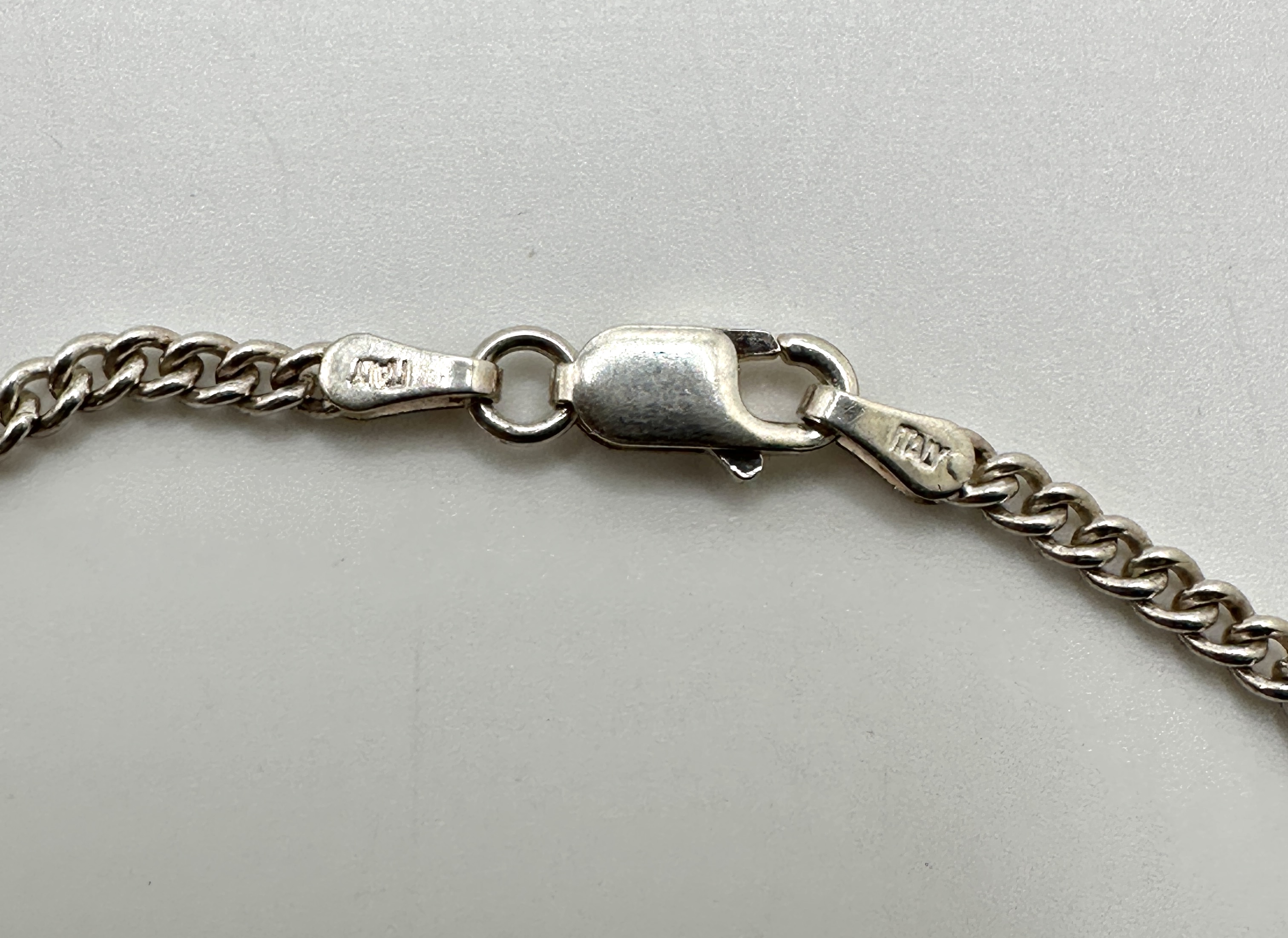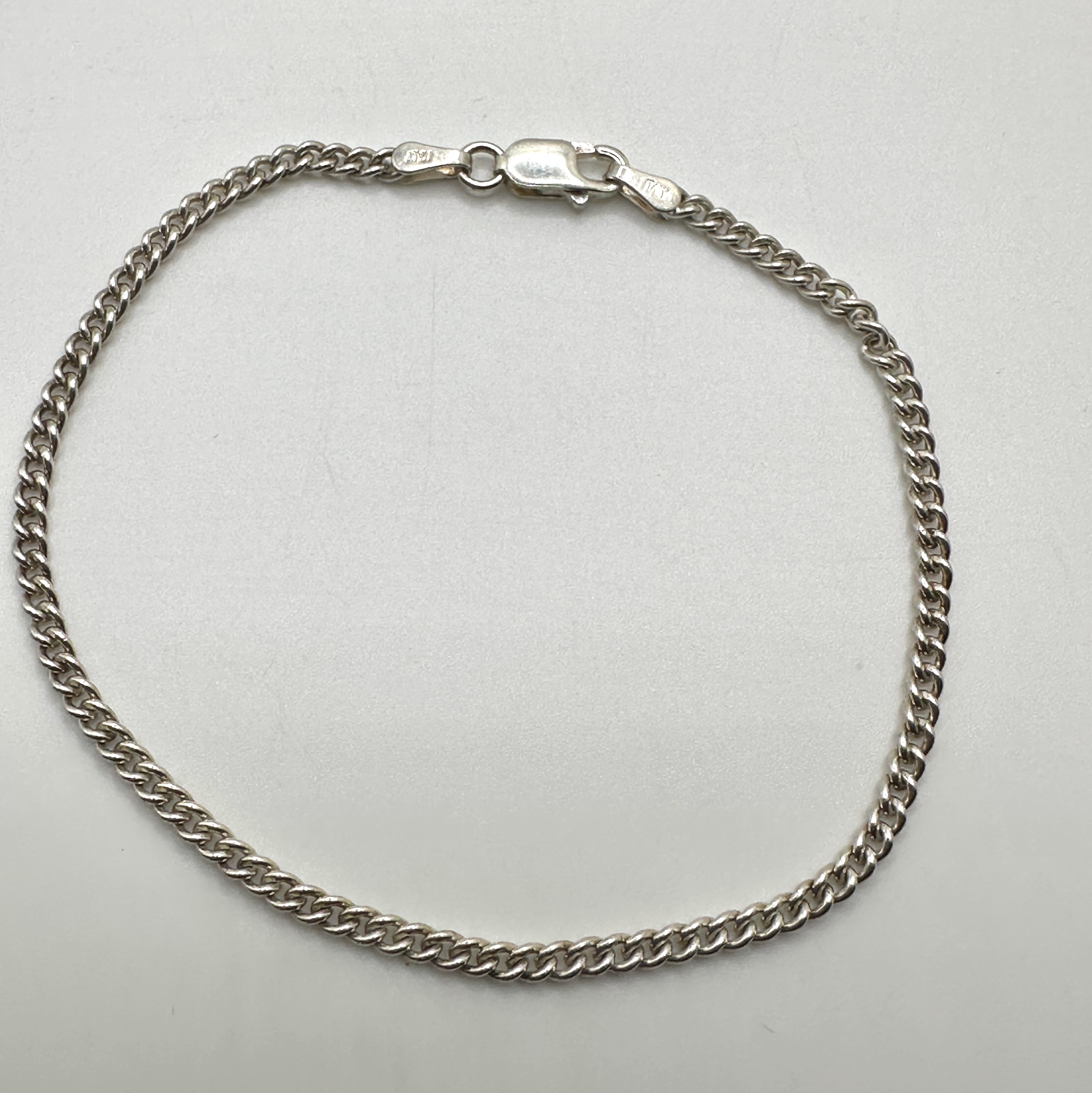 This item is a curb link chain bracelet, confirmed to be crafted from 925 silver. The design features tightly interlocking links typical of the Miami Cuban style. The piece is secured by a functional lobster claw clasp, which, along with the link attachment, bears legible stamps indicating its purity (925) and origin (ITALY).