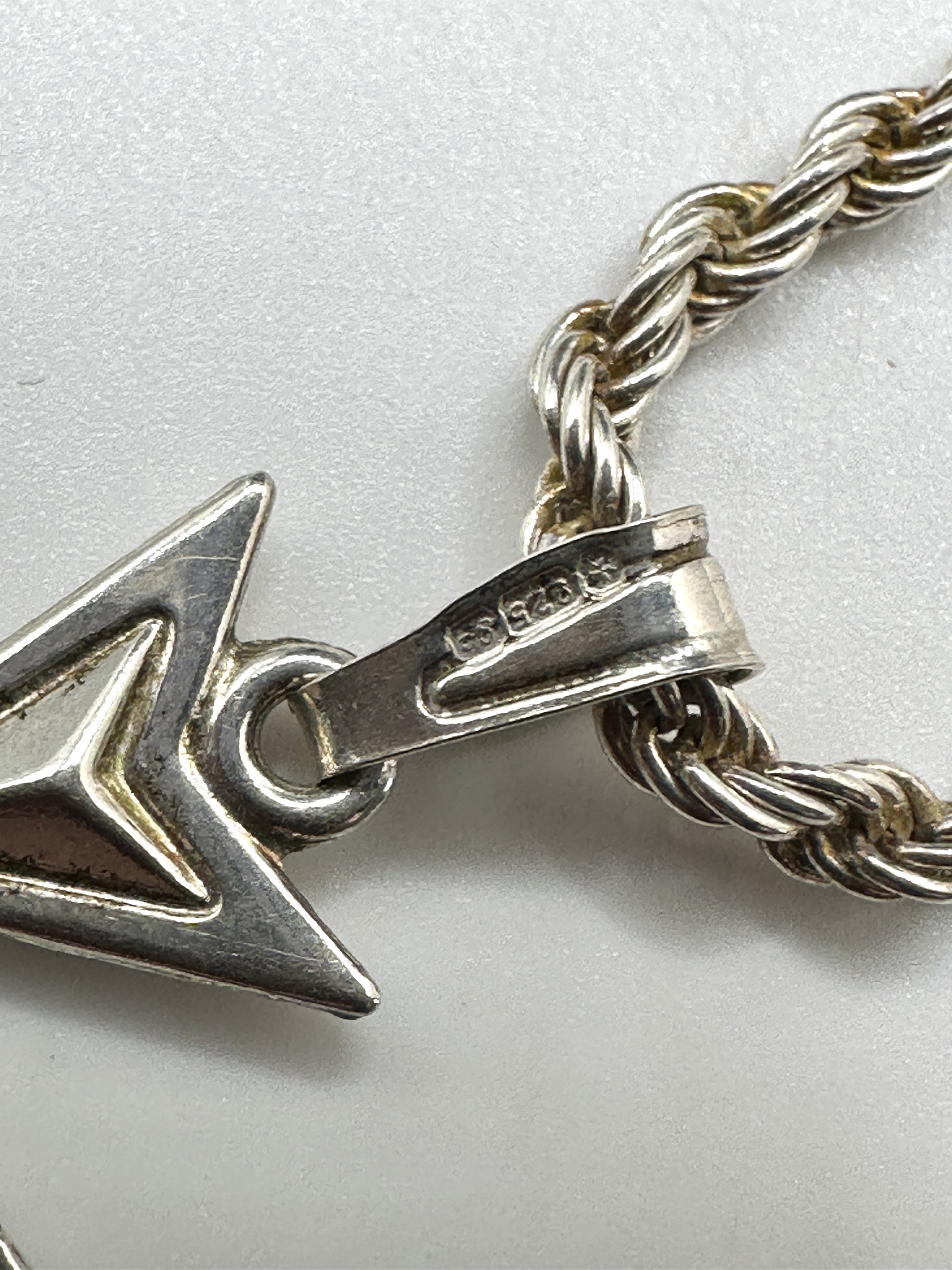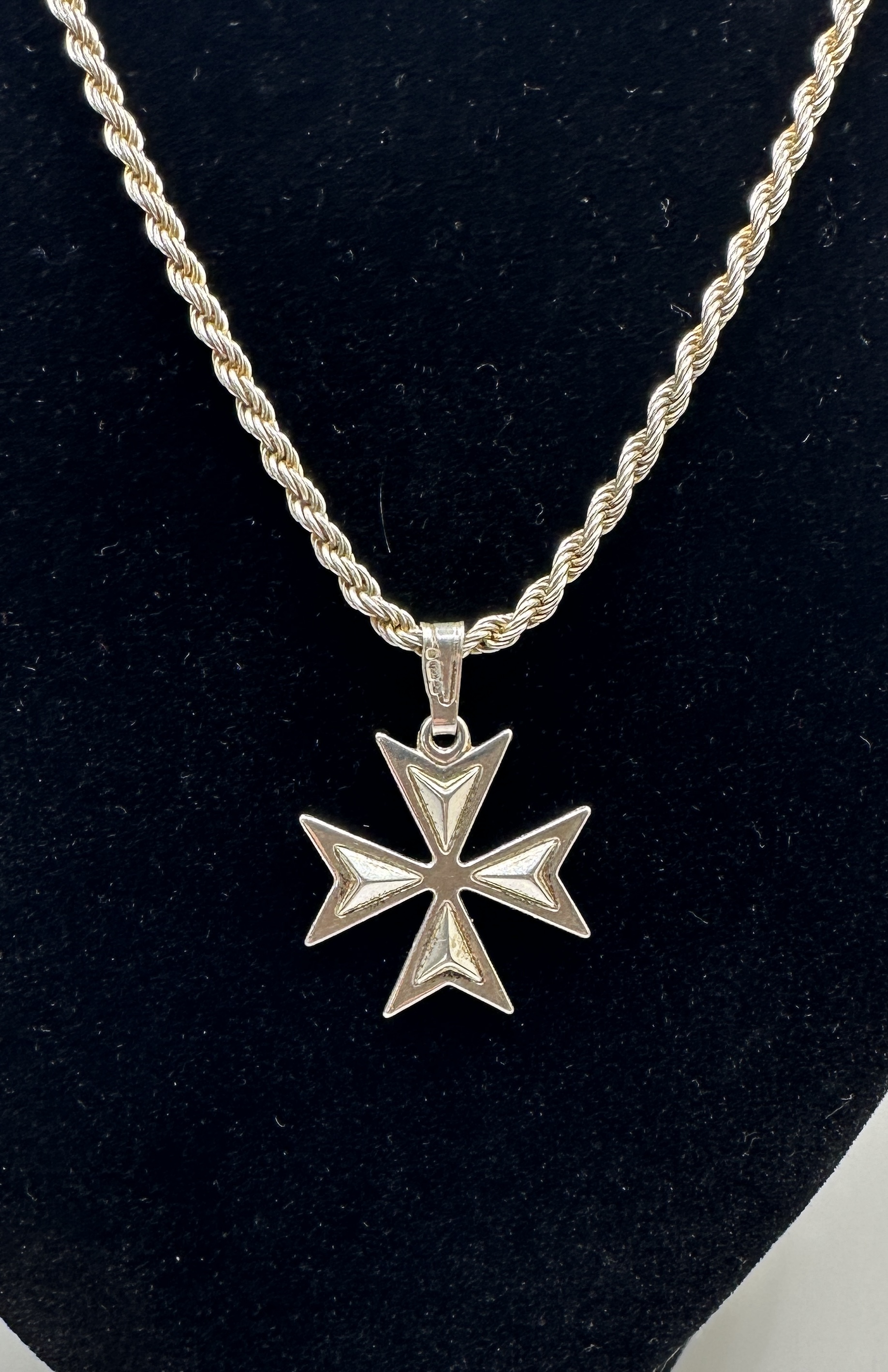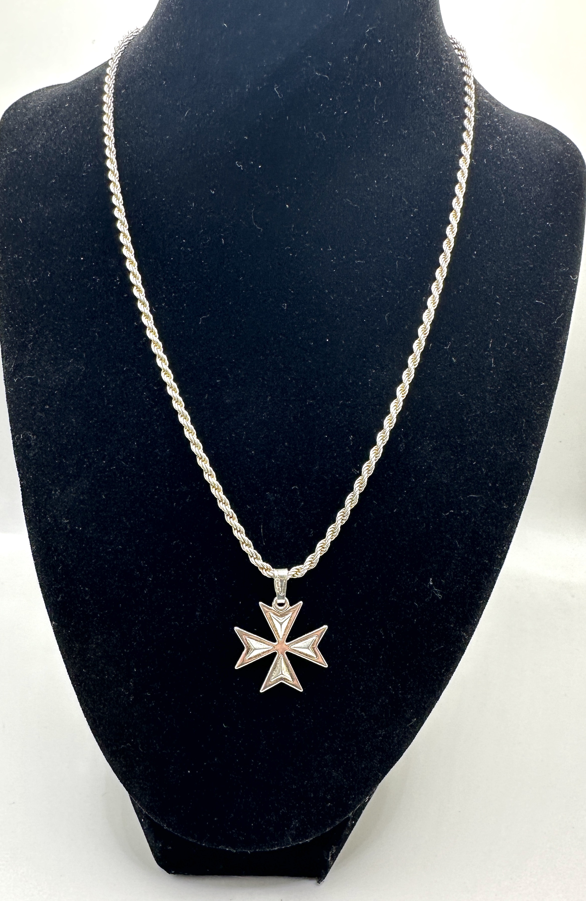 This lot presents a necklace featuring a classic Maltese Cross pendant crafted from 925 silver, as verified by the hallmark clearly visible on the bail. The pendant is suspended from a matching silver-toned twisted rope chain. The design features four pointed arms, characteristic of the Maltese Cross, with a polished finish on the raised surfaces and recessed areas providing depth.