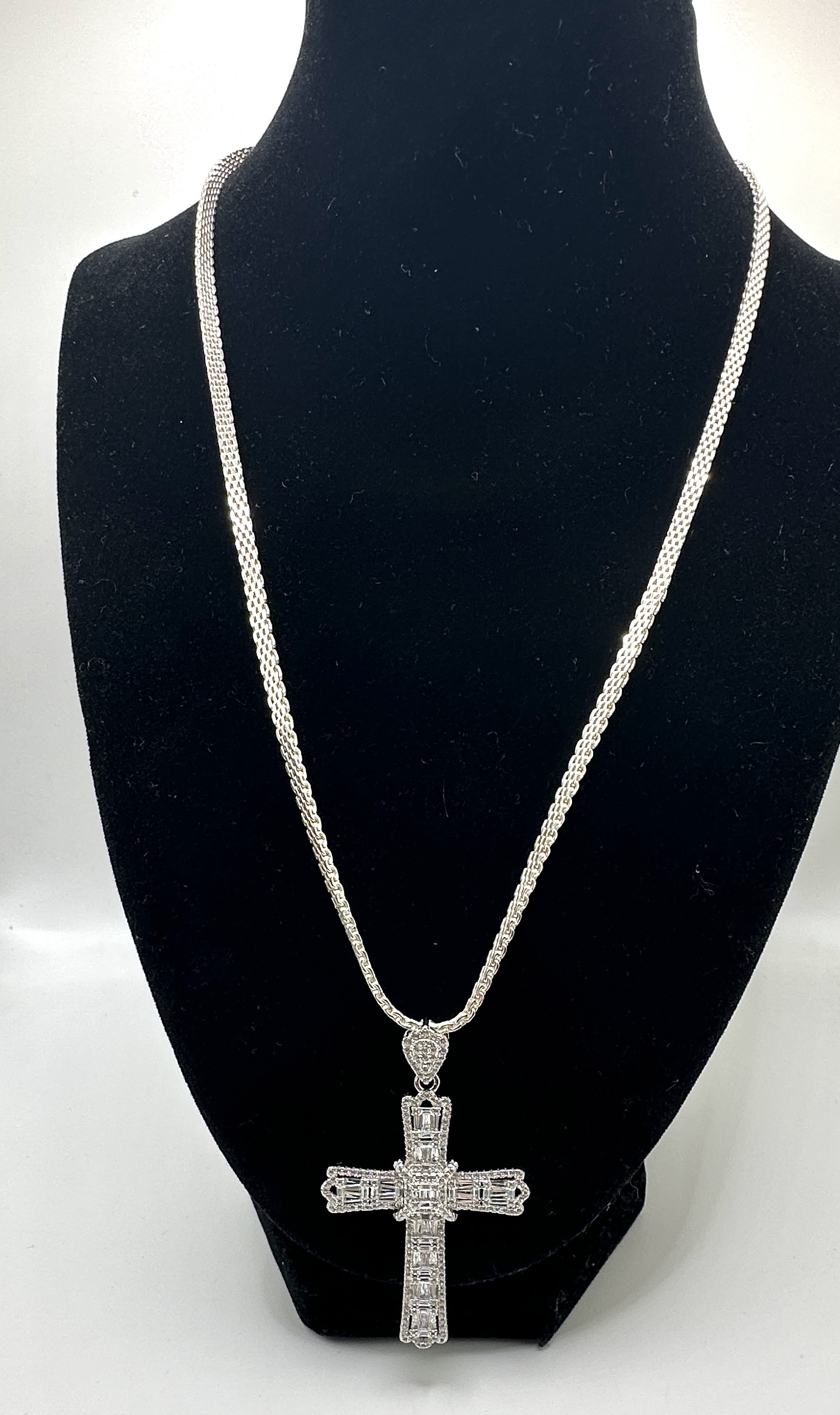 A substantial sterling silver necklace featuring a tightly woven flat link chain and a large, ornate cross pendant. The pendant is entirely covered in clear, colorless simulated stones, primarily utilizing baguette cuts arranged in vertical and horizontal rows to create a highly reflective ‘iced out’ appearance. The clasp is clearly marked 925, confirming sterling silver purity, and ITALY, indicating its origin. The design is consistent with contemporary jewelry styles.