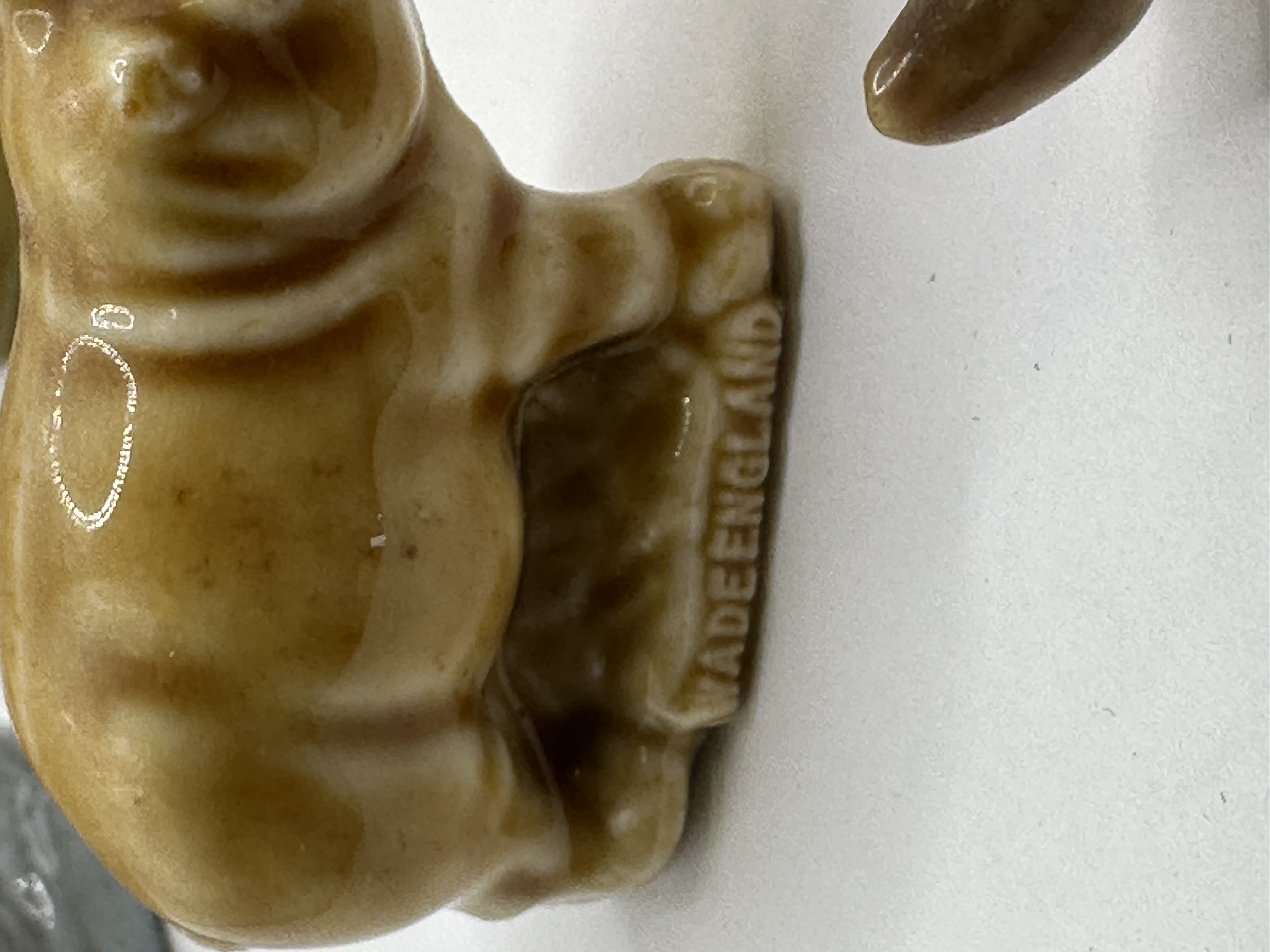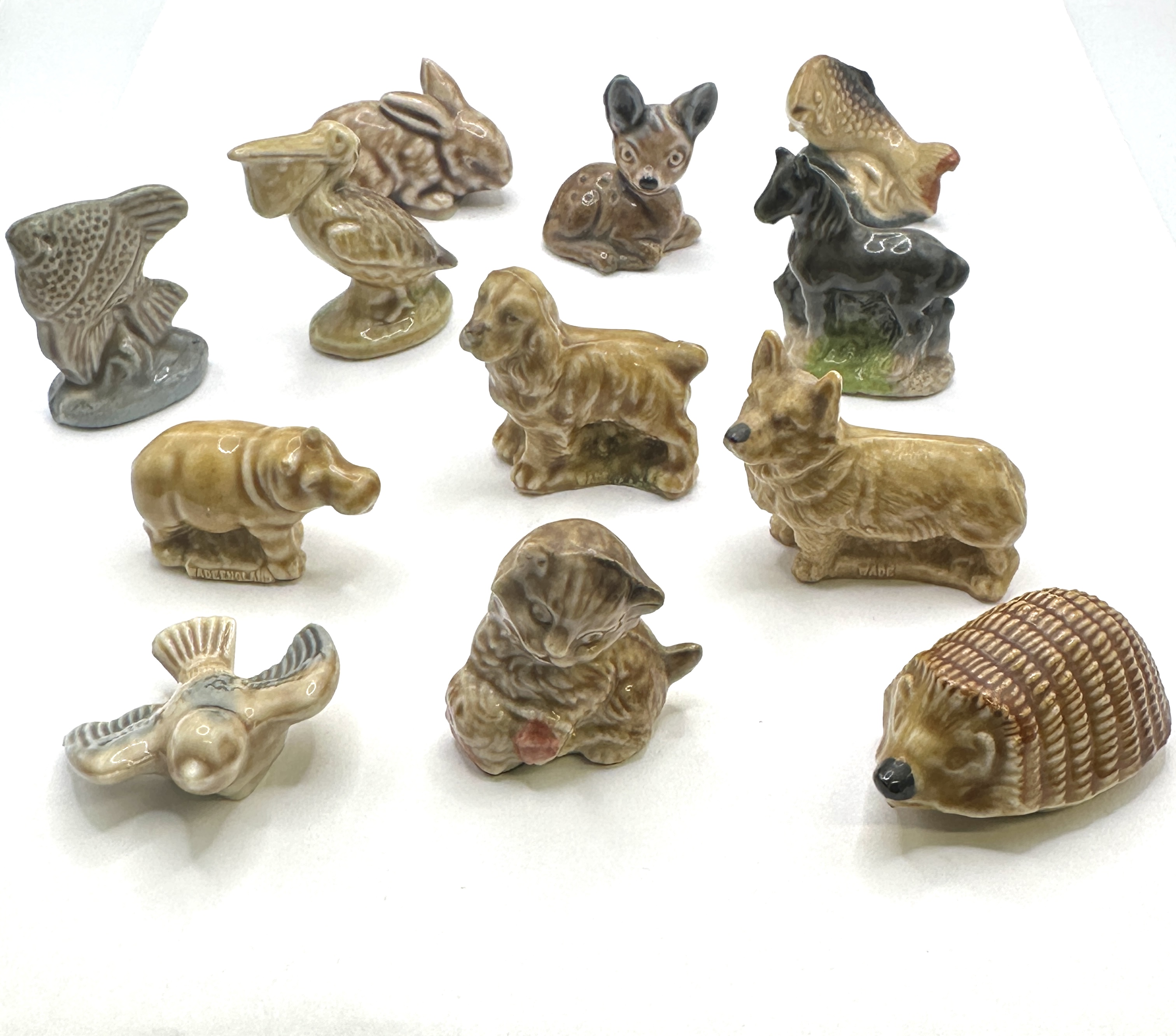 A collection of twelve miniature wade ceramic animal figurines, commonly known as Wade Whimsies. These figures were manufactured by Wade England, often distributed as promotional items, notably through Red Rose Tea in North America. The lot includes a variety of wildlife and domestic animals, finished predominantly in a glossy, mottled tan and brown glaze, with some pieces featuring black or grayish-green accents. Specific figures present include a hedgehog, a hippopotamus, a pelican, a rabbit, a fawn or deer, two distinct fish models, a black horse, a Corgi dog, a small flying bird, a sheep or similar quadruped, and a seated kitten. Several pieces bear the impressed mark “WADE ENGLAND” or “WADE” on the base, confirming attribution.