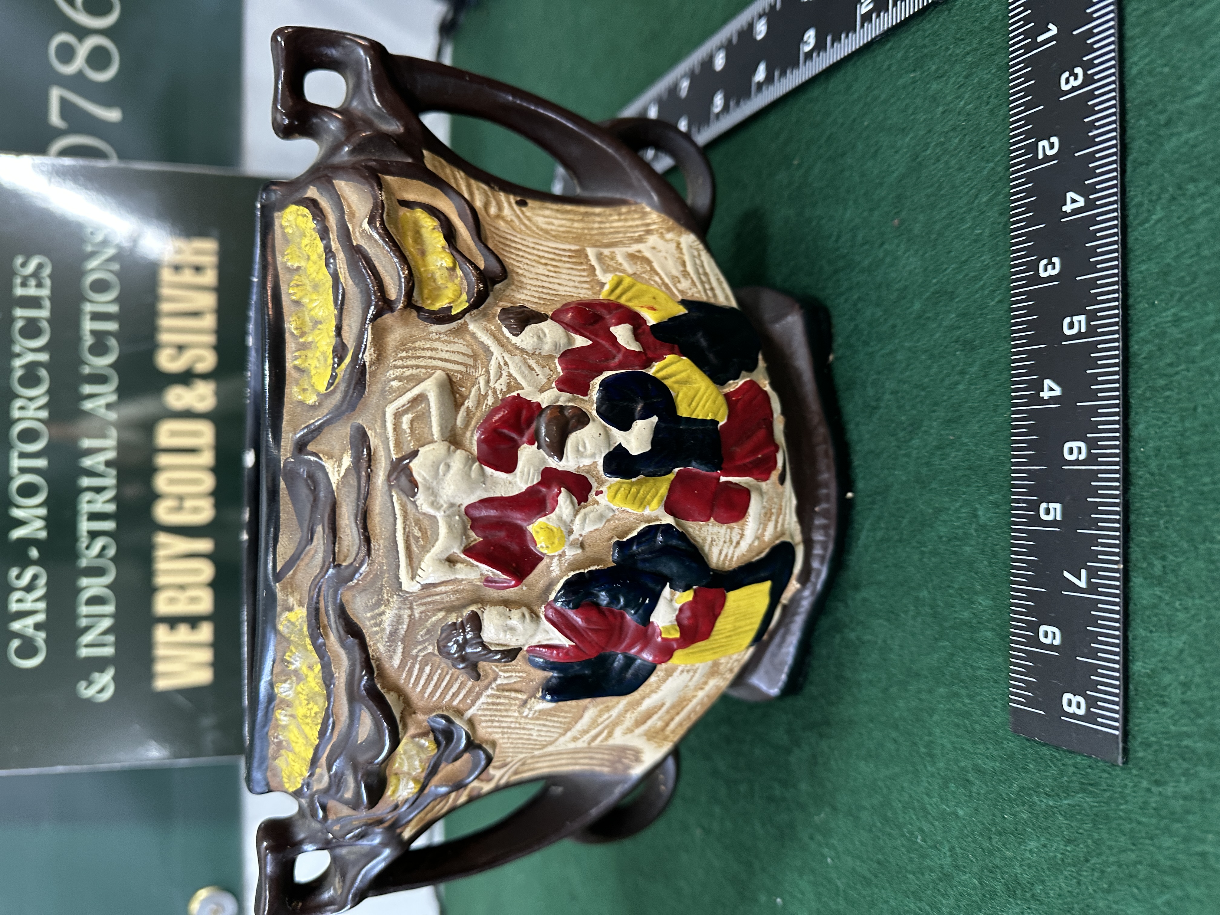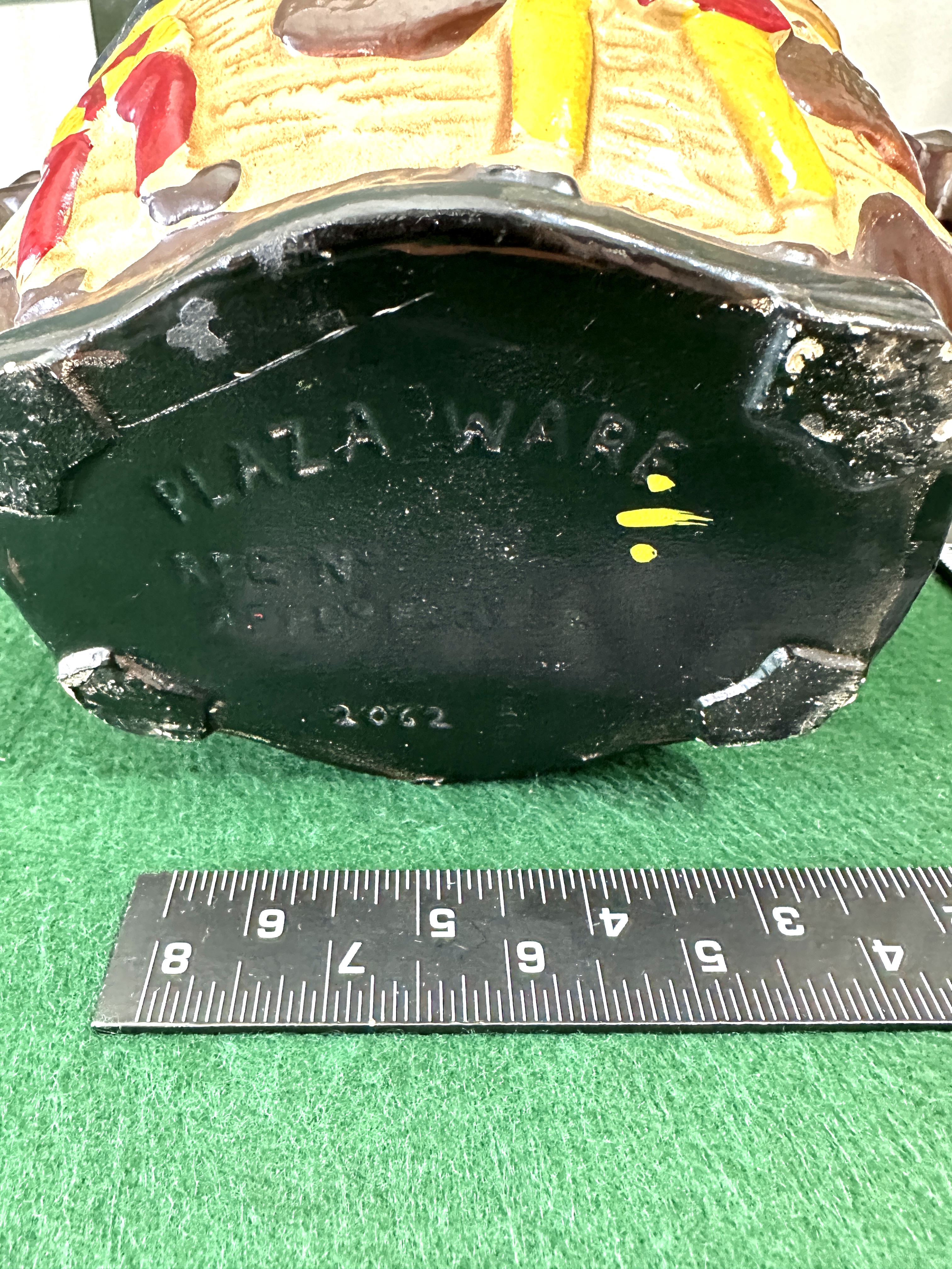 This is a decorative ceramic bowl or planter manufactured by Plaza Ware, identified by the stamp on the underside. The piece features a high-relief design with integrated handles, depicting stylized figures in traditional dress, likely representing an Asian or Japanese scene. The body is finished in tan and dark brown glazes with figures highlighted in deep red, yellow, and black. The base is finished in a glossy black glaze.