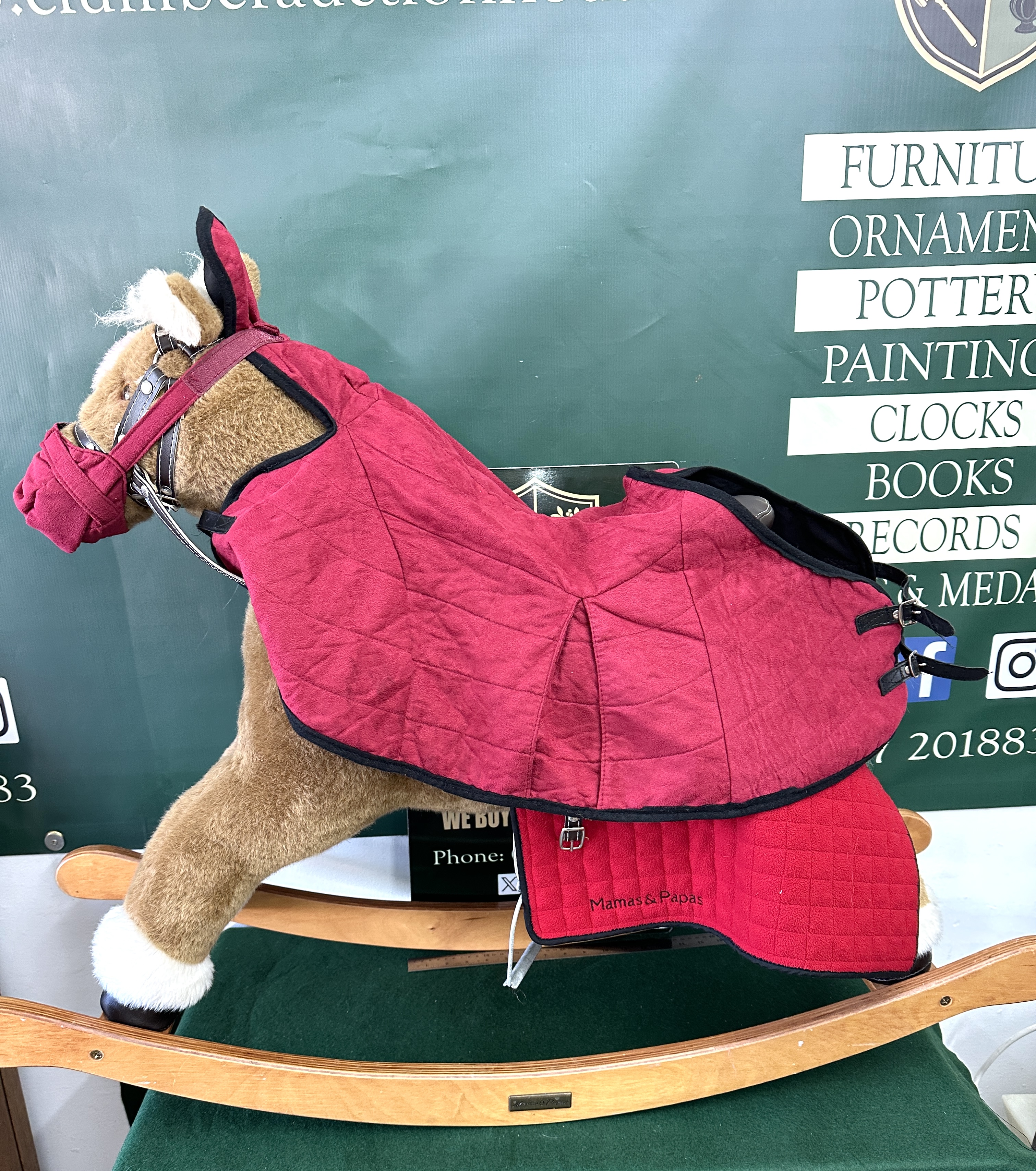 This is a classic children’s rocking horse manufactured by Mamas & Papas. The item features a plush faux fur body in brown and tan with white mane, tail, and ‘socks’. It is fitted with faux leather tack, including a saddle, bridle, and stirrups, and is presented with additional accessories including a matching red quilted horse rug and saddle pad, both bearing the manufacturer’s logo. The horse is mounted on a curved wooden rocker base designed for manual operation.