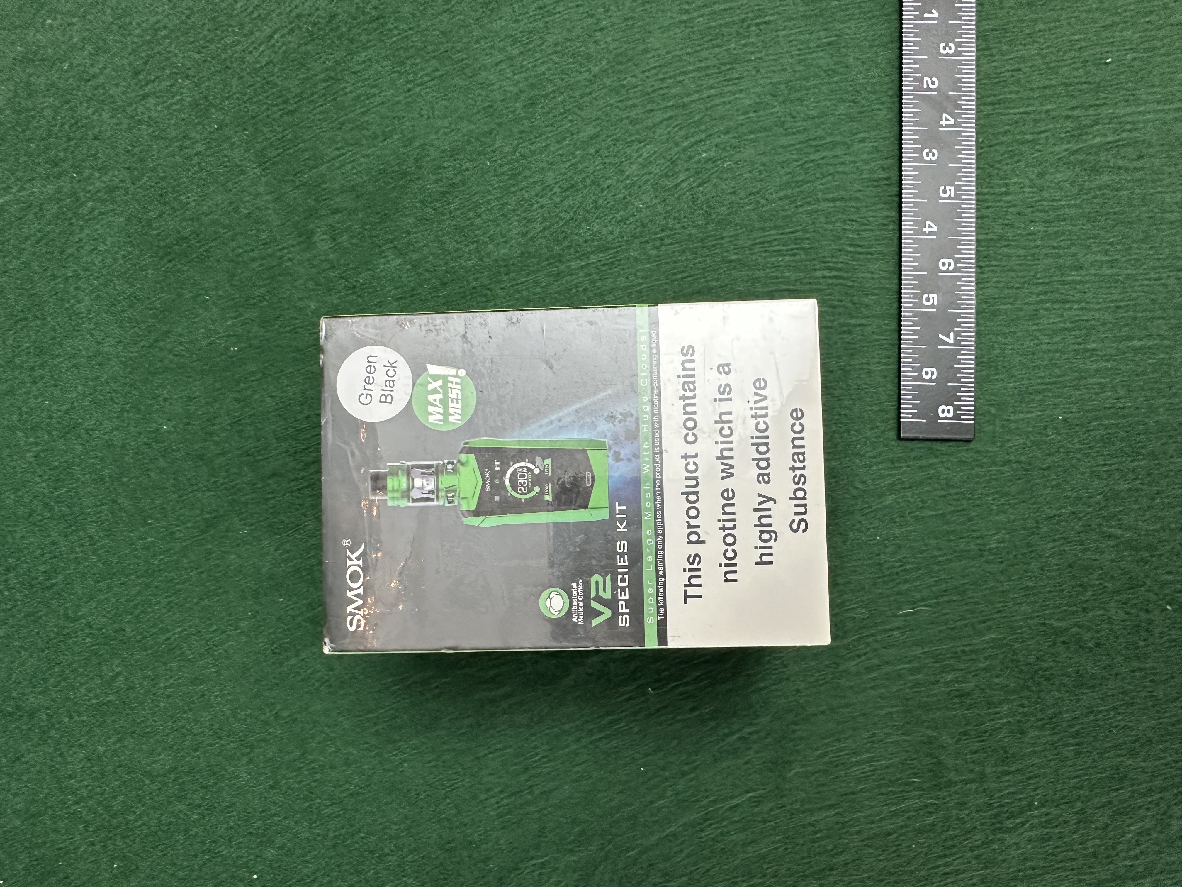 This lot comprises a commercially packaged SMOK V2 SPECIES KIT, advertised as having a 230W MAX MESH capability. The packaging indicates the device color is Green Black. The item is sealed in its original retail packaging. This item is not a motor vehicle and is being catalogued as a non-automotive accessory or memorabilia item.